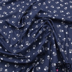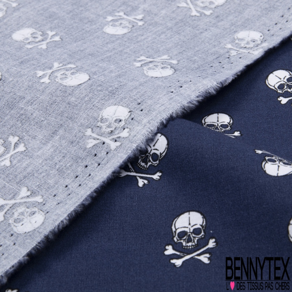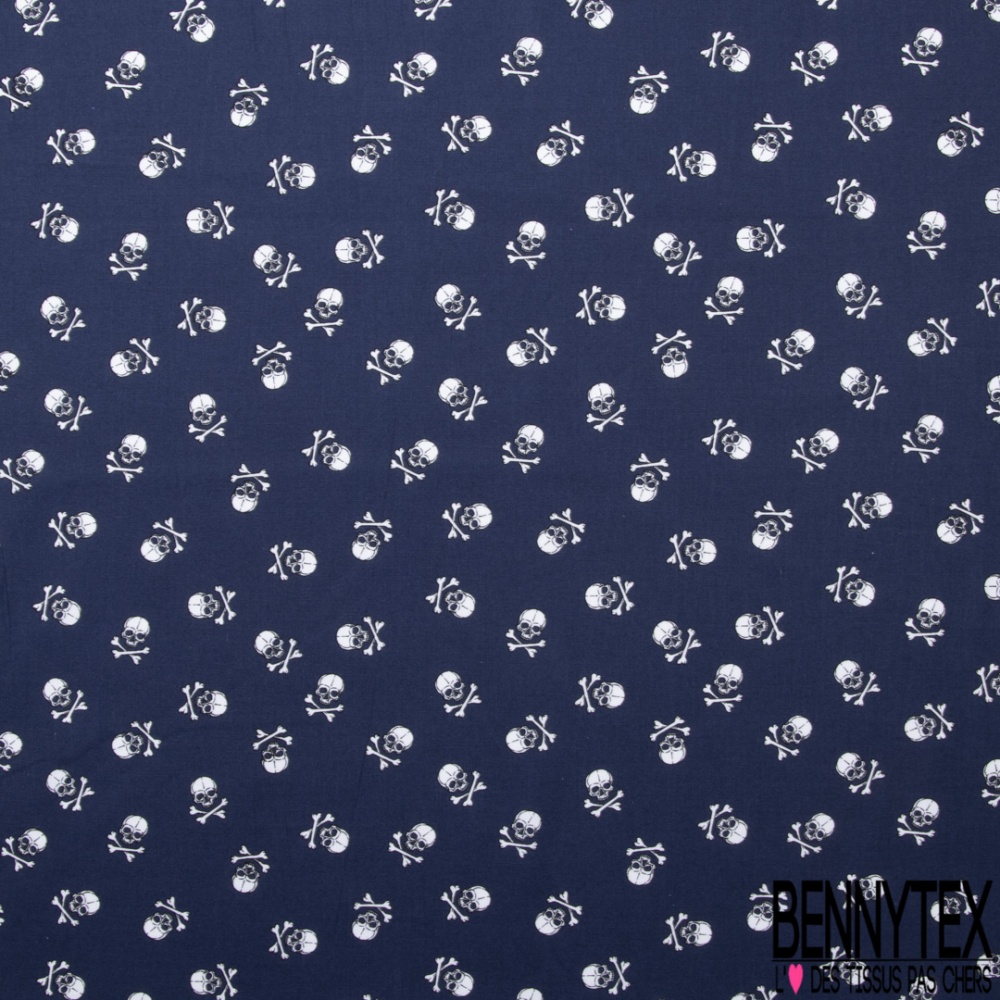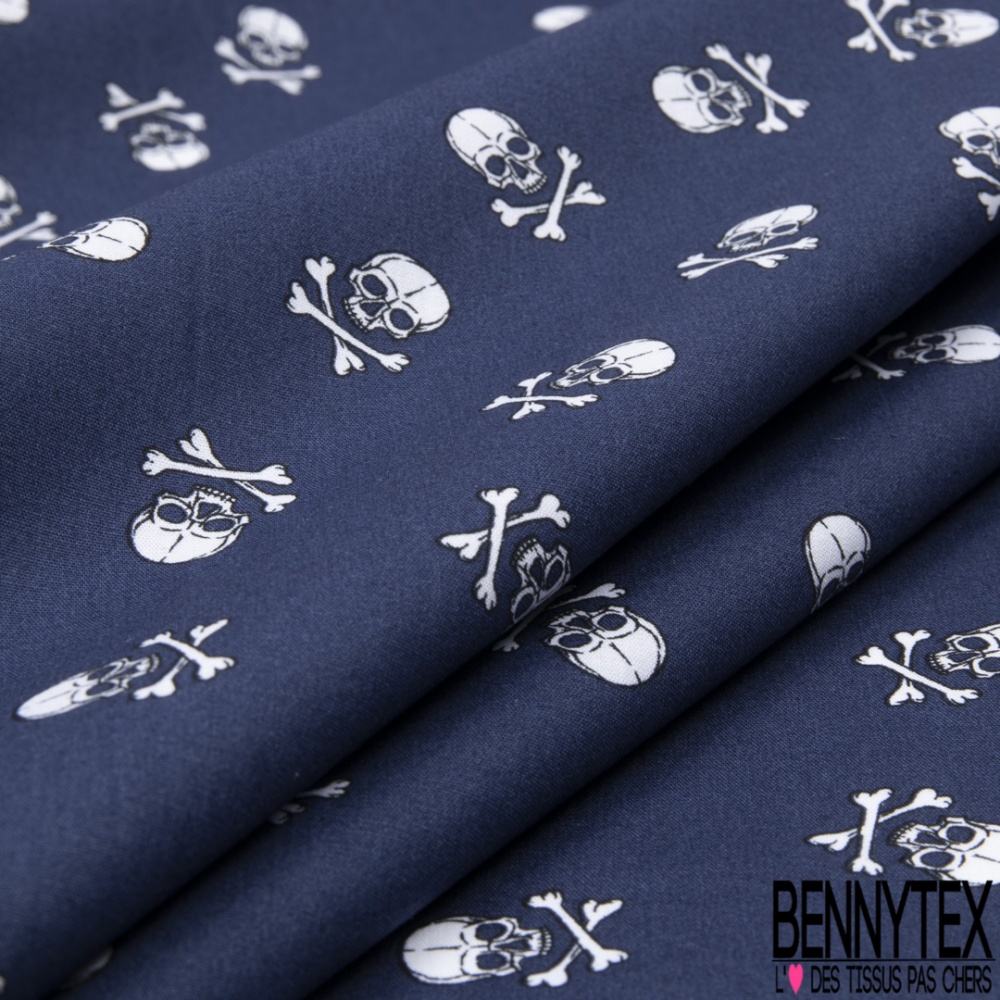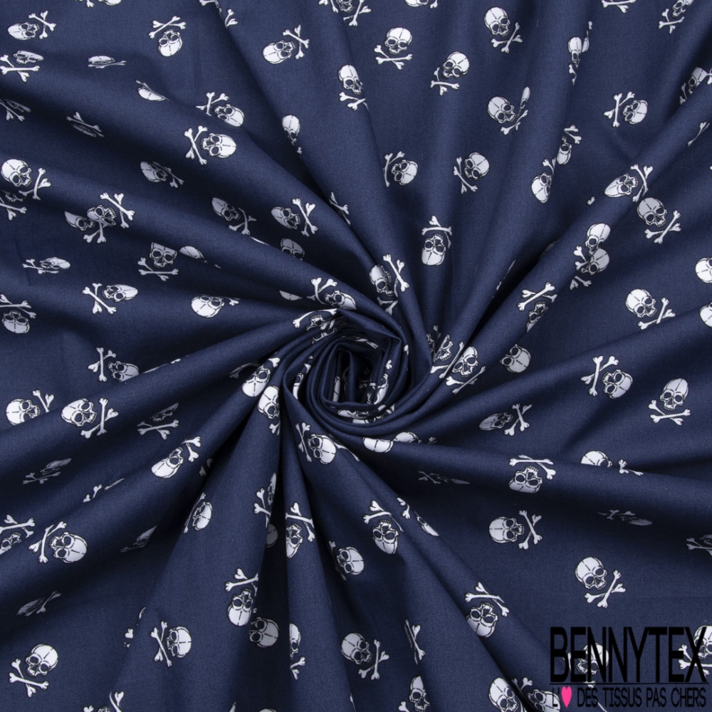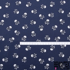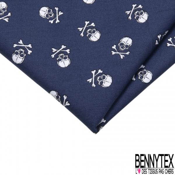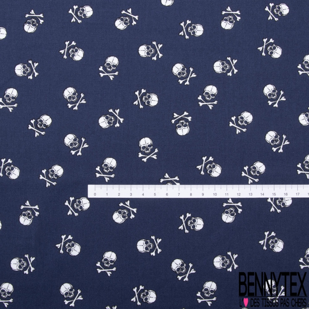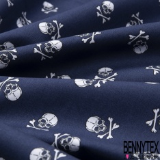 Coupon 3m coton imprimé tête de mort blanche fond bleu impérial