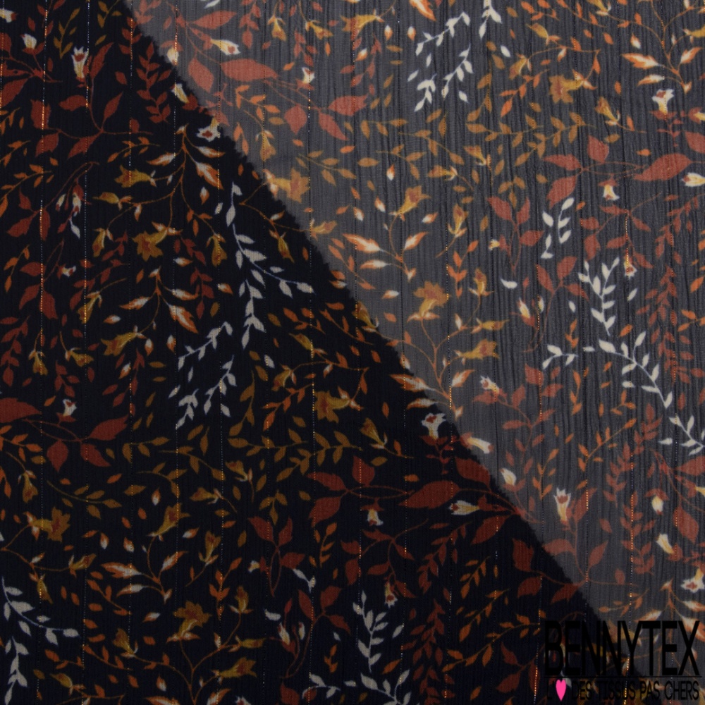 Coupon 3m mousseline polyester imprimé branchage fond marine fine rayure argent verticale