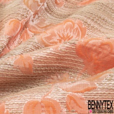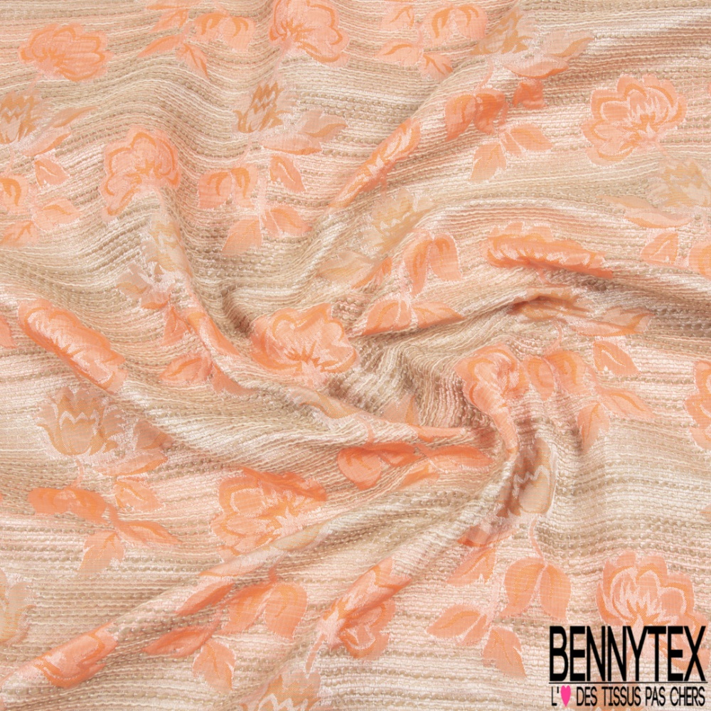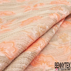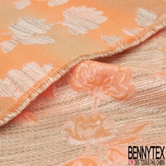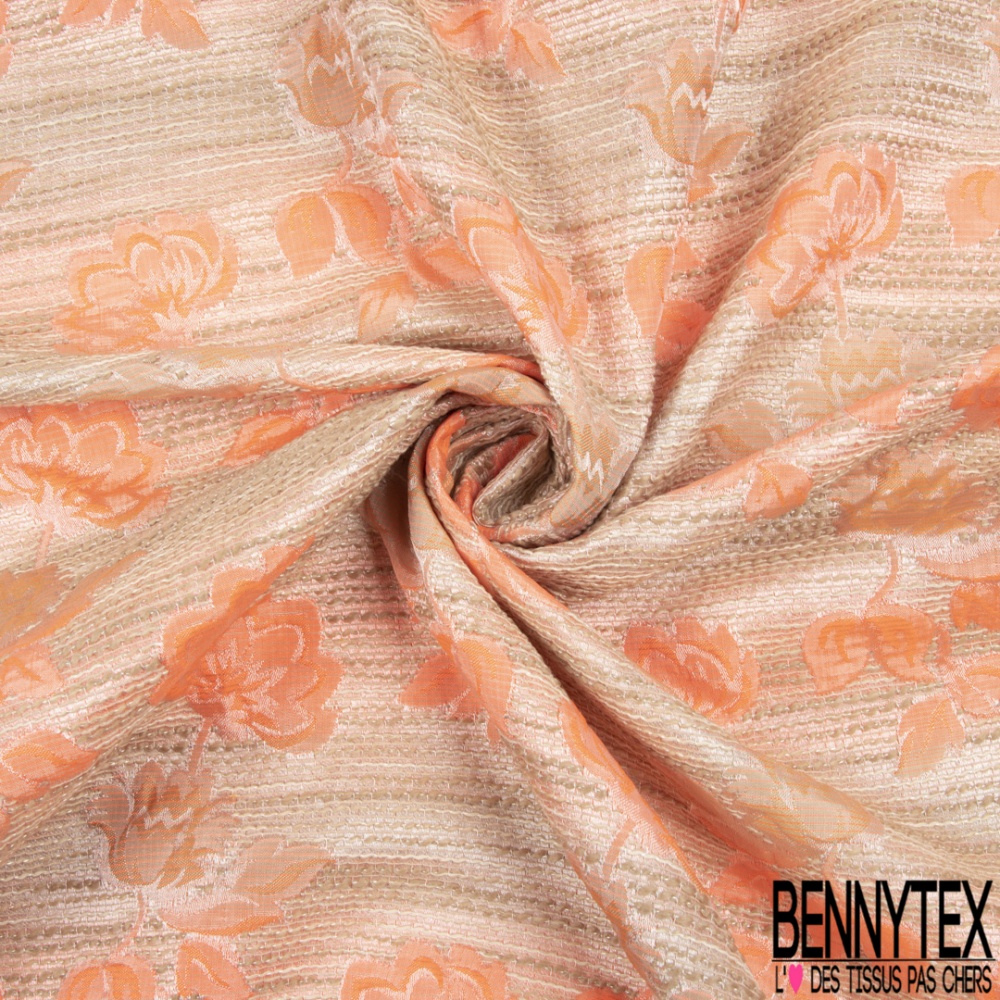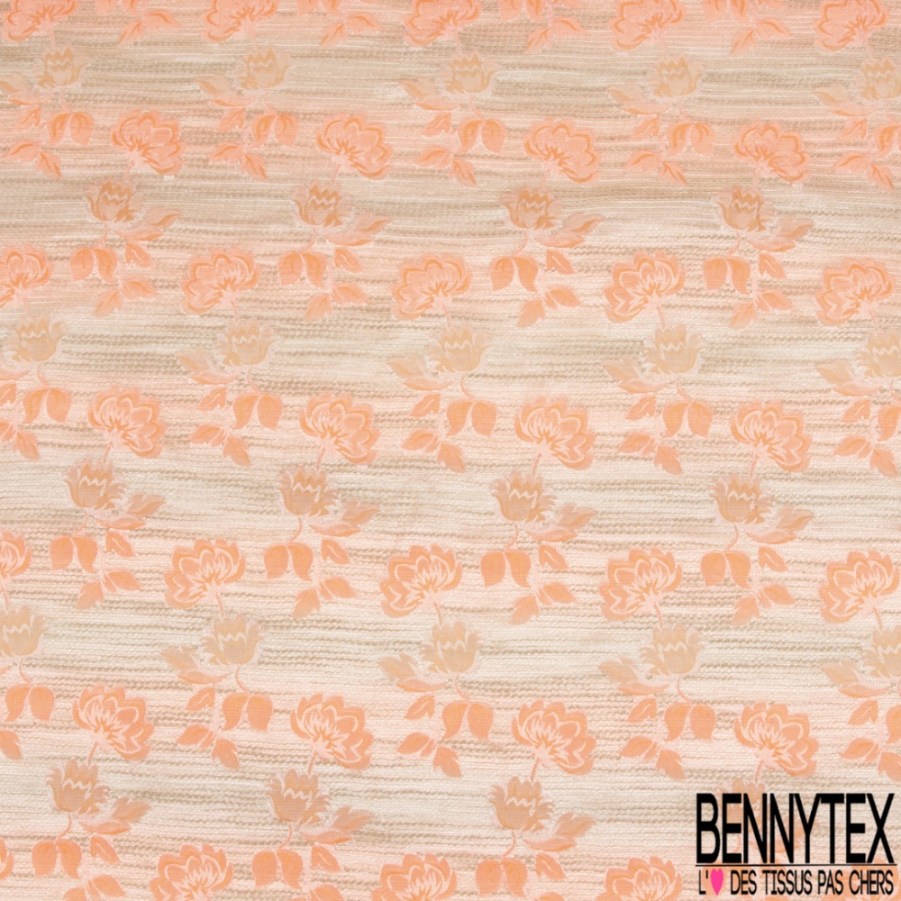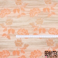 Brocart damassé coton viscose imprimé floral ton orange fluo beige blanc