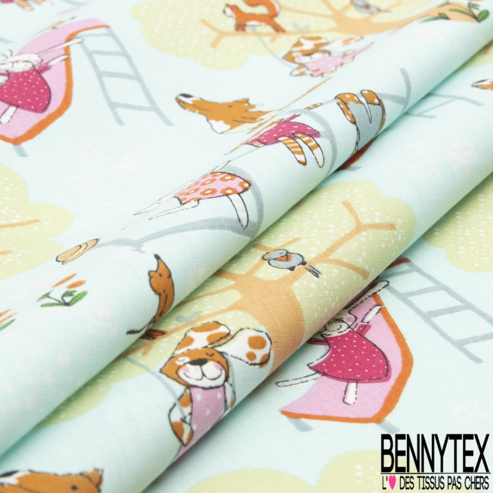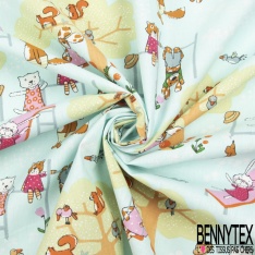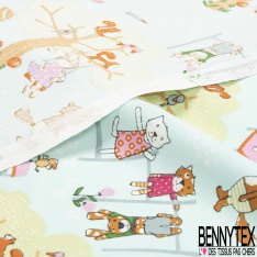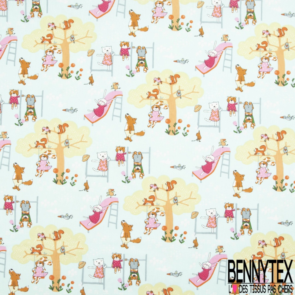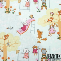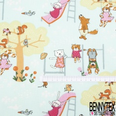 Coton Crétonne imprimé animaux rigolos au parc fond bleu glacé