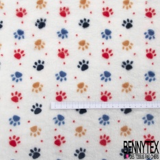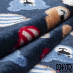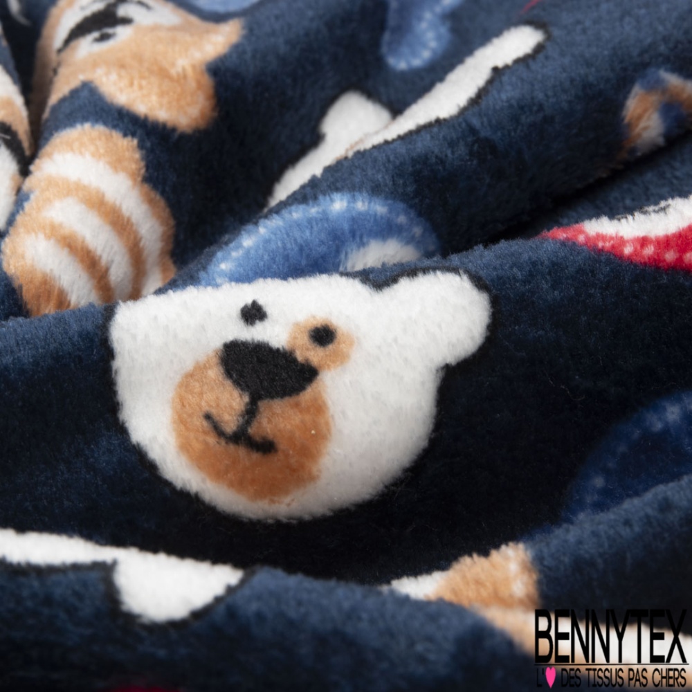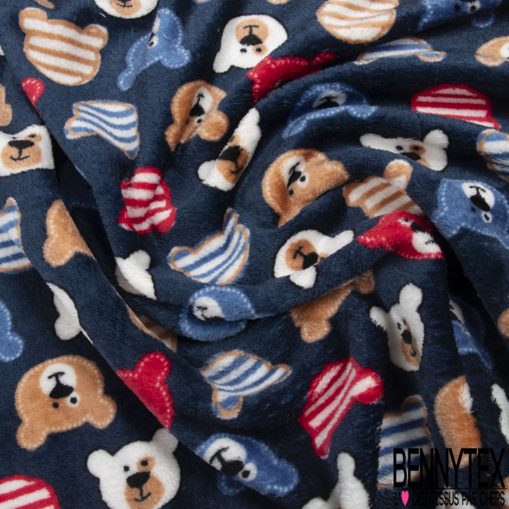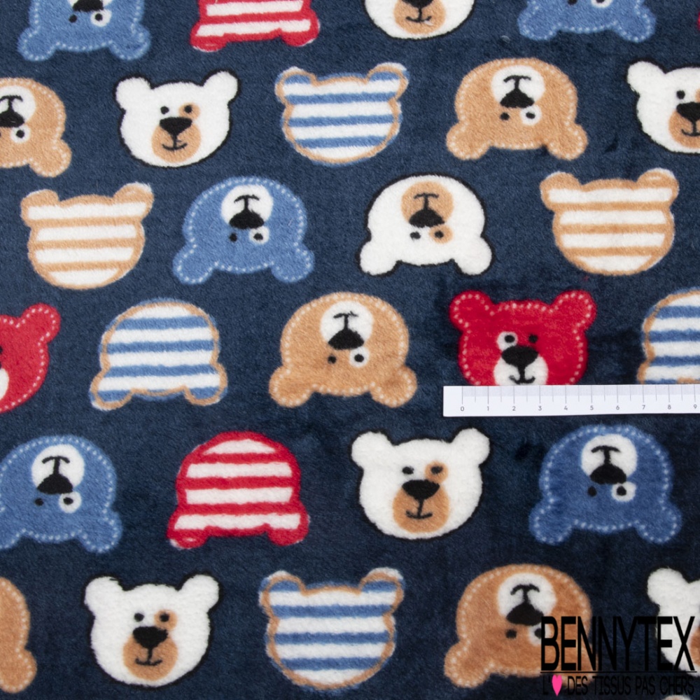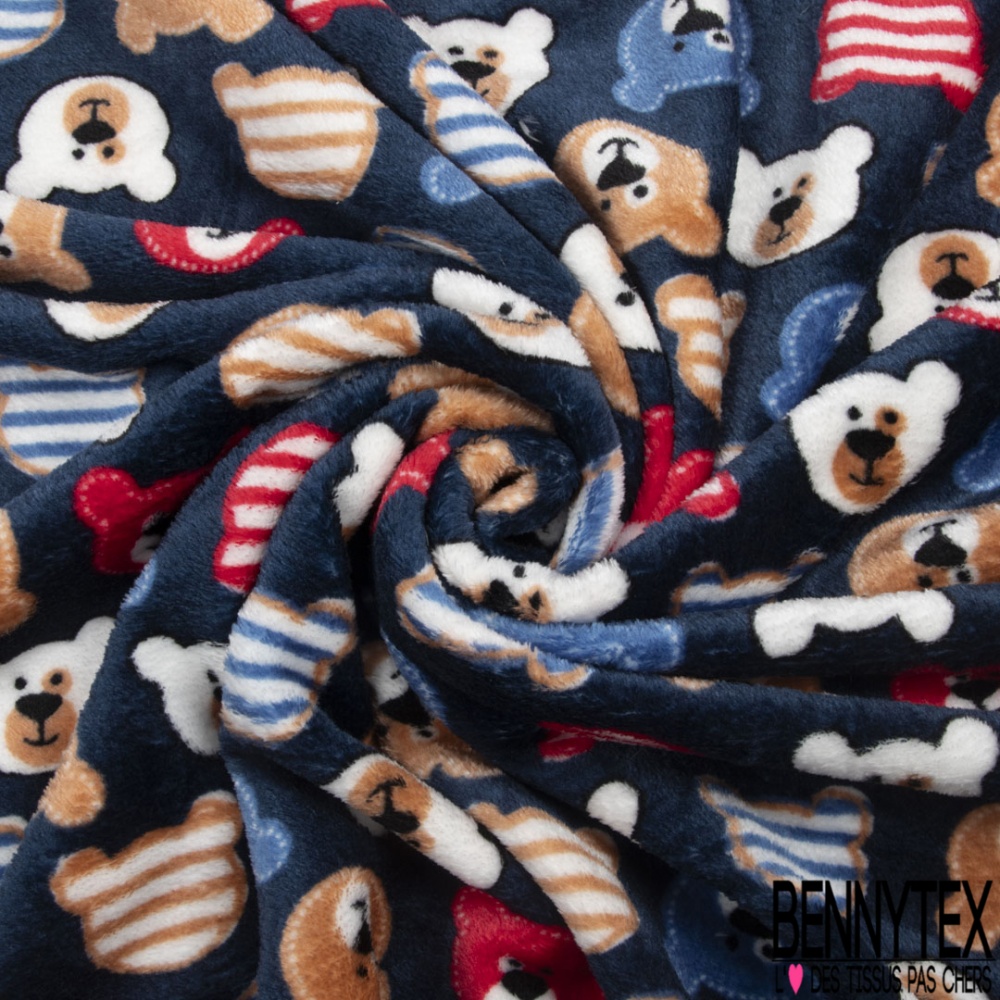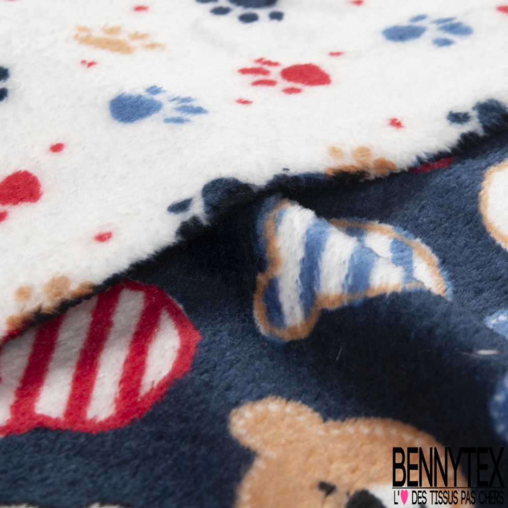 Tissu peluche imprimé double face ourson fond marine recto empreinte fond blanc éclatant verso