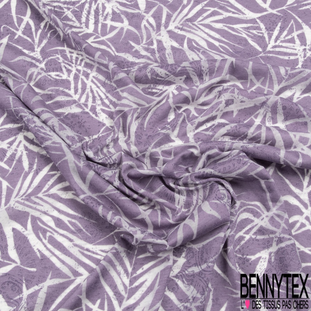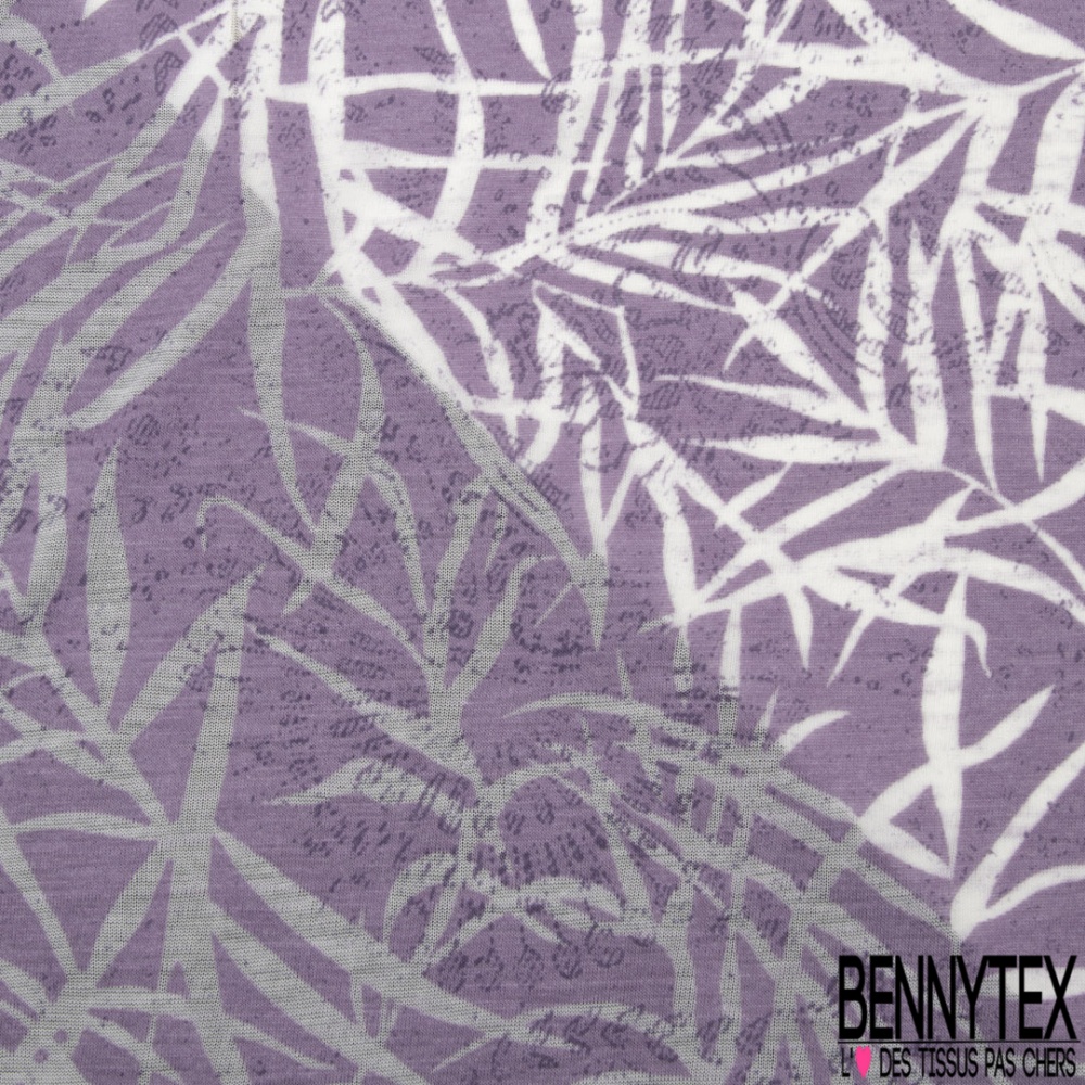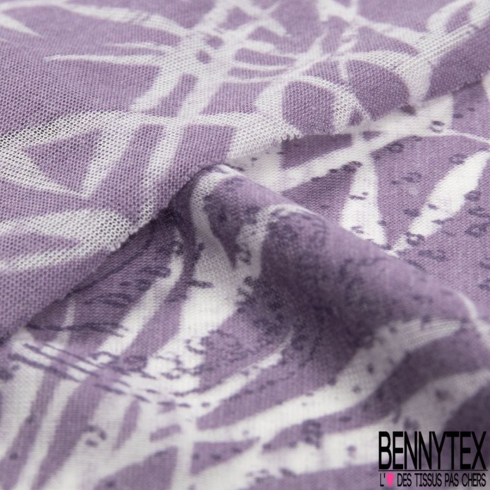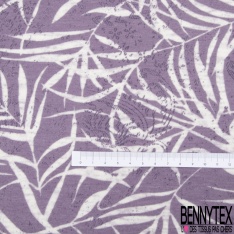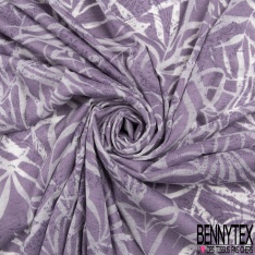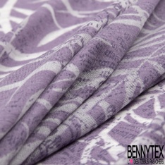 Jersey polyester fin flammé motif feuillage blanc optique fond lavande stamping estompé baroque