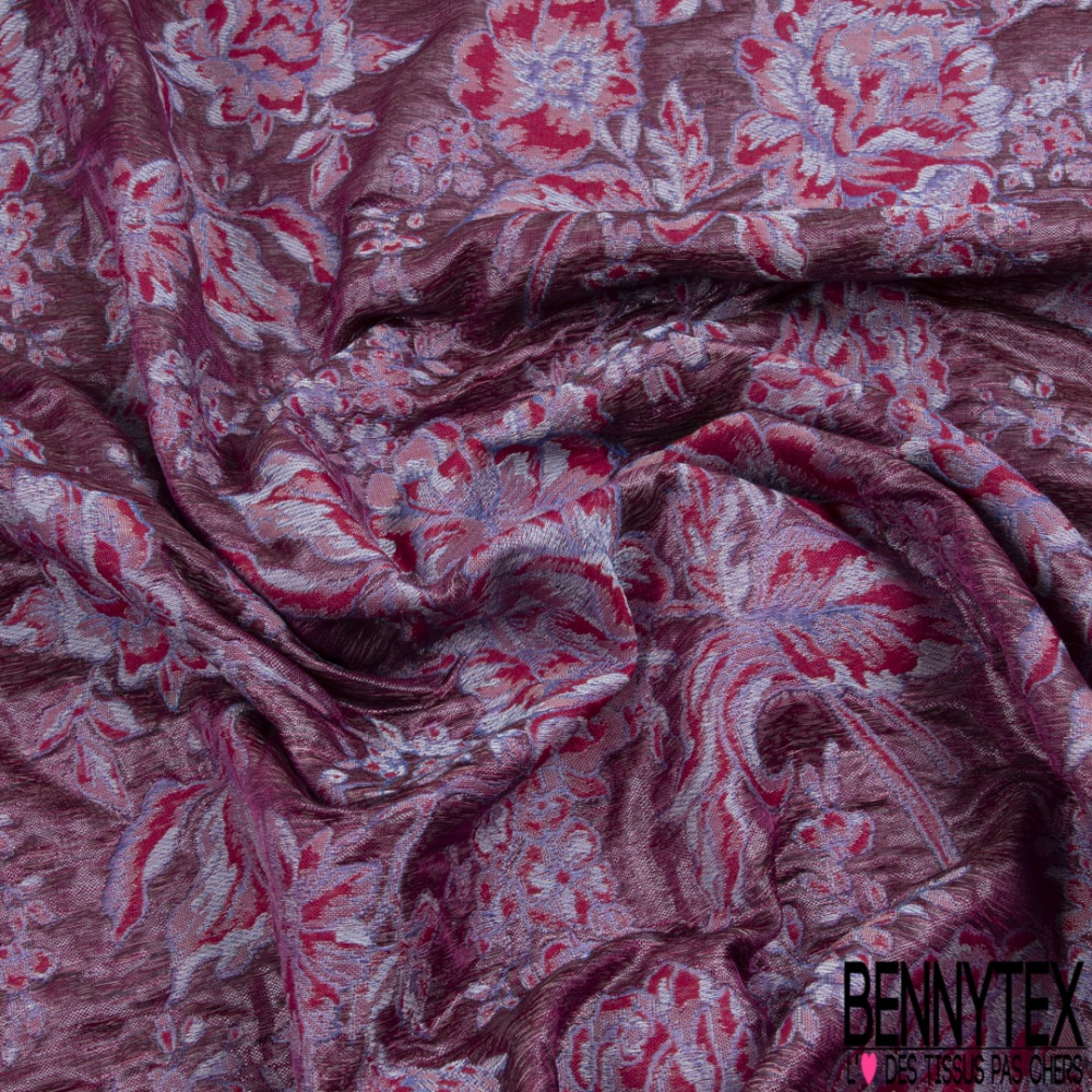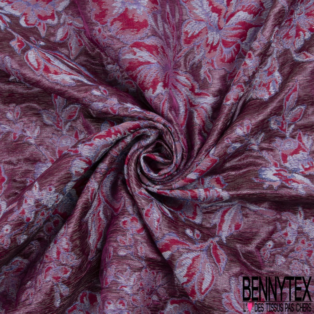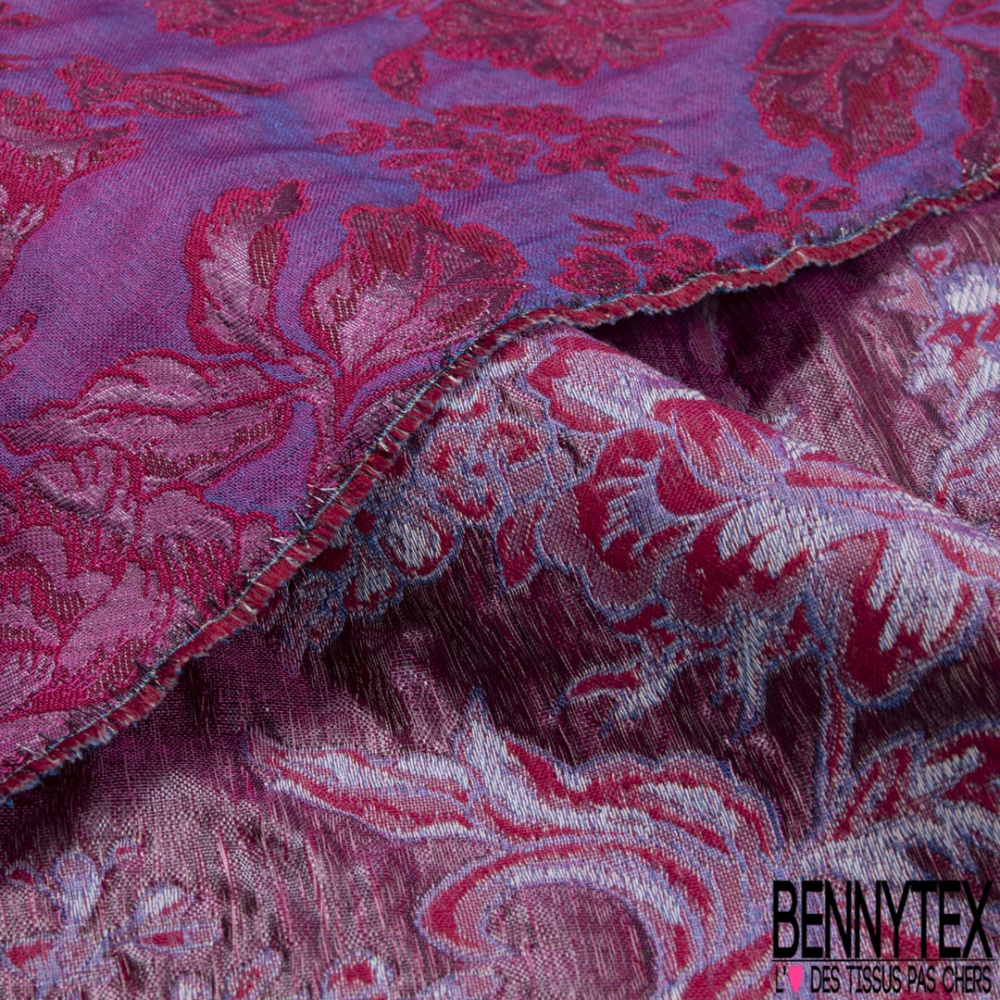 Laissez-vous tenter par notre Brocart haute couture fin couture fin fabriqué en France motif floral baroque framboise fond changeant orchidée bleu roi