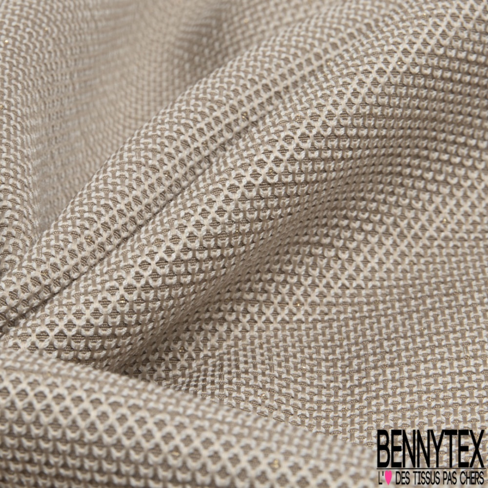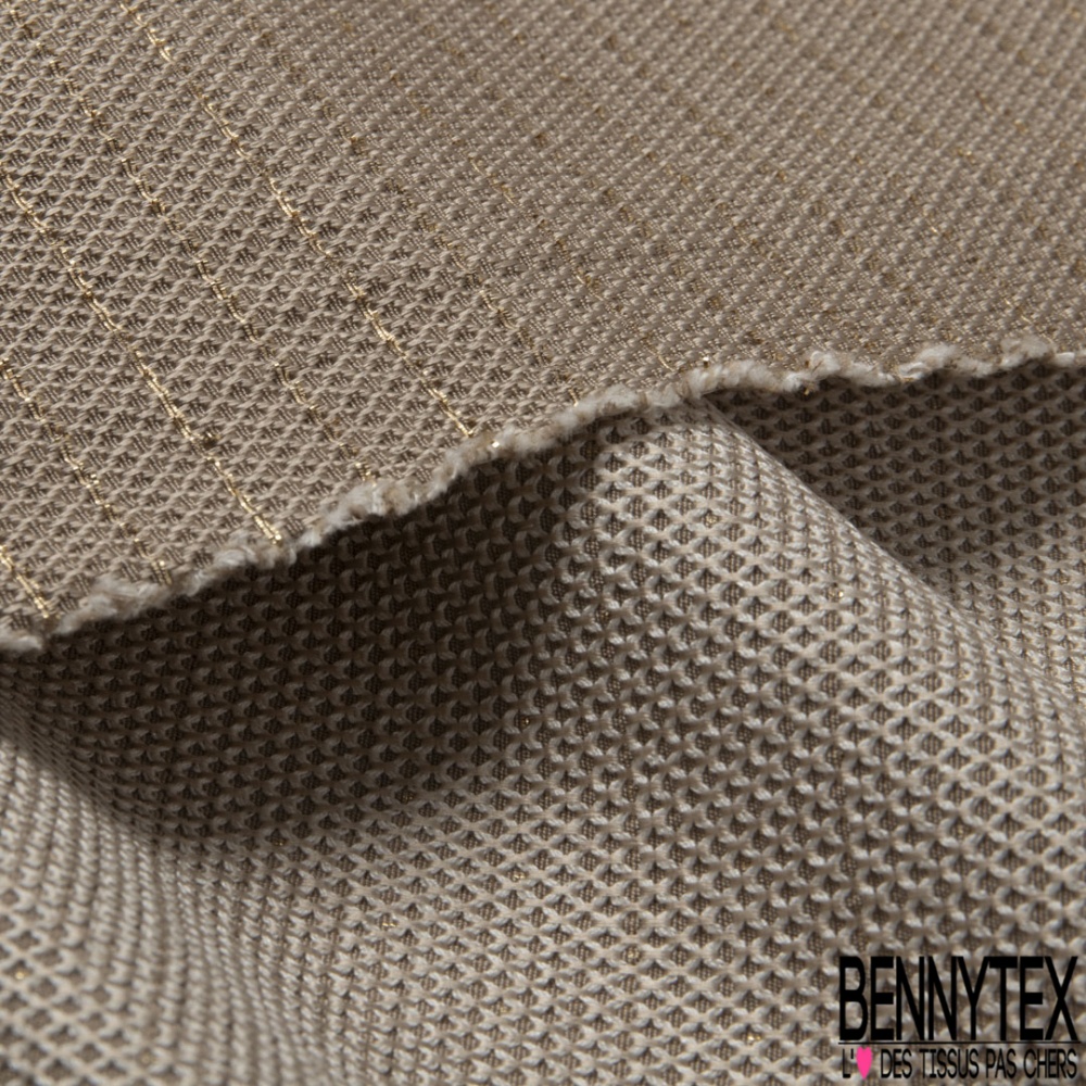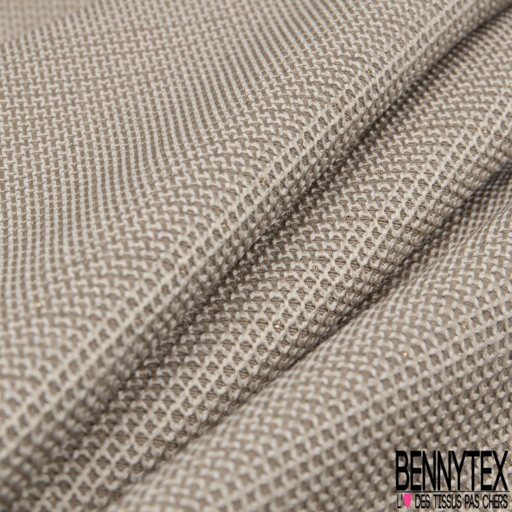 Le Jacquard motif plumetis or fond beigeest une matière à effet de tissage.