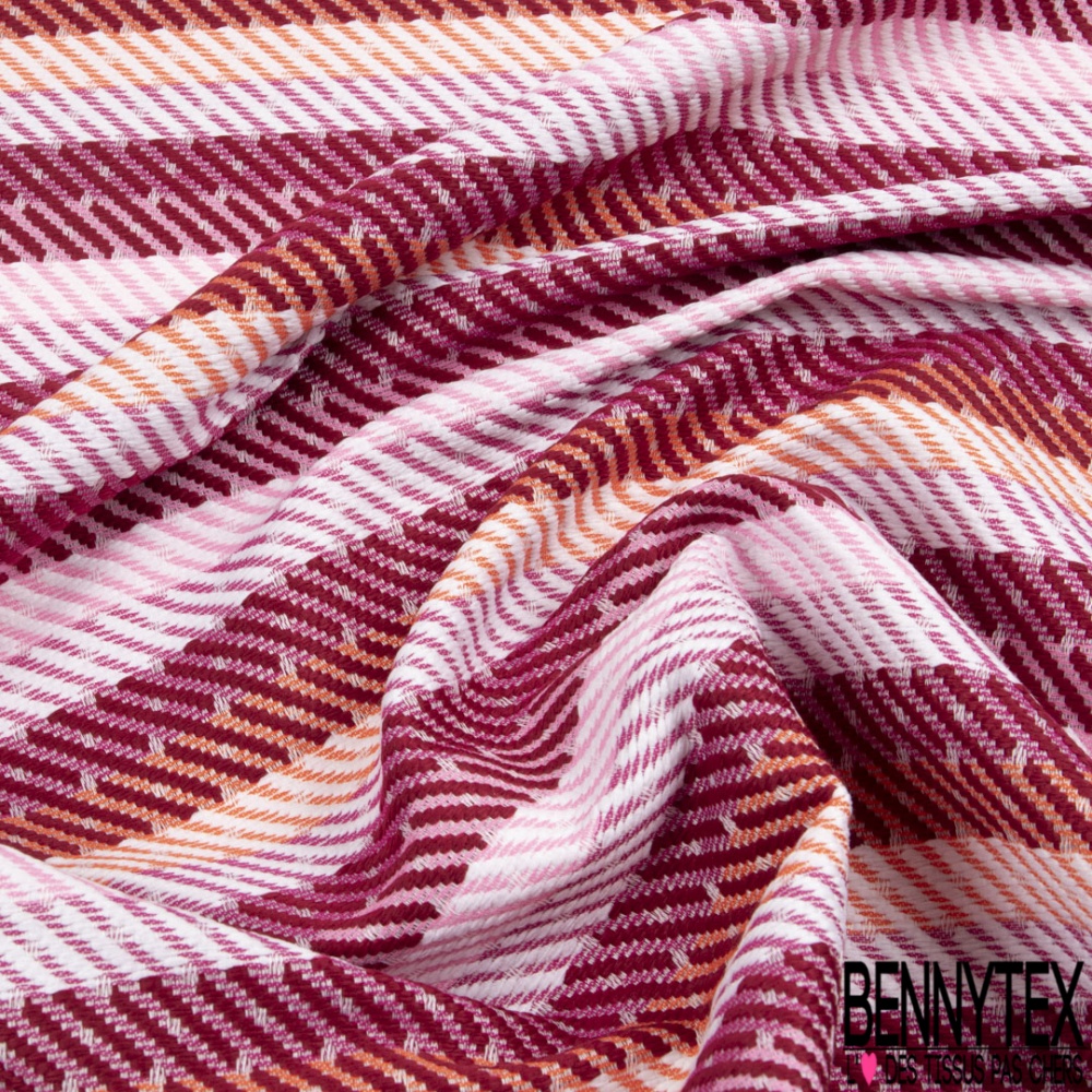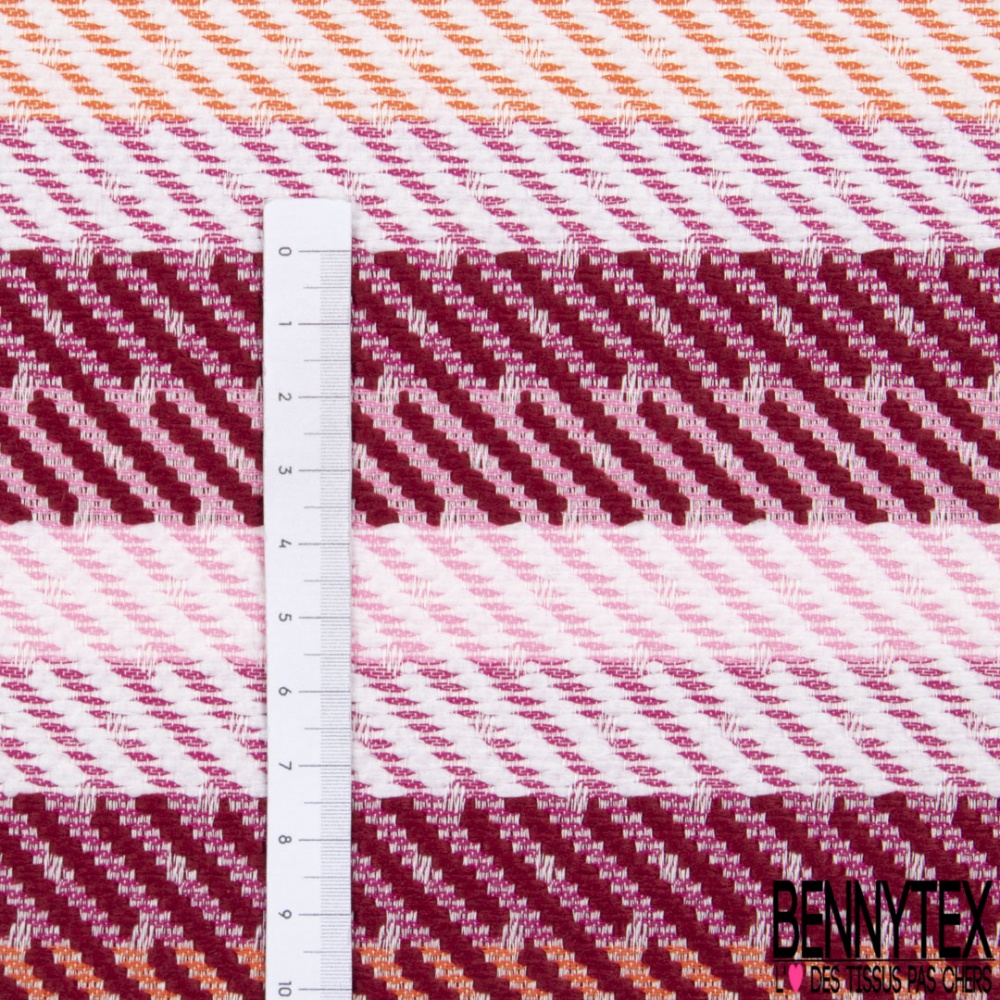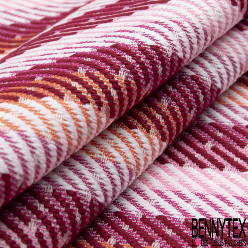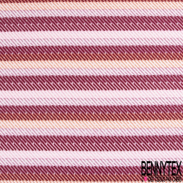 Jacquard imprimé rayure sergée horizontale bordeaux blanc optique orange rose lilas