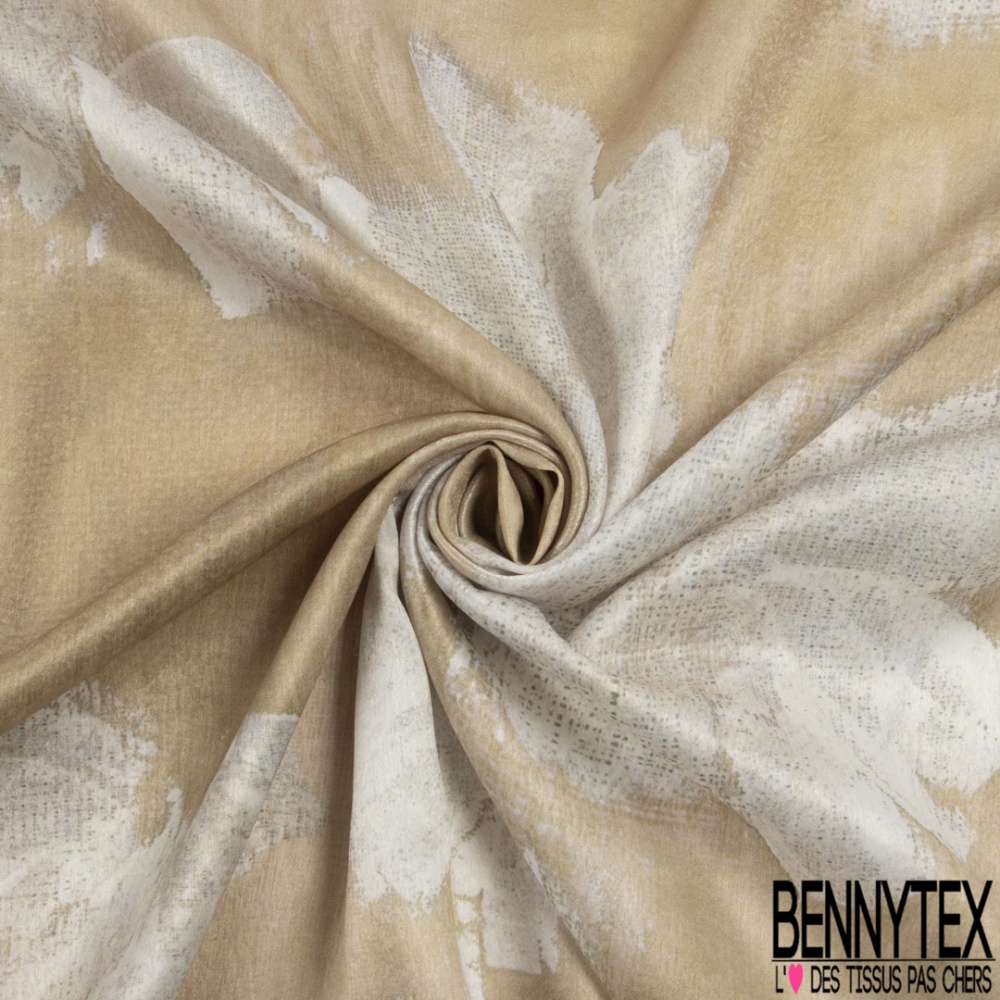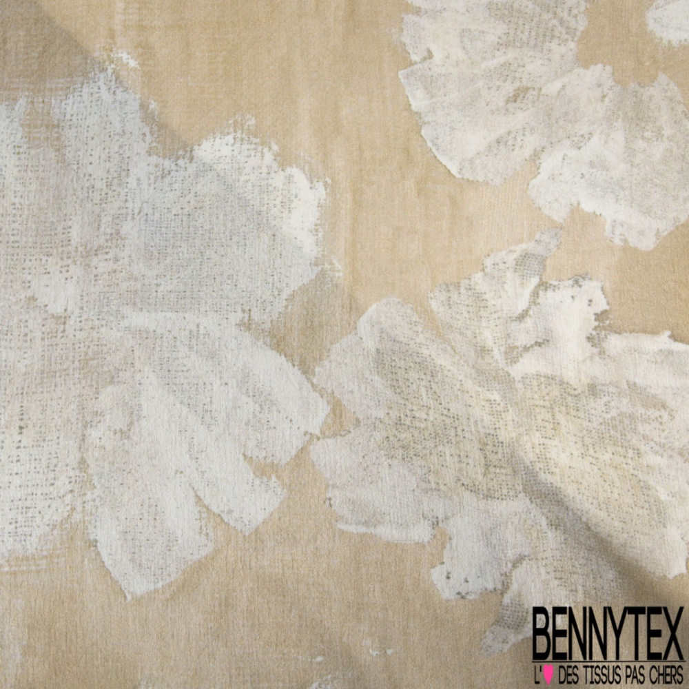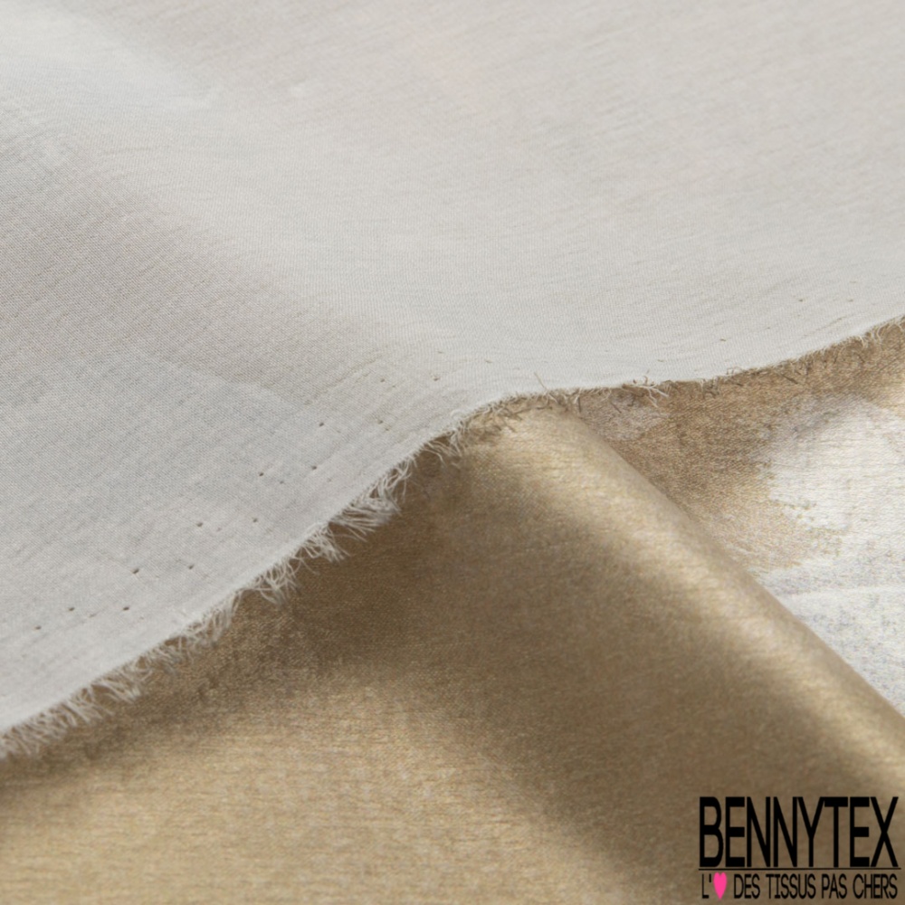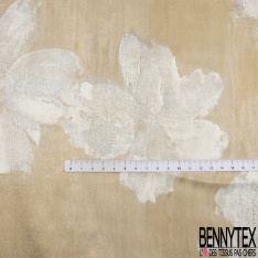 Satin polyester motif grosse fleur picturale blanche fond fantaisie or vieilli