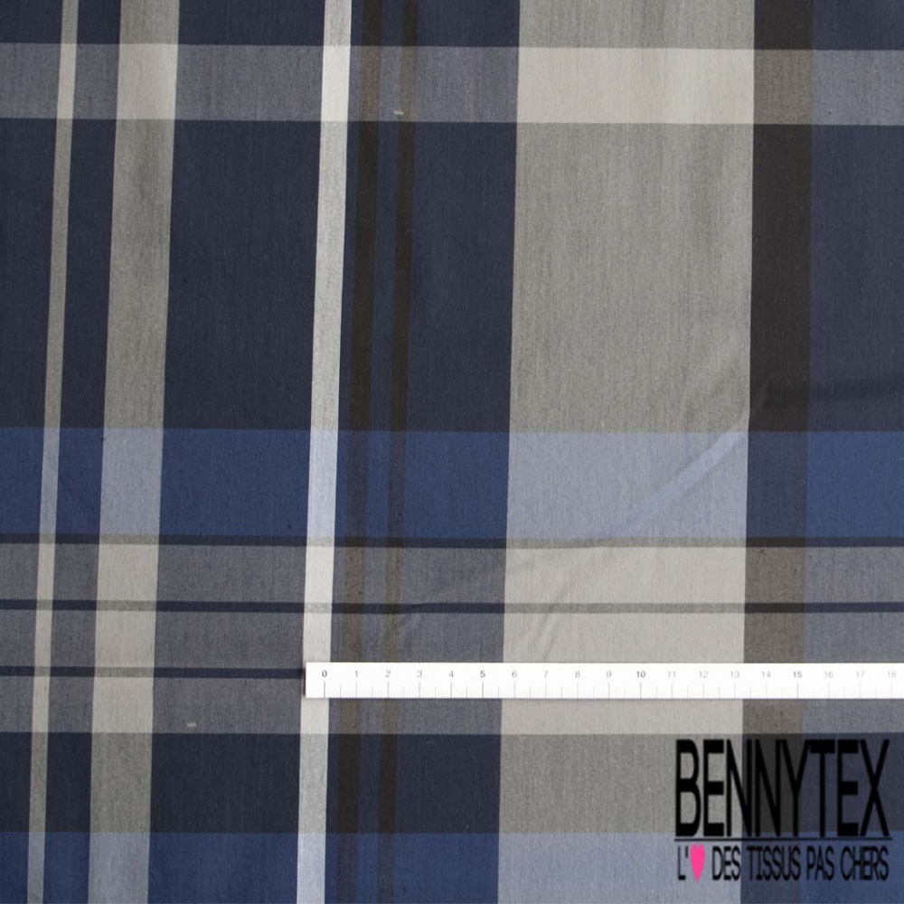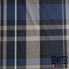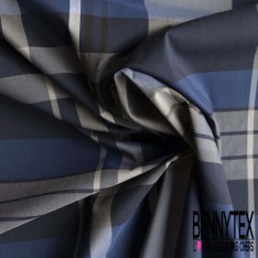 Coton gratté tissé teint élasthanne grands carreaux écossais ton marine bleu nuit gris clair noir