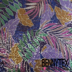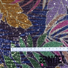 Laissez -vous séduire par notre sublime et lumineuse Résille élasthanne imprimé digital feuillage tropical multicolore sequin imprimé