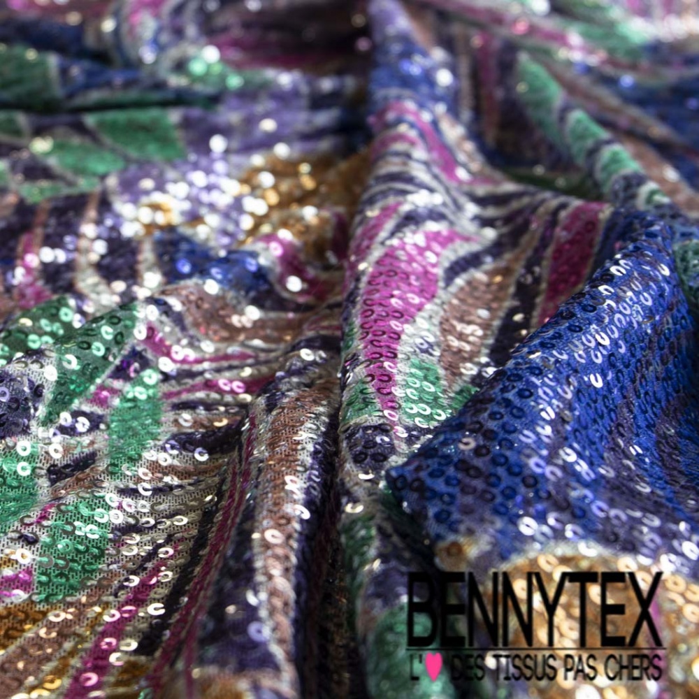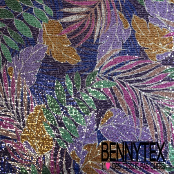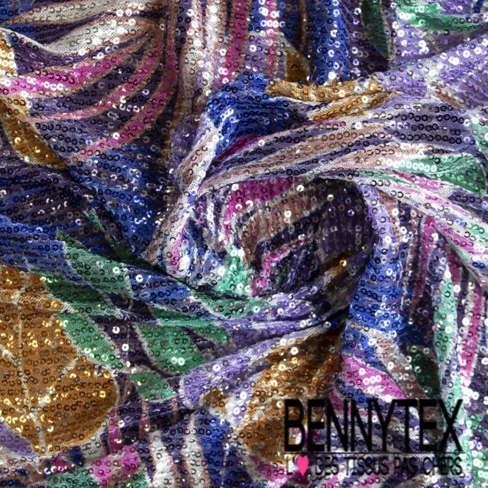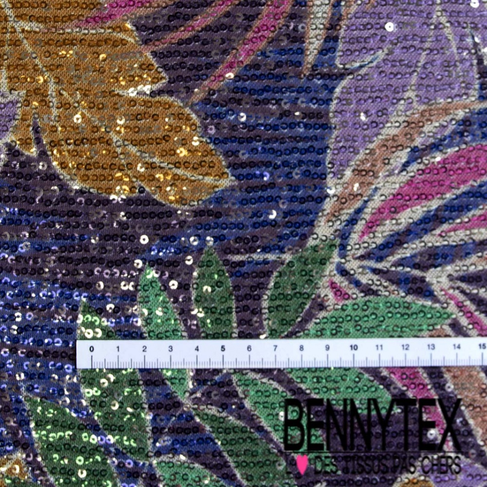 Résille élasthanne imprimé digital feuillage tropical multicolore sequin imprimé