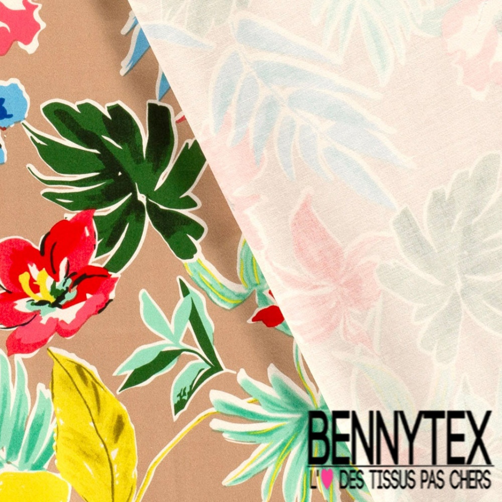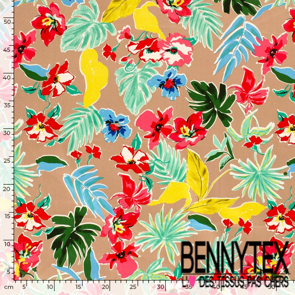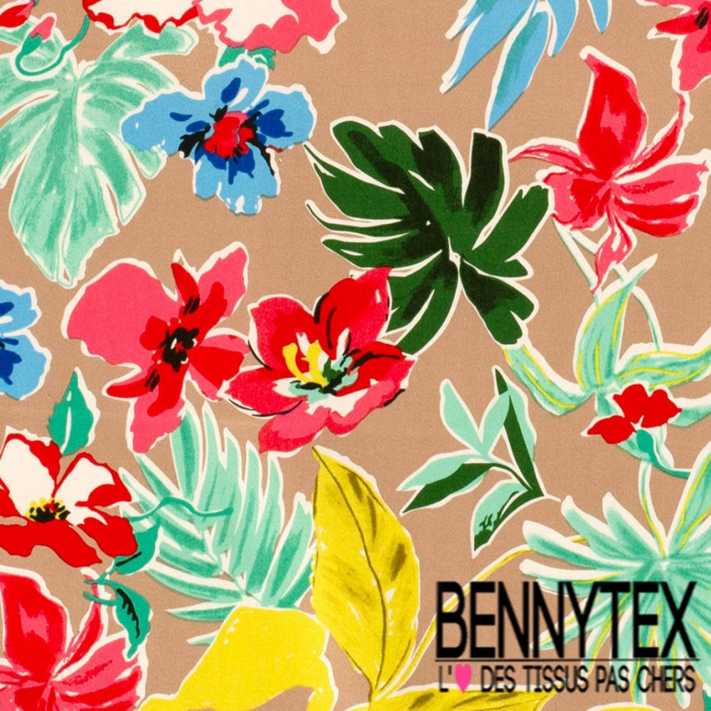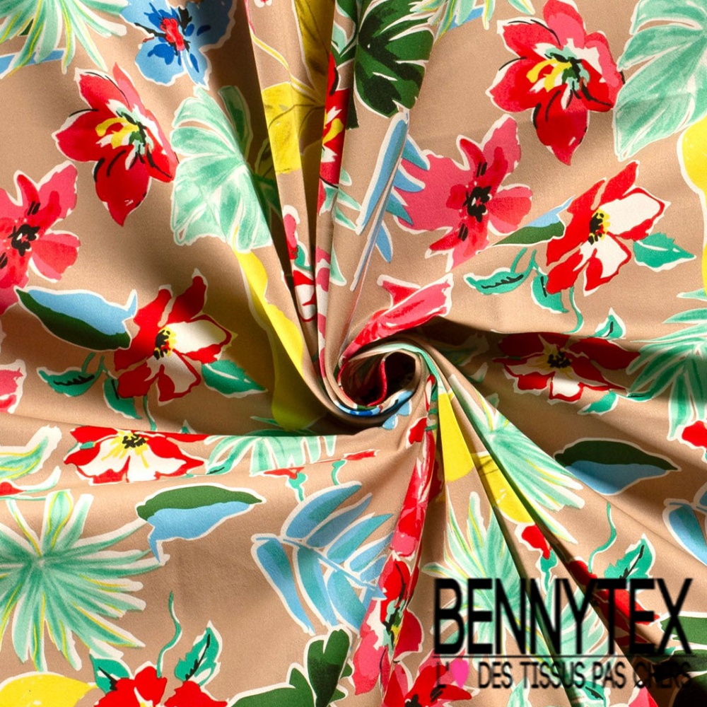 Coupon 3m Satin coton élasthanne imprimé floral tropical fond beige oeko tex