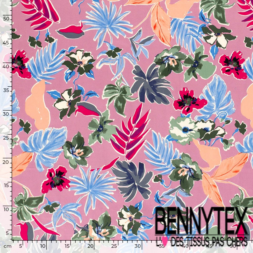 Coupon 3m Satin coton élasthanne imprimé floral tropical fond violine pastel oeko tex