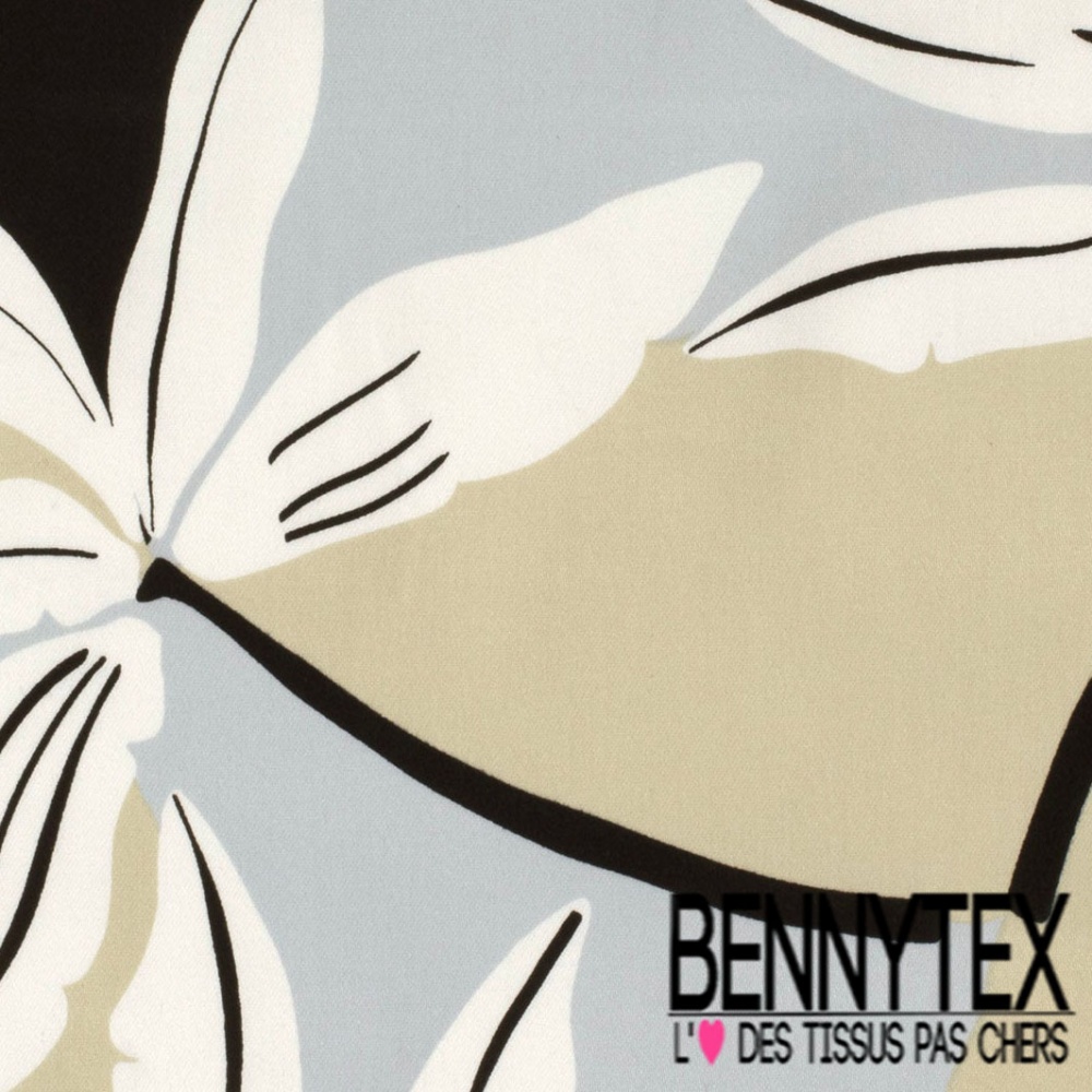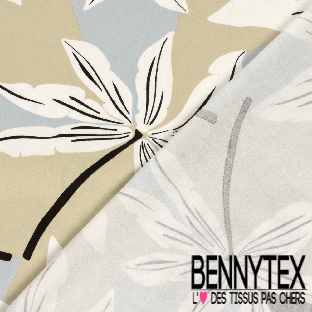 Ce Satin coton élasthanne imprimé grande fleur tropicale fond sable mouillé oeko tex sera idéal pour la confection de robes fiftie's, de jupes rétro,pour robe de mariée, cérémonie, de pantalons, de chemisiers et pour de la décoration tel que housses de couette , coussins déco...