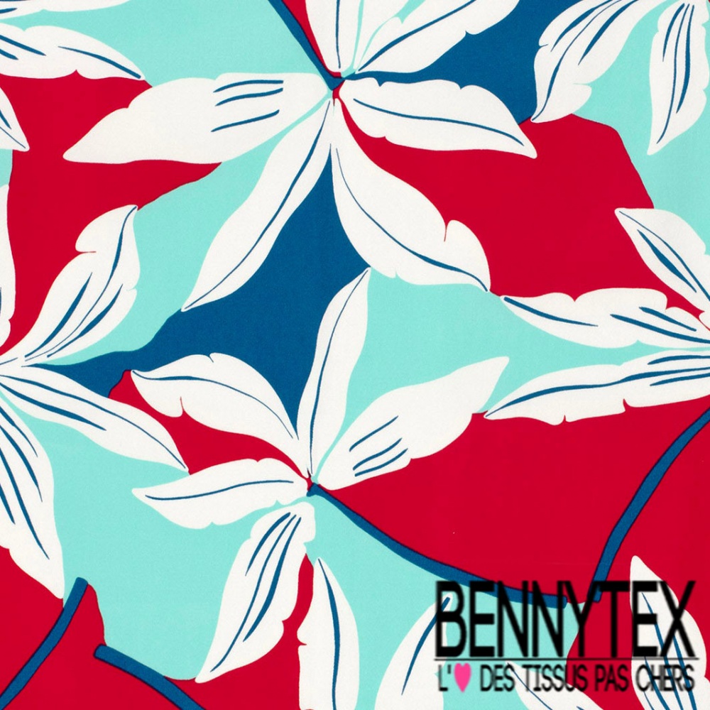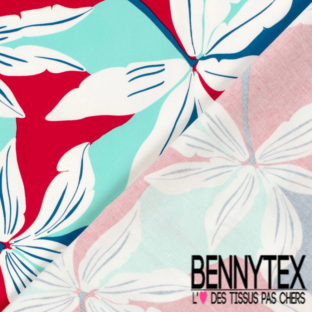 Ce Satin coton élasthanne imprimé grande fleur tropicale fond rouge oeko tex sera idéal pour la confection de robes fiftie's, de jupes rétro,pour robe de mariée, cérémonie, de pantalons, de chemisiers et pour de la décoration tel que housses de couette , coussins déco...