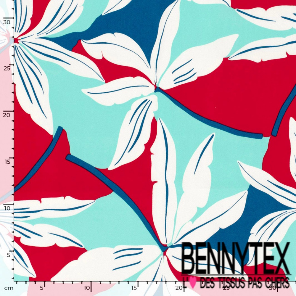 Coupon 3m Satin coton élasthanne imprimé grande fleur tropicale fond rouge oeko tex tex
