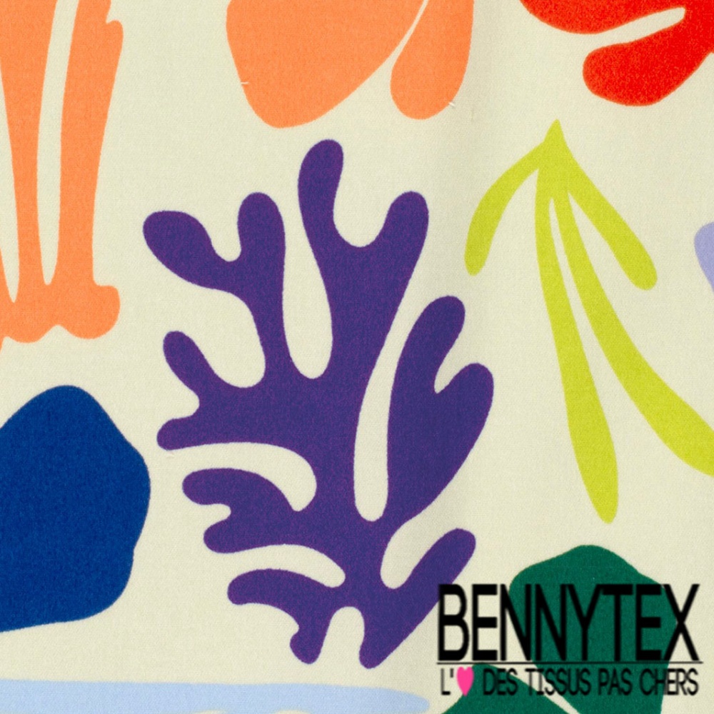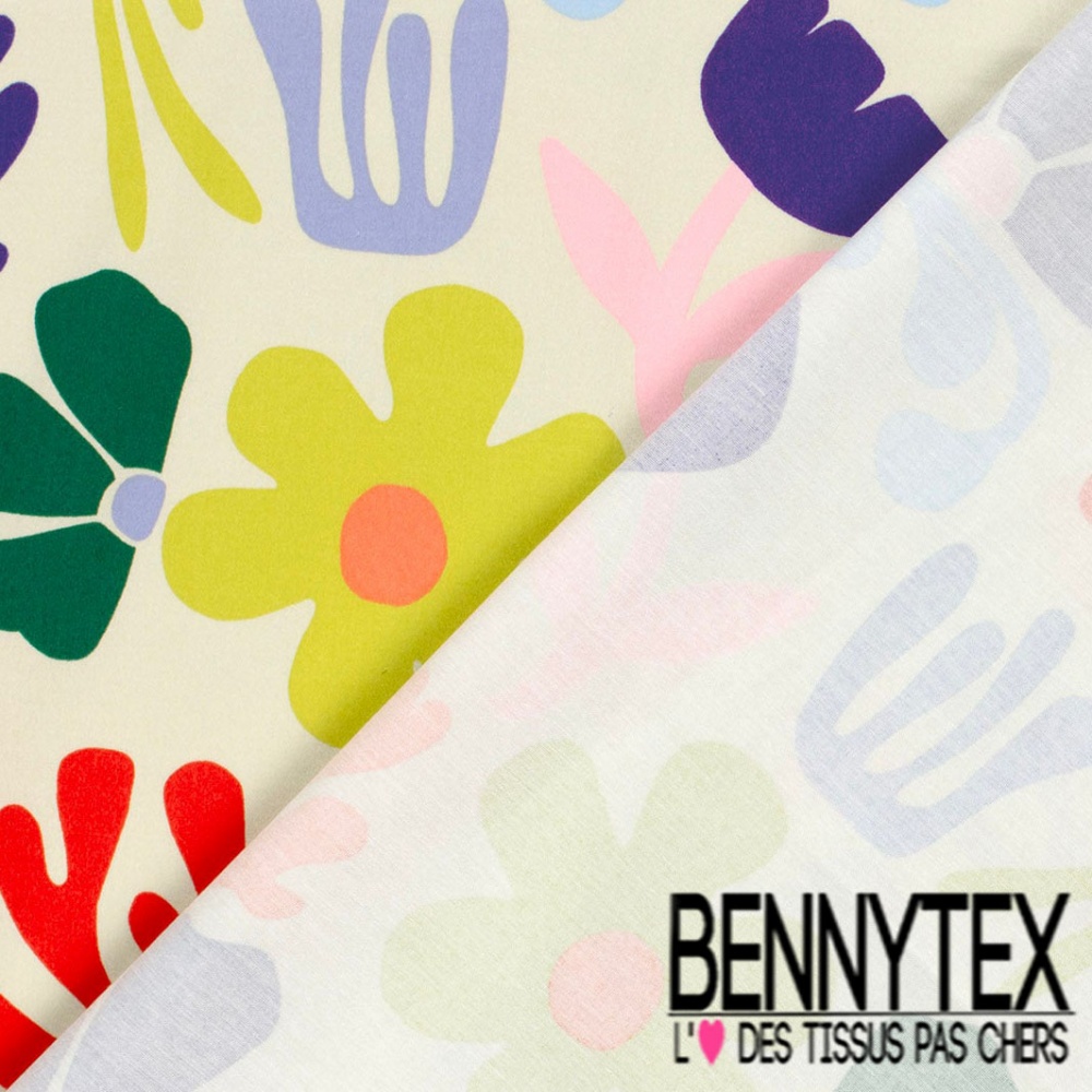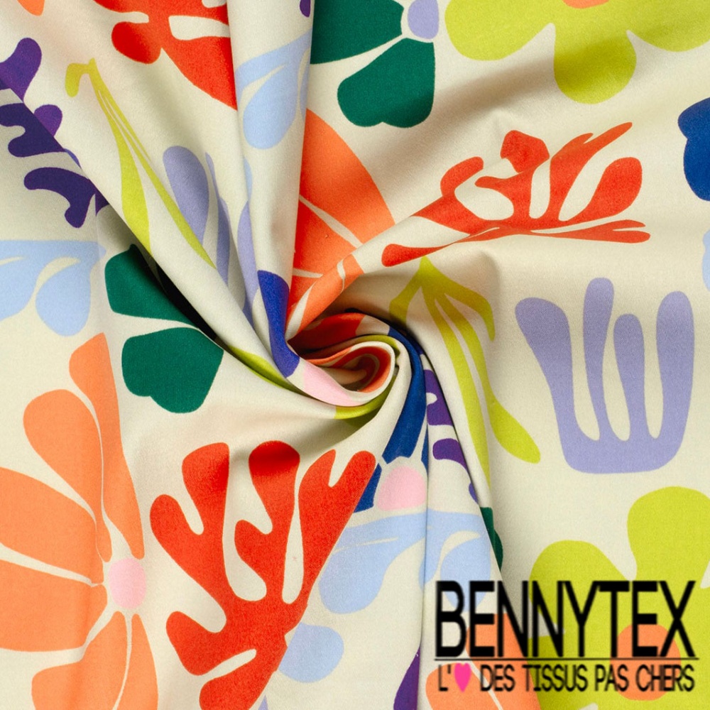 Ce Satin coton élasthanne imprimé floral naïf multicolore fond clairière oeko tex sera idéal pour la confection de robes fiftie's, de jupes rétro,pour robe de mariée, cérémonie, de pantalons, de chemisiers et pour de la décoration tel que housses de couette , coussins déco...