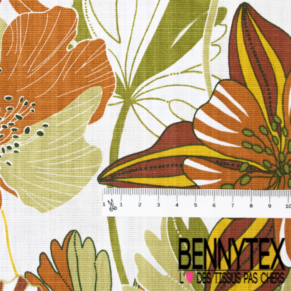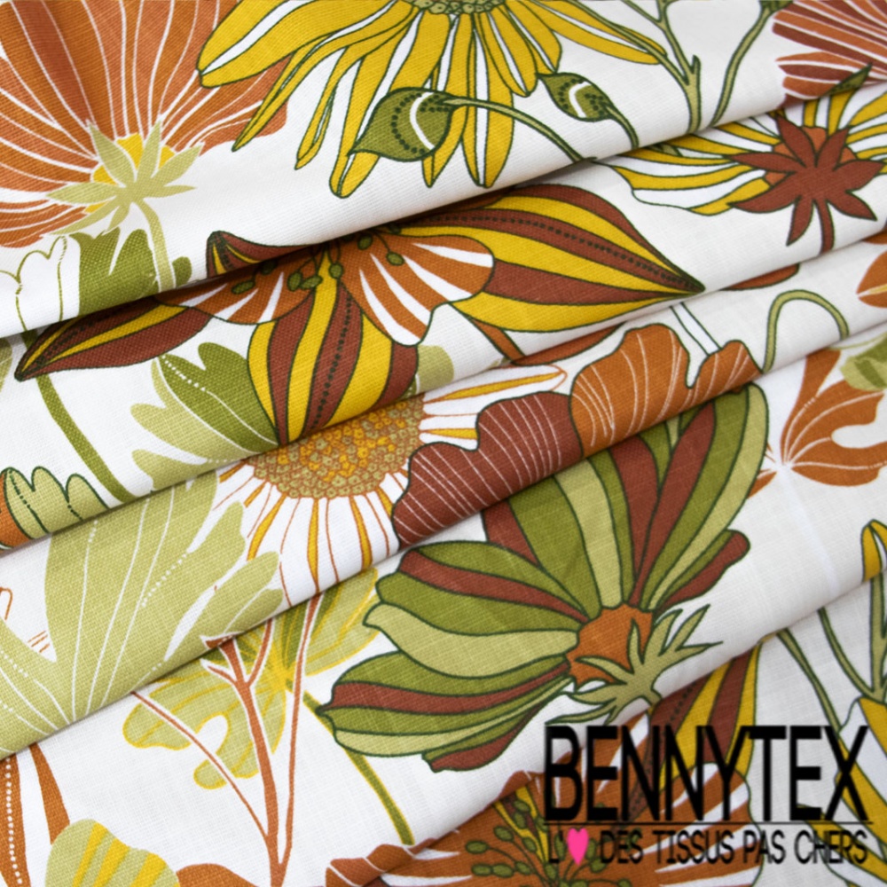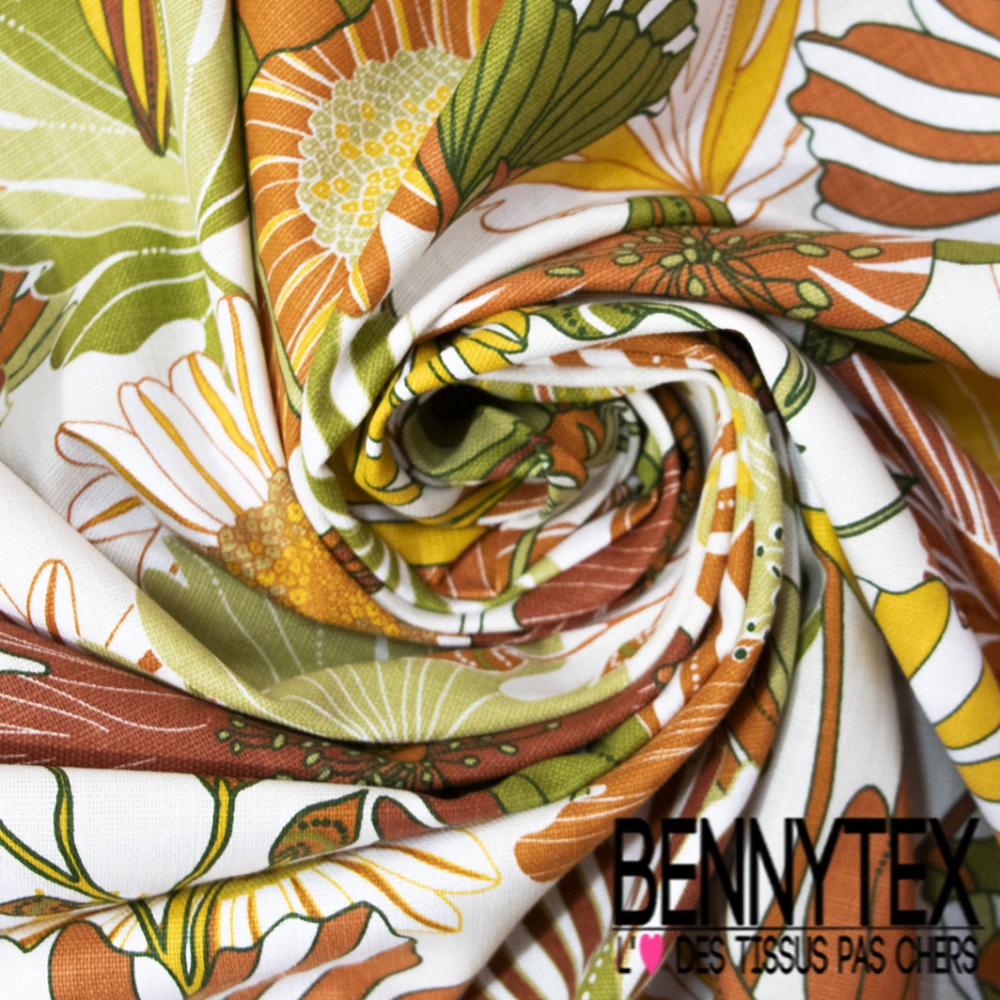 Toile de coton effet lin imprimé floral seventie's ton orange fond blanc discret oeko tex