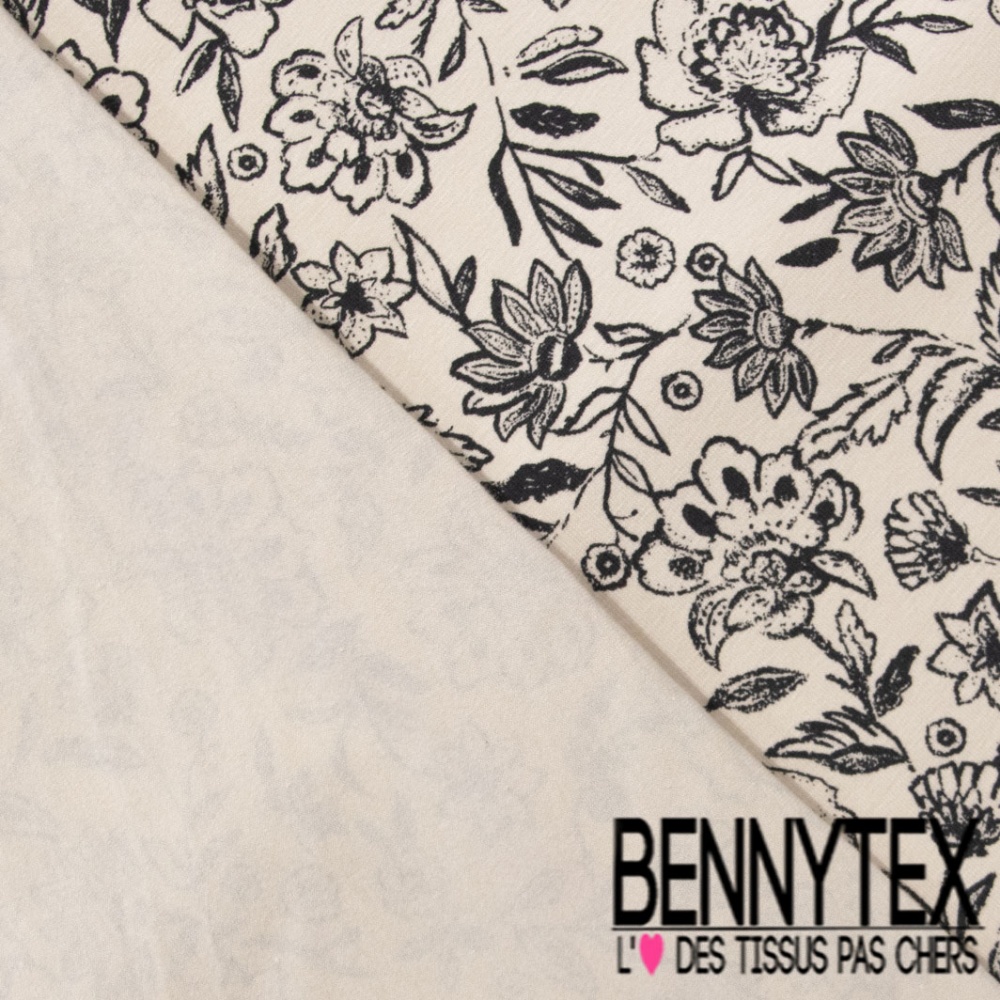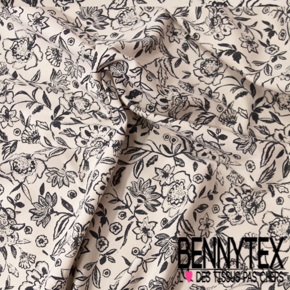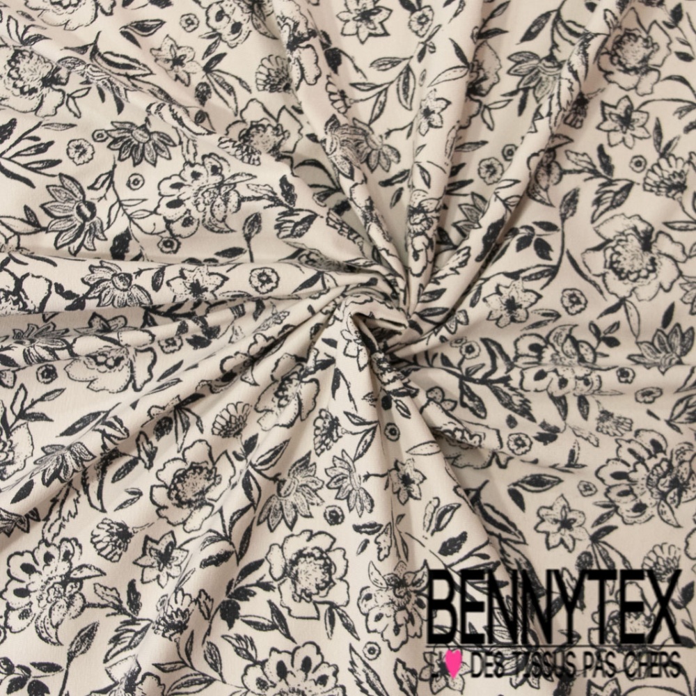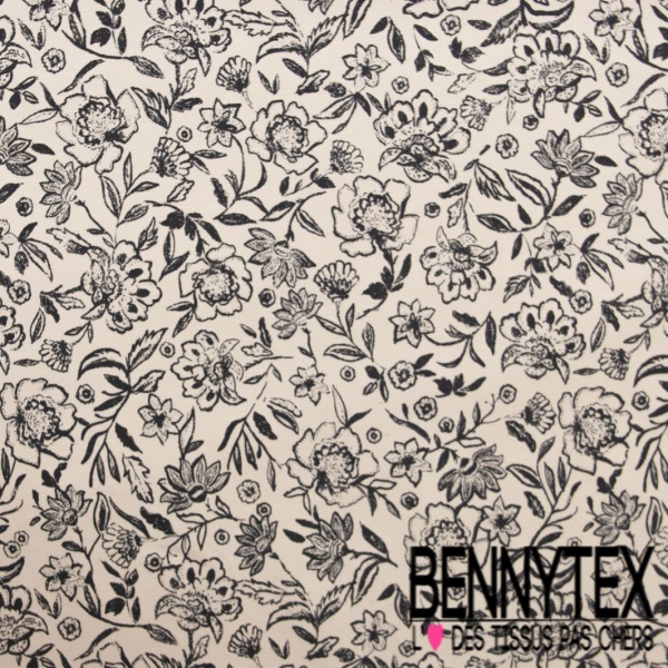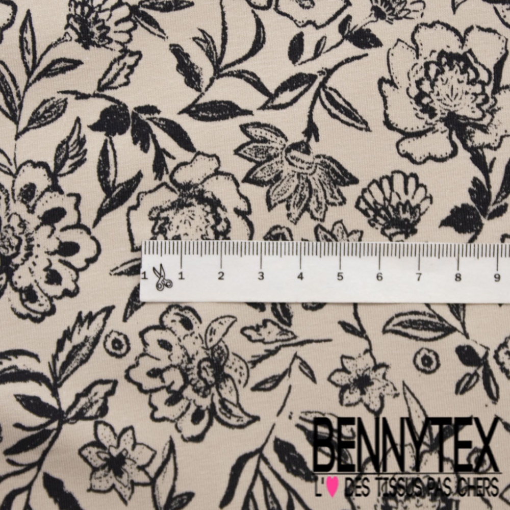 Jersey coton élasthanne motif floral baroque noir fond beige pastel