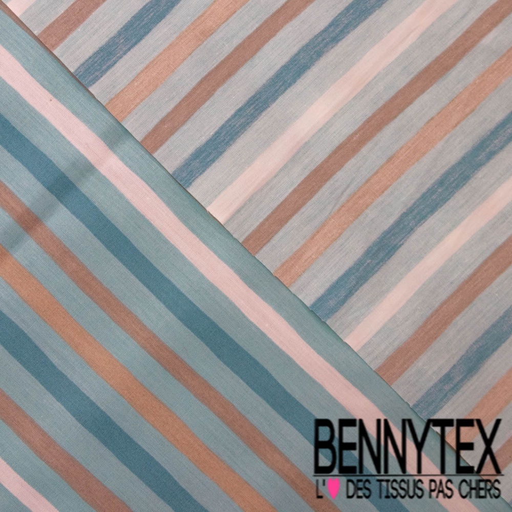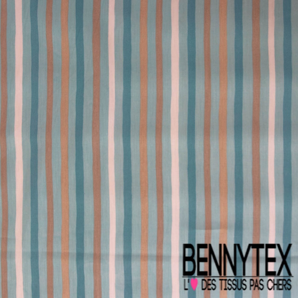 Coupon 3m Popeline coton 120 fils imprimé rayure verticale sable blanc discret bleu d'huile turquoise