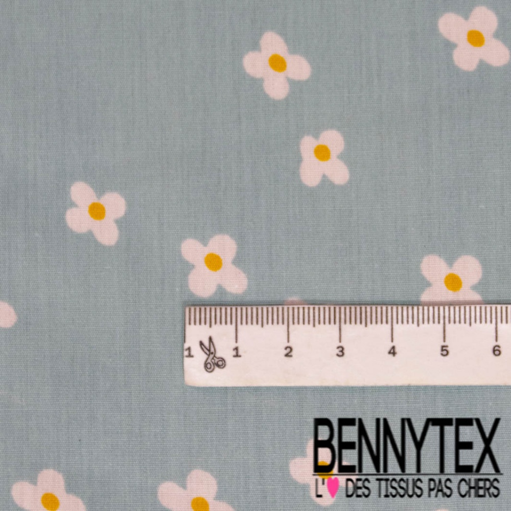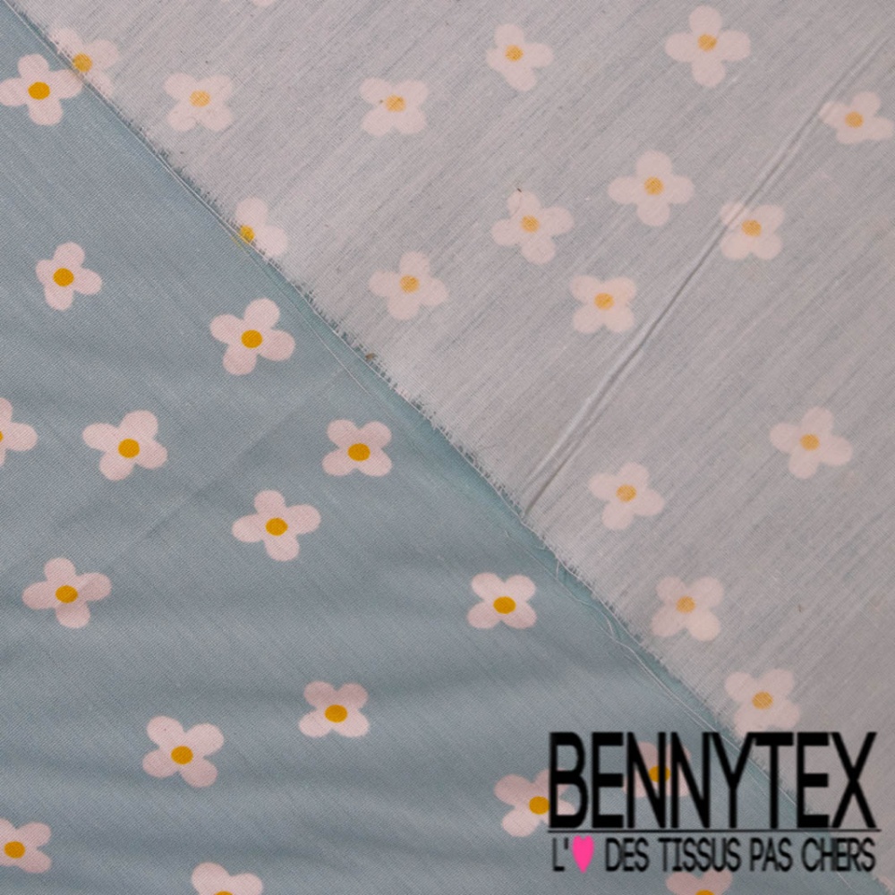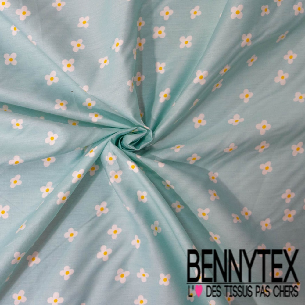 Coupon 3m Popeline coton 120 fils imprimé petite fleur blanche fond turquoise