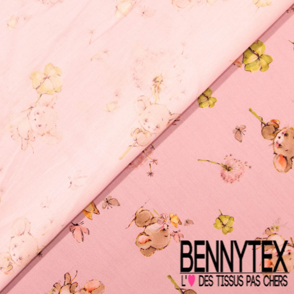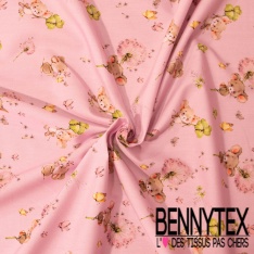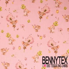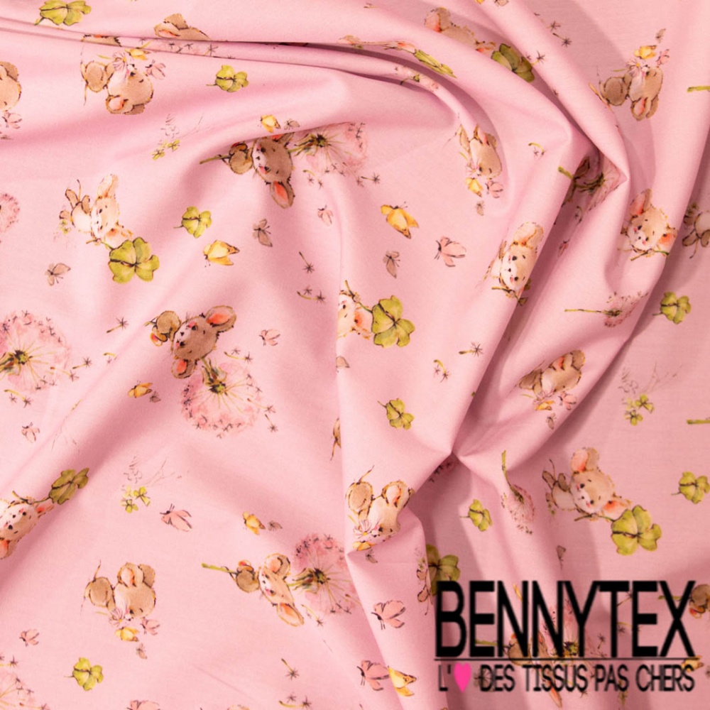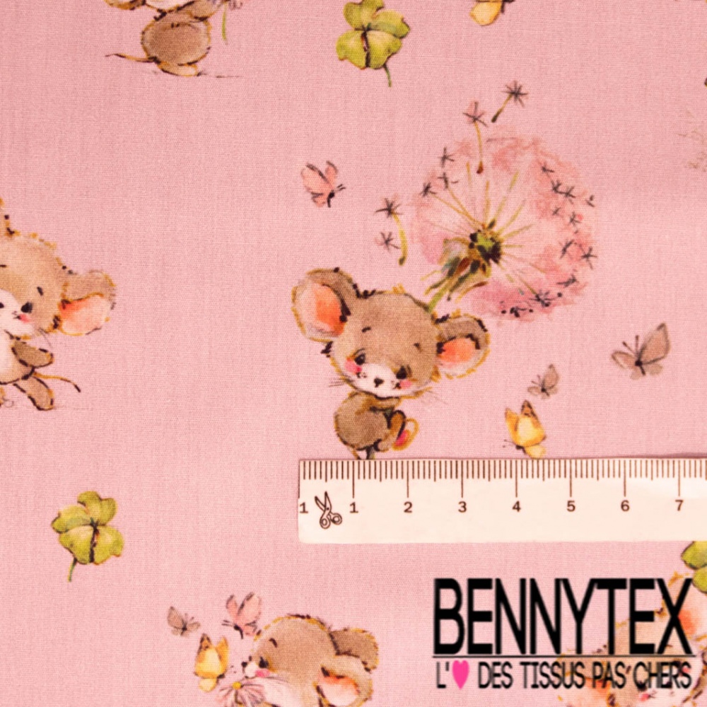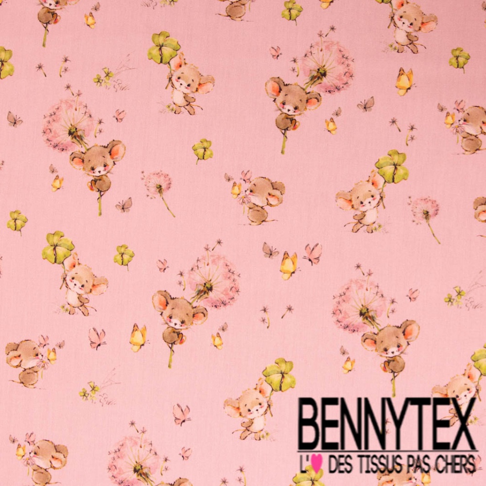 Coupon 3m Popeline coton lavé imprimé petite souris avec trèfle fond rose trémière