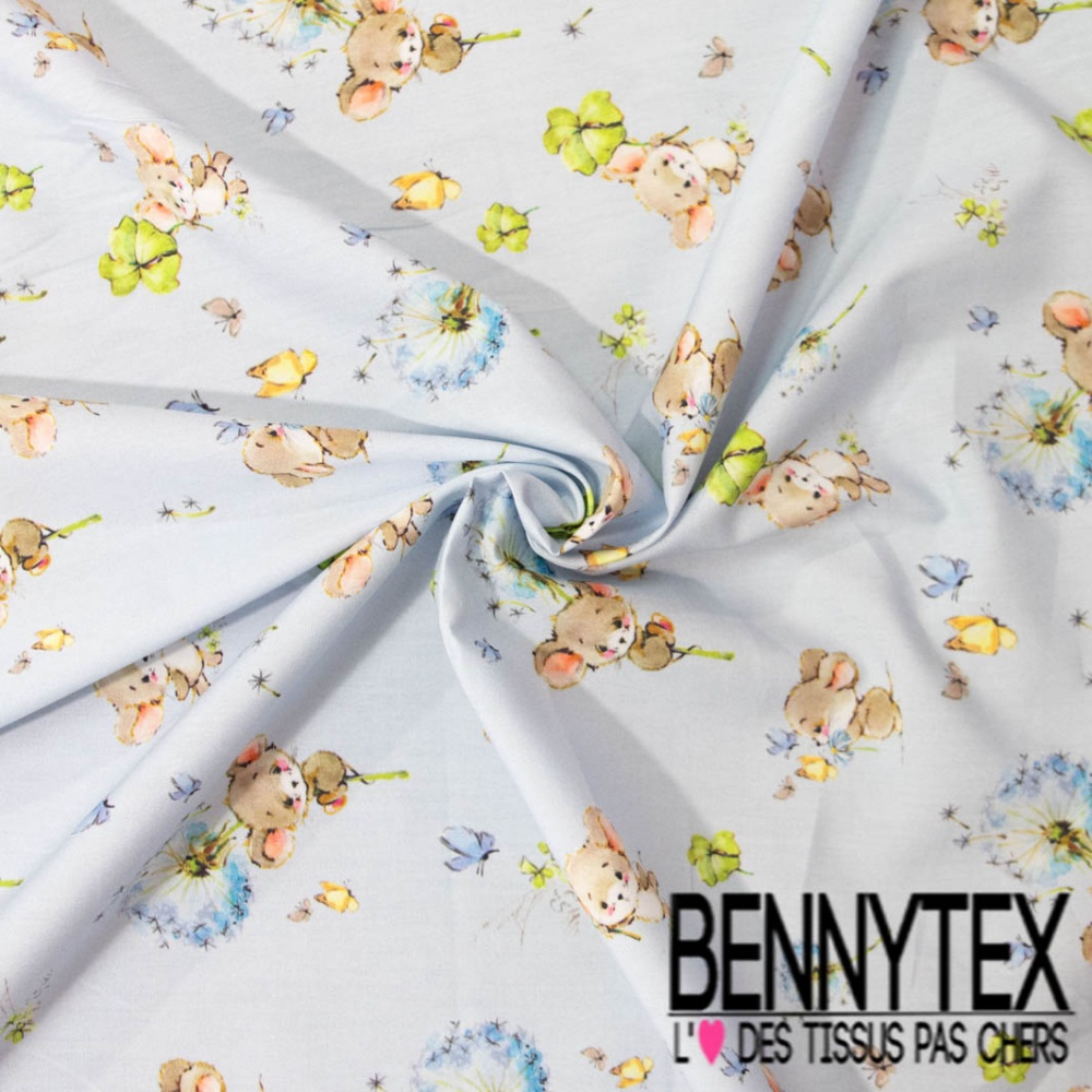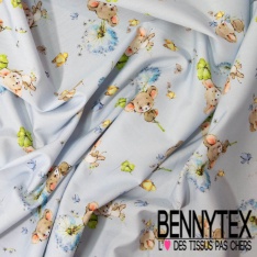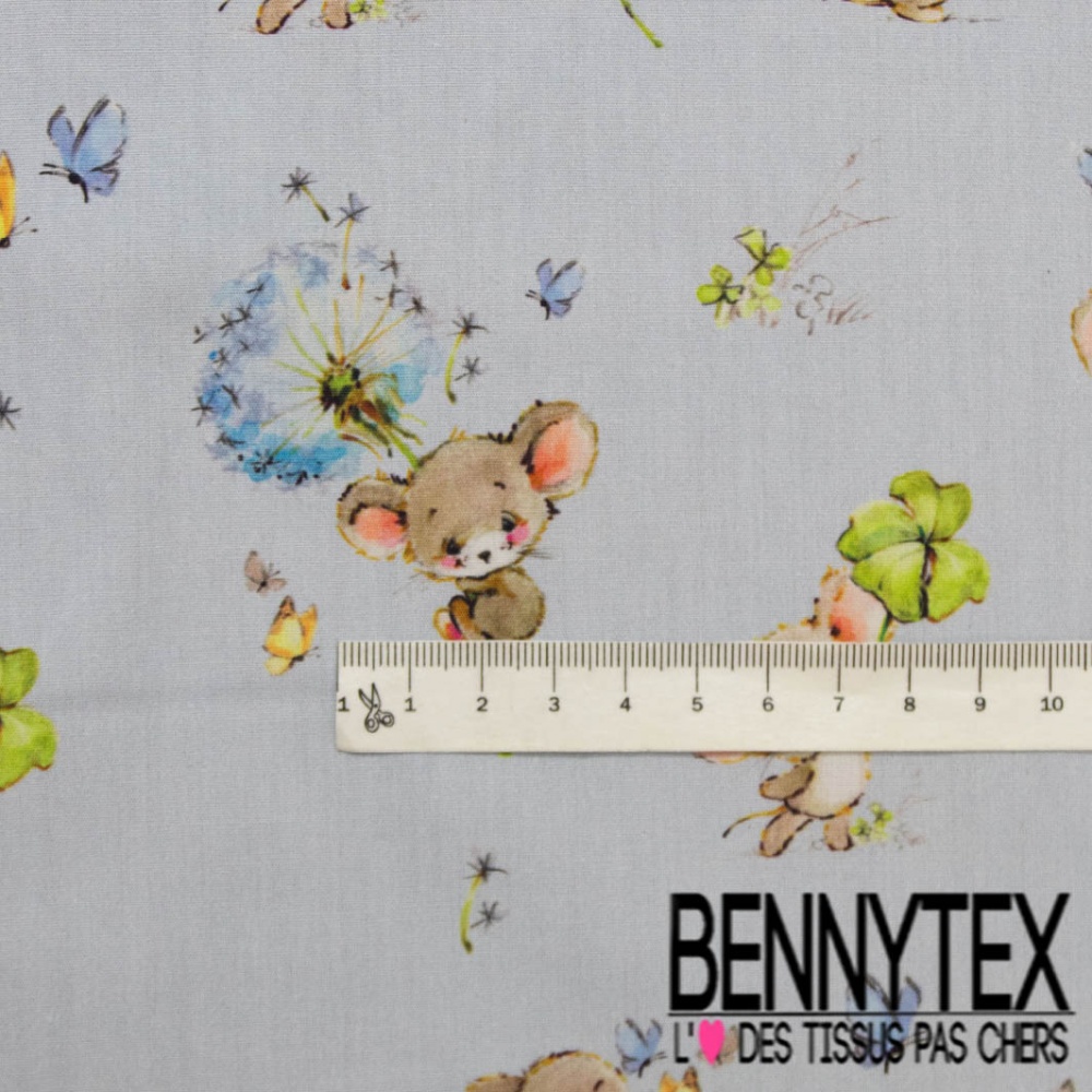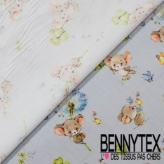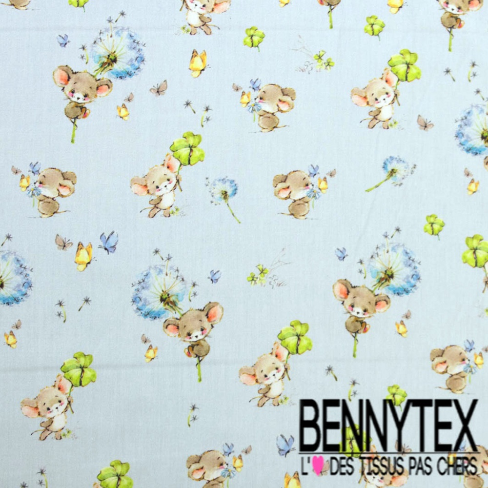 Coupon 3m Popeline coton lavé imprimé petite souris avec trèfle fond bleu ciel