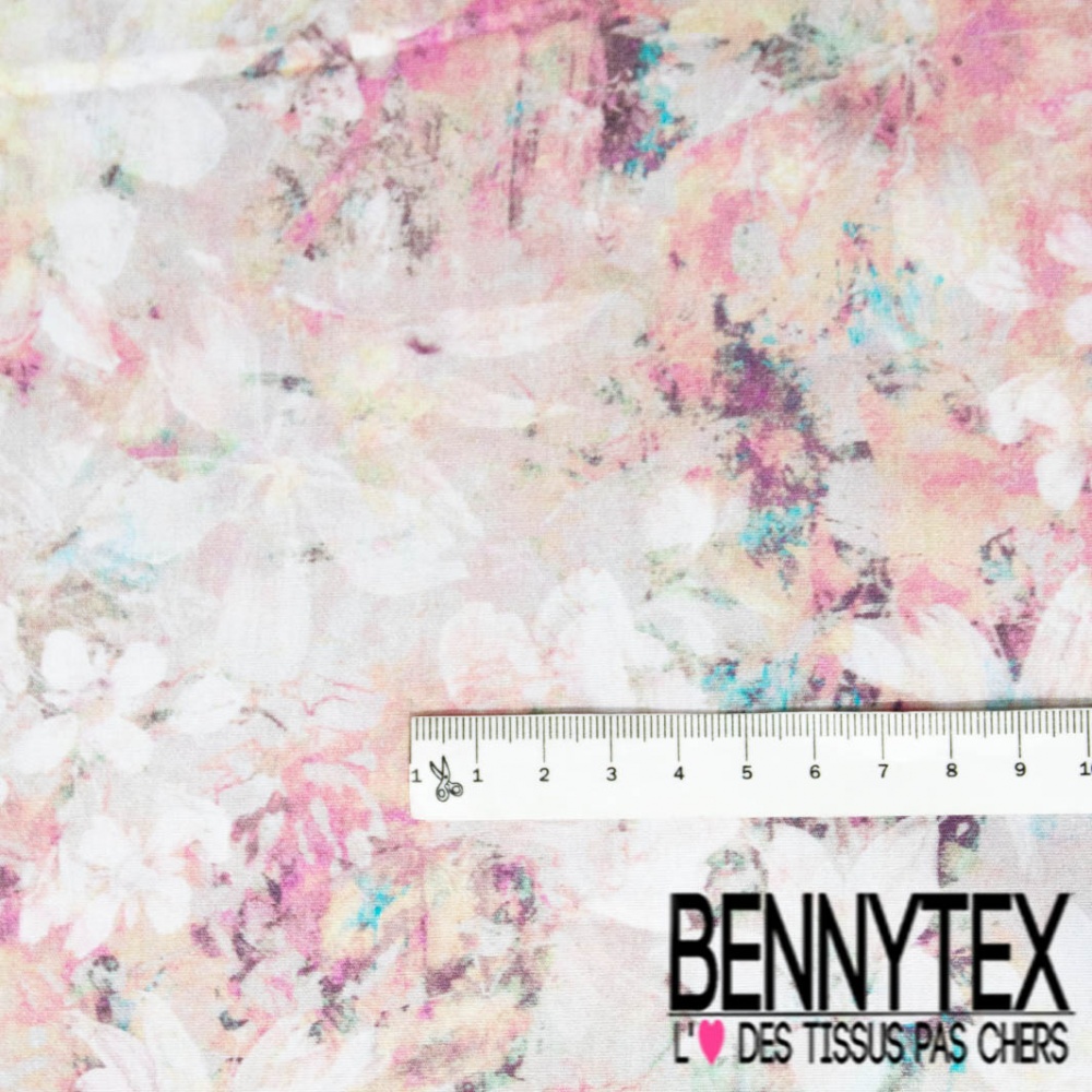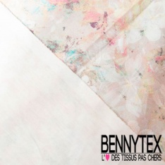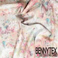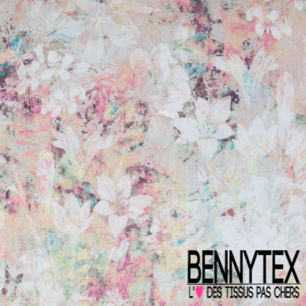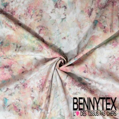 Popeline coton élasthanne 120 fils motif feuillage fleur et nature tropicale ton rose saumon corail