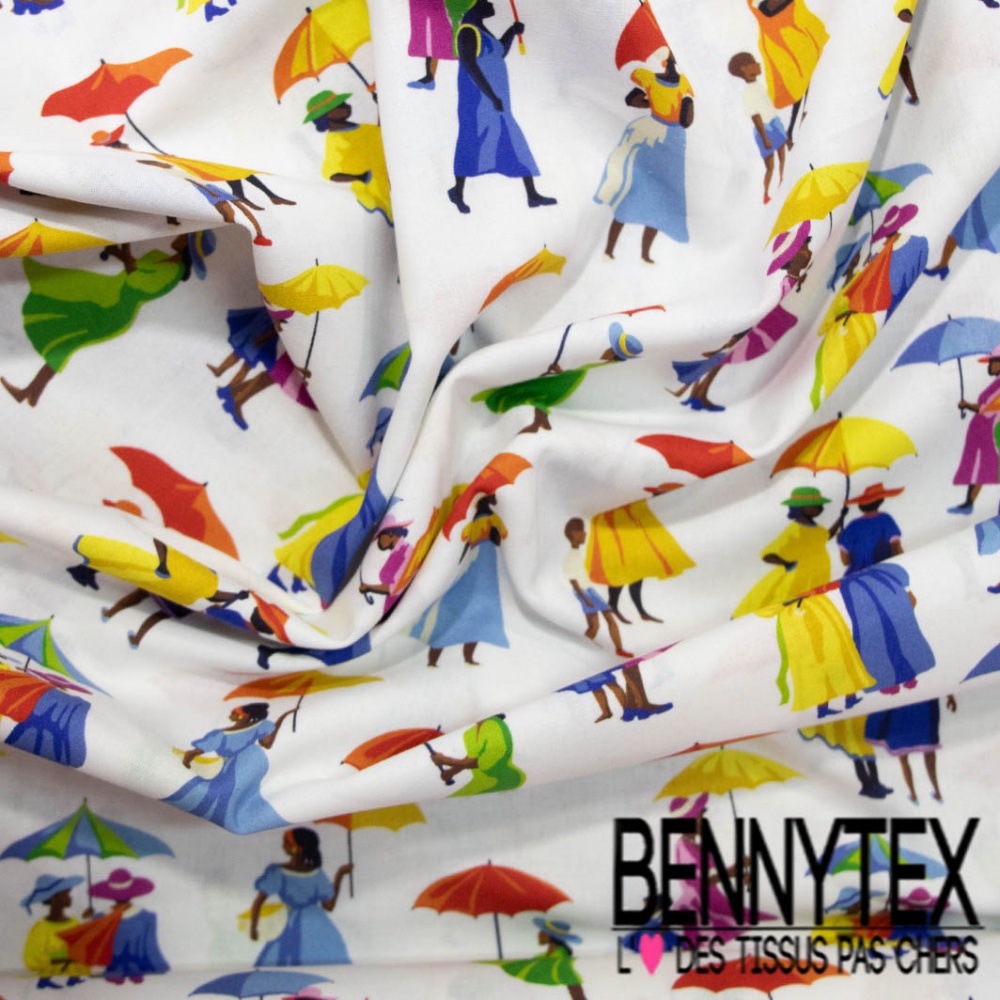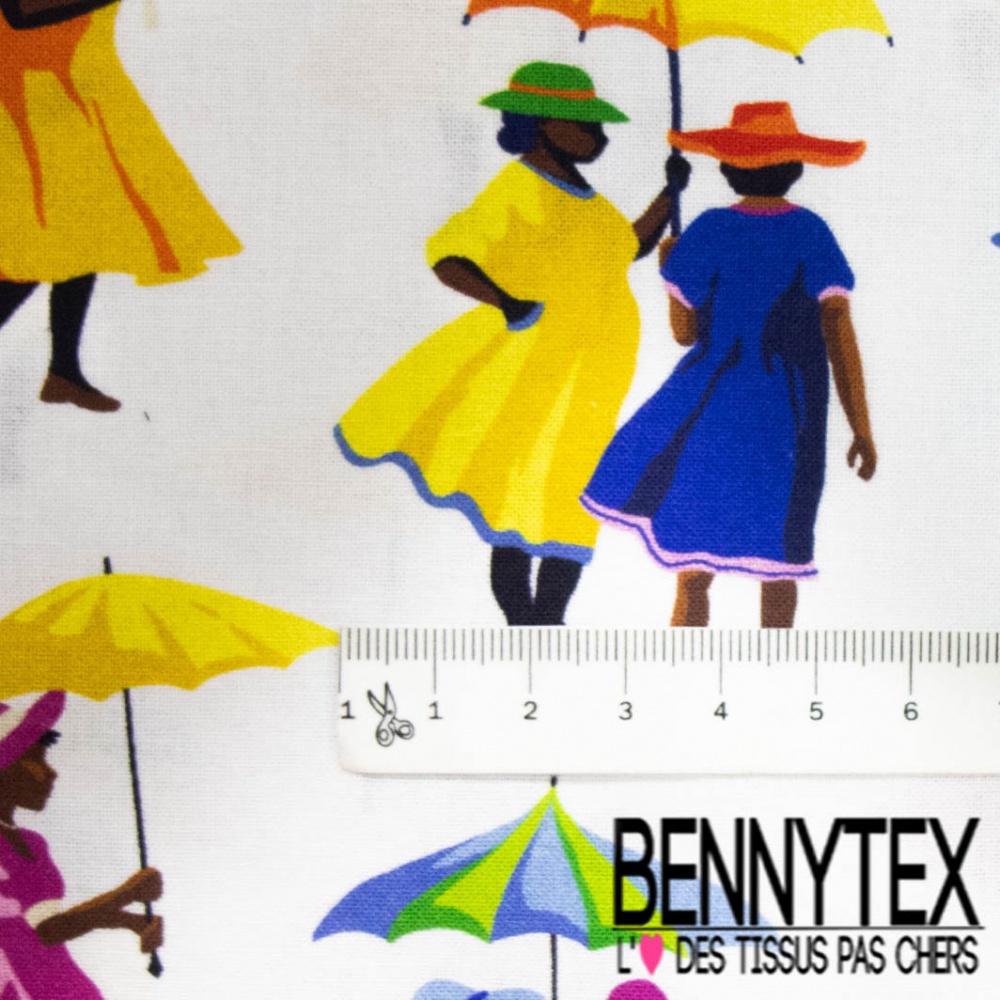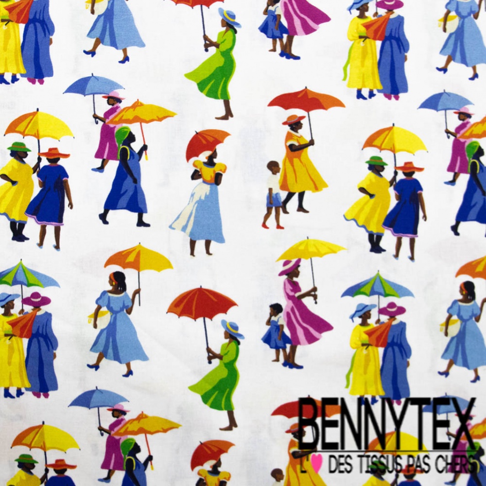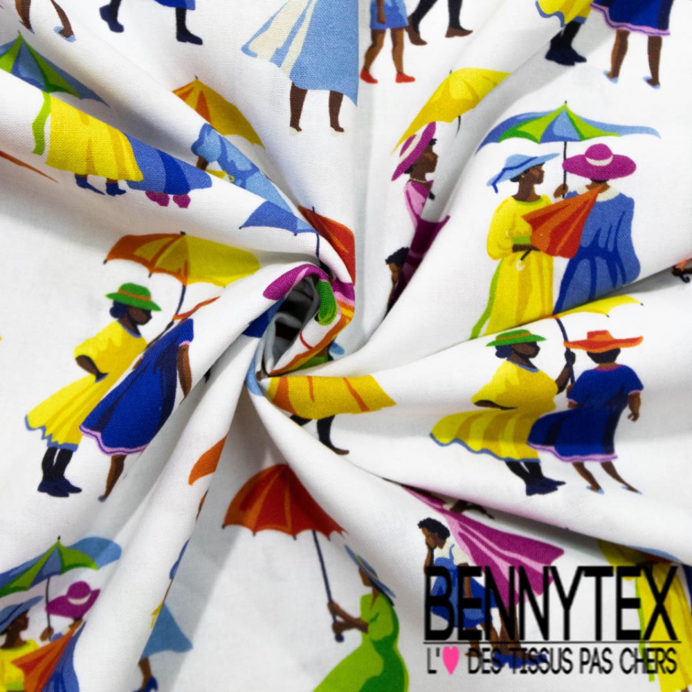 Toile lorraine impression femme noir robe multicolore fond blanc discret