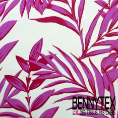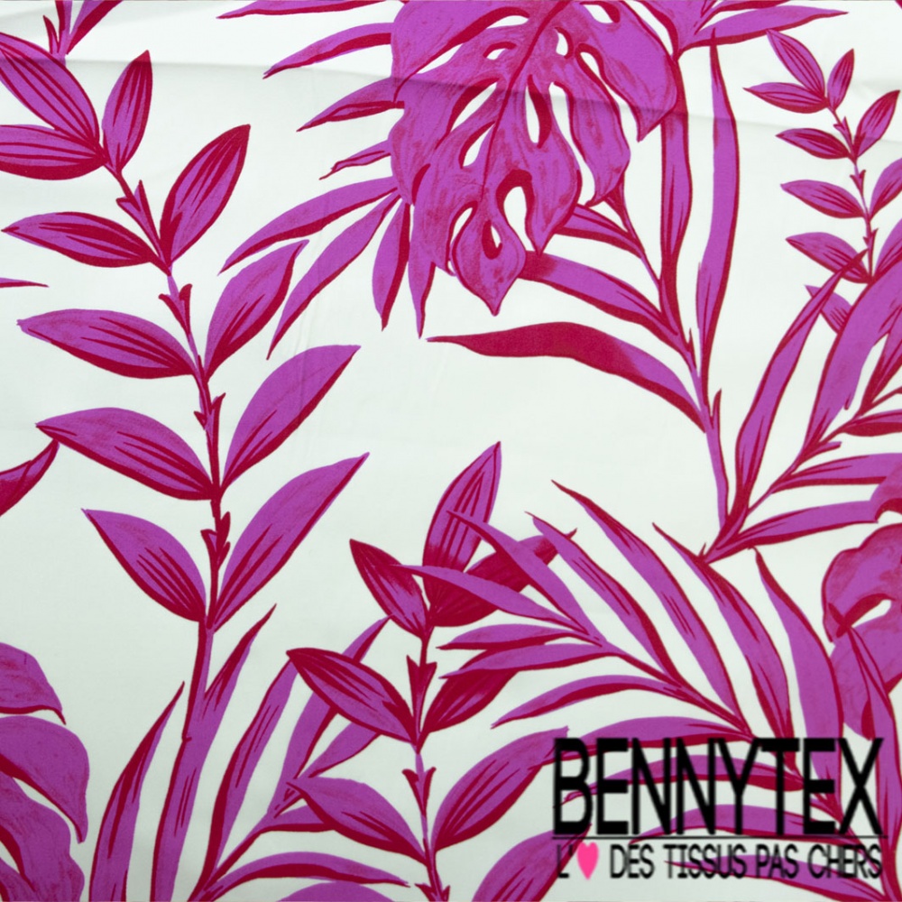 Toile de coton élasthanne digital grand imprimé tropical fushia fond blanc optique