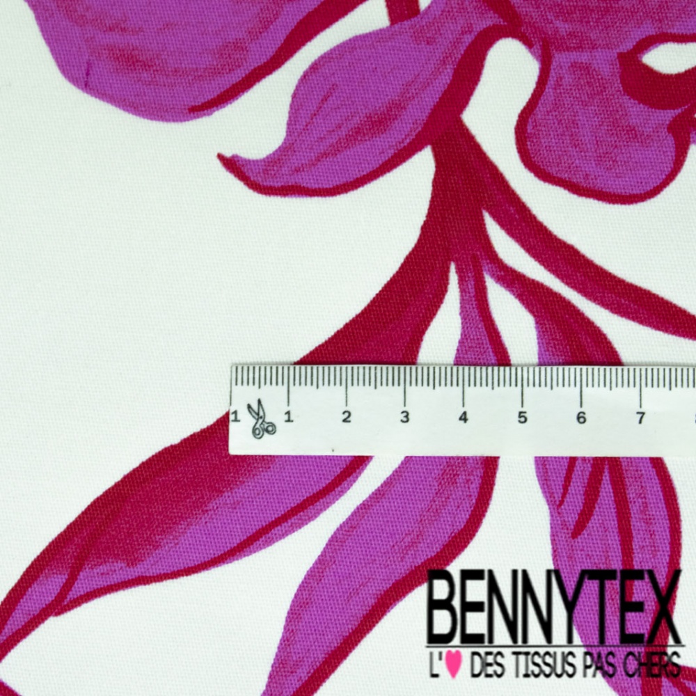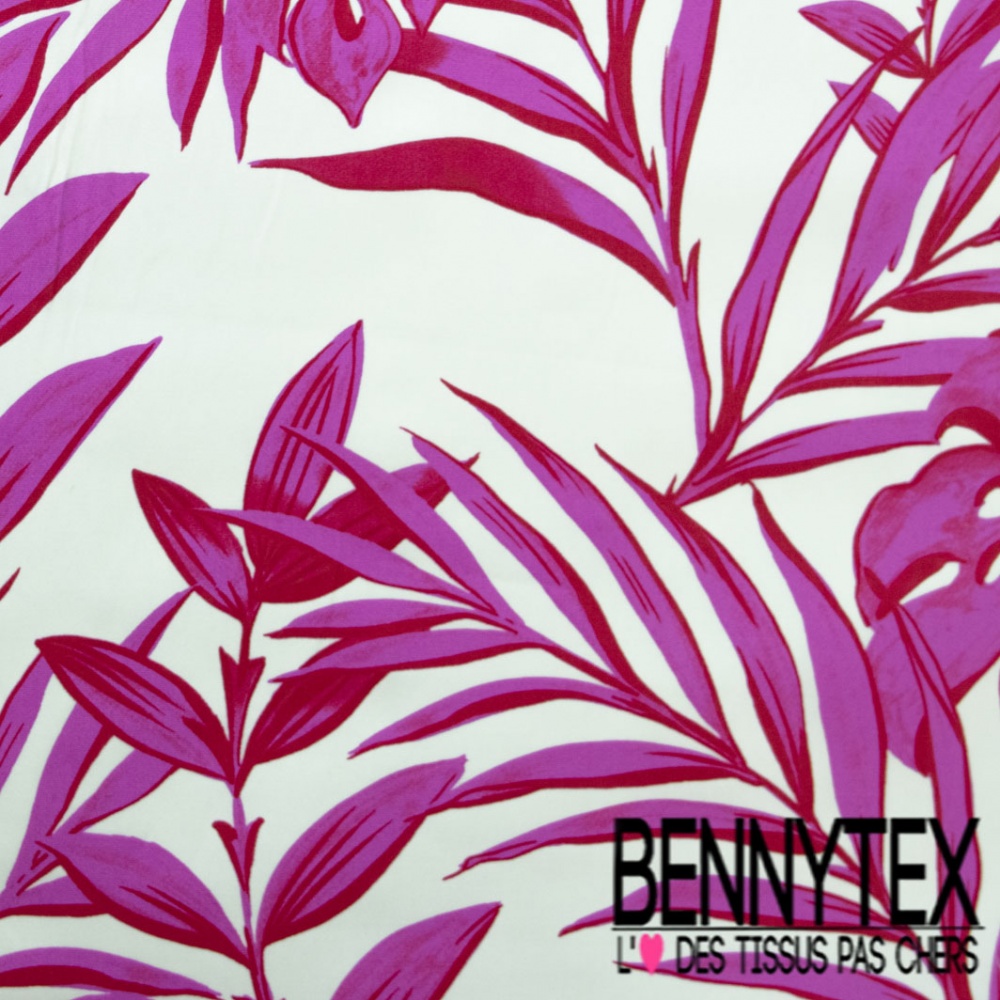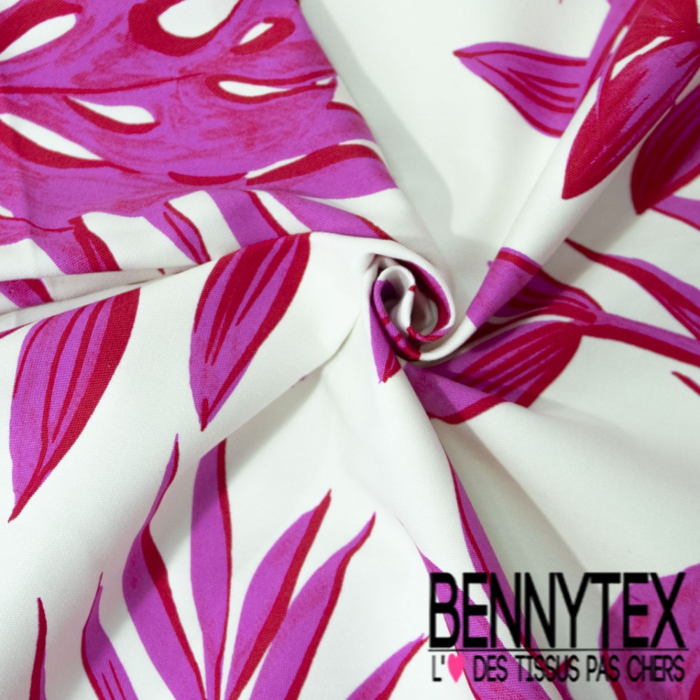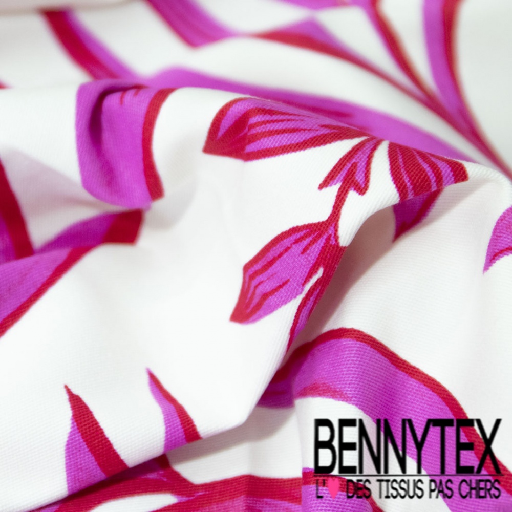 La Toile de coton élasthanne digital grand imprimé tropical fushia fond blanc optique est une matière épaisse qui peut être utilisée aussi bien dans l'accessoire que dans l'habillement pou la décoration d'intérieur