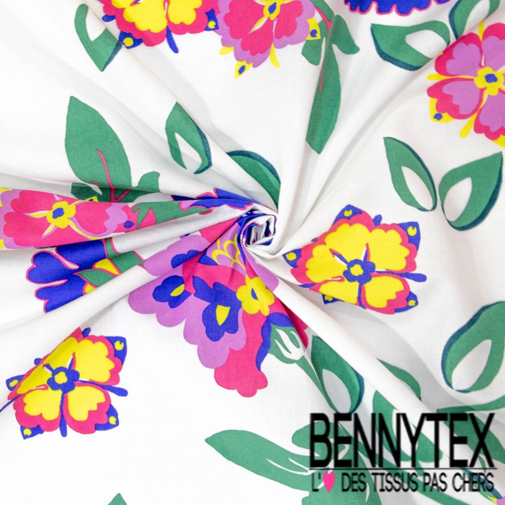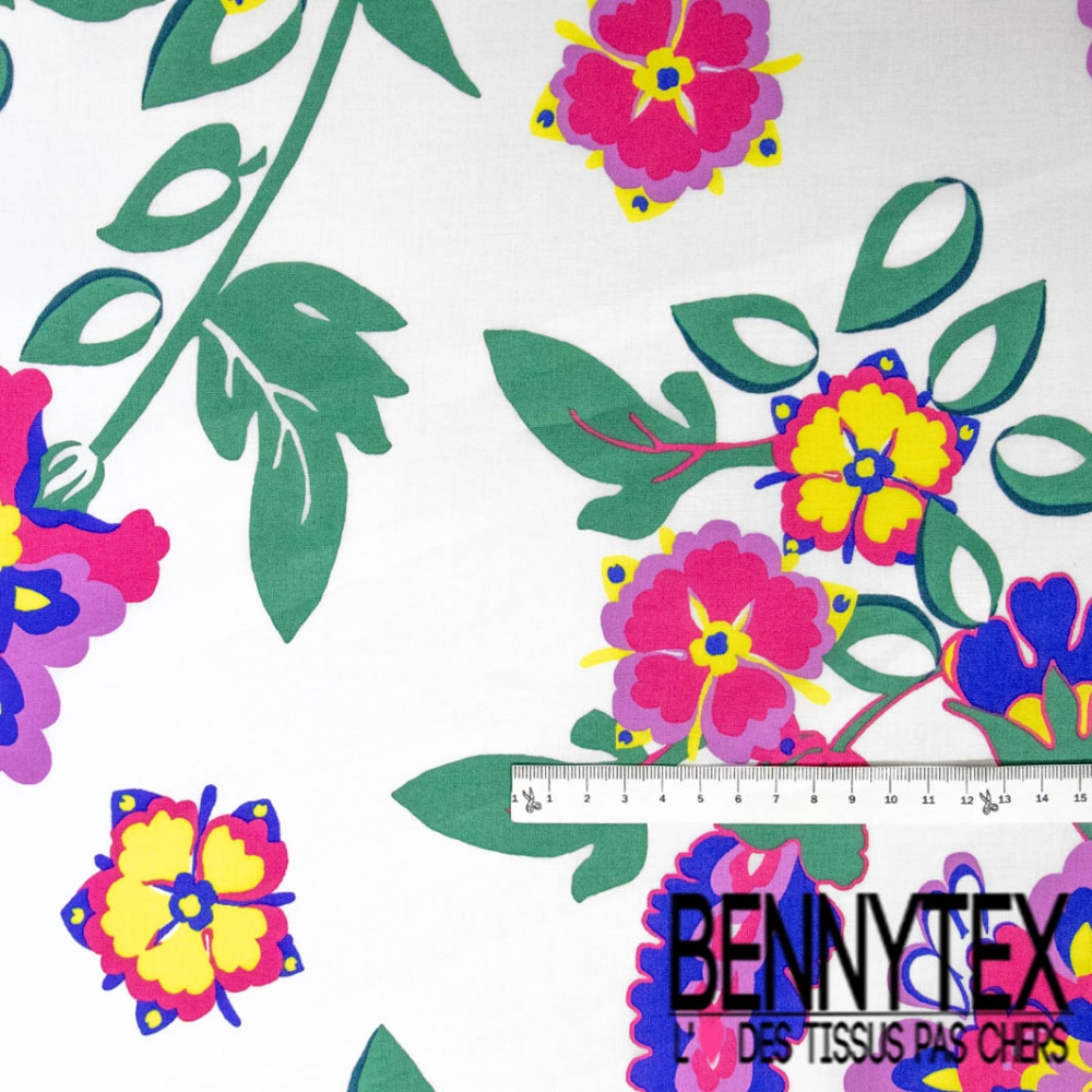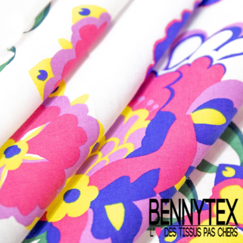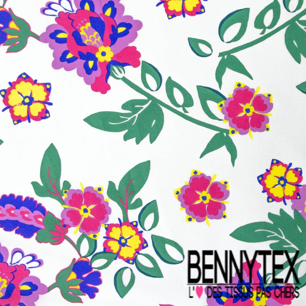 Voile de coton élasthanne imprimé grande fleur cachemire multicolore fond blanc discret