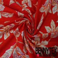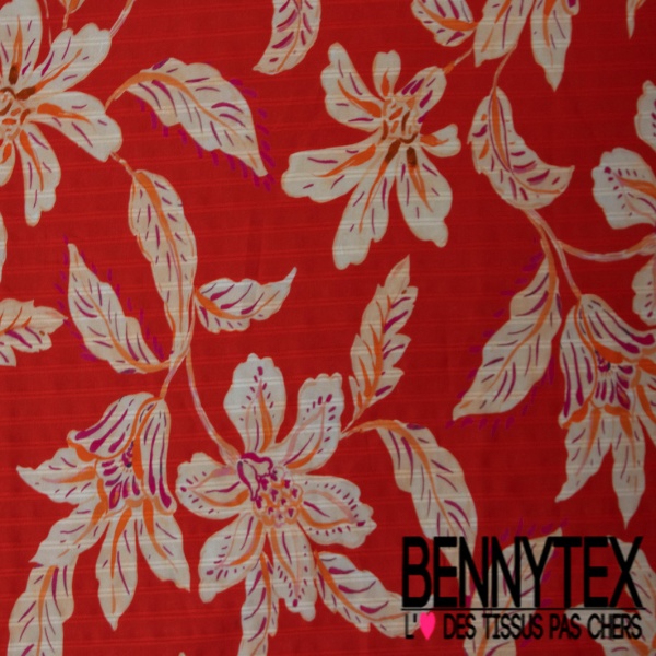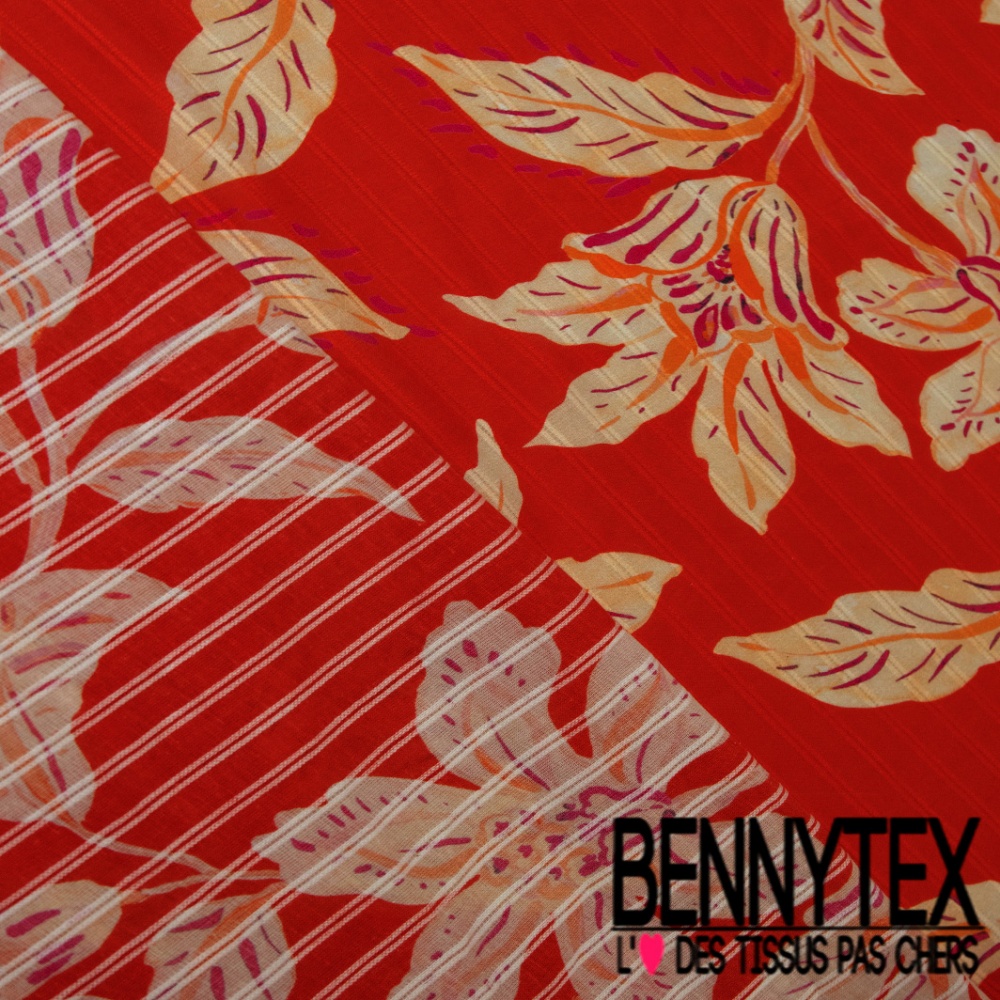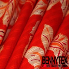 Voile de coton élasthanne imprimé grande fleur tropicale rayure verticale texturé fond mandarin