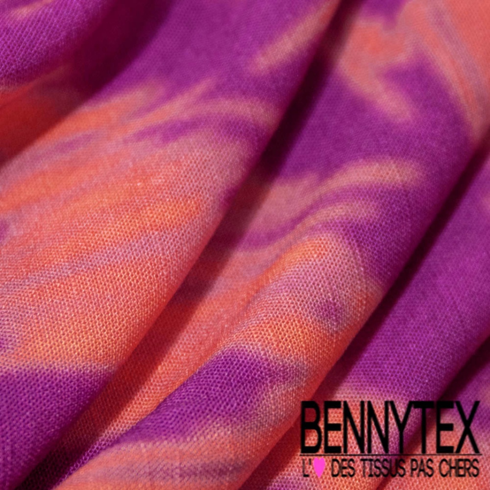 Fibranne viscose effet lin imprimé abstrait griffonné corail vif fond orchidée
