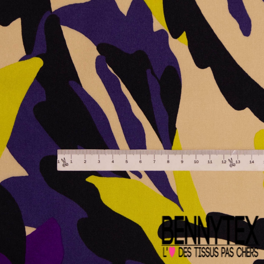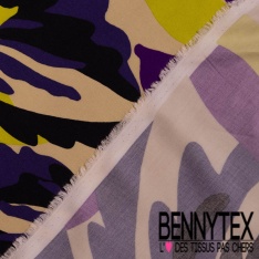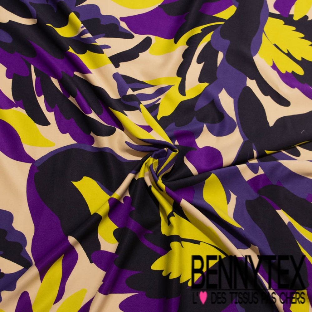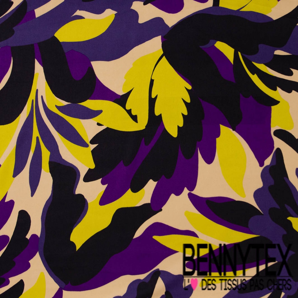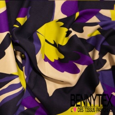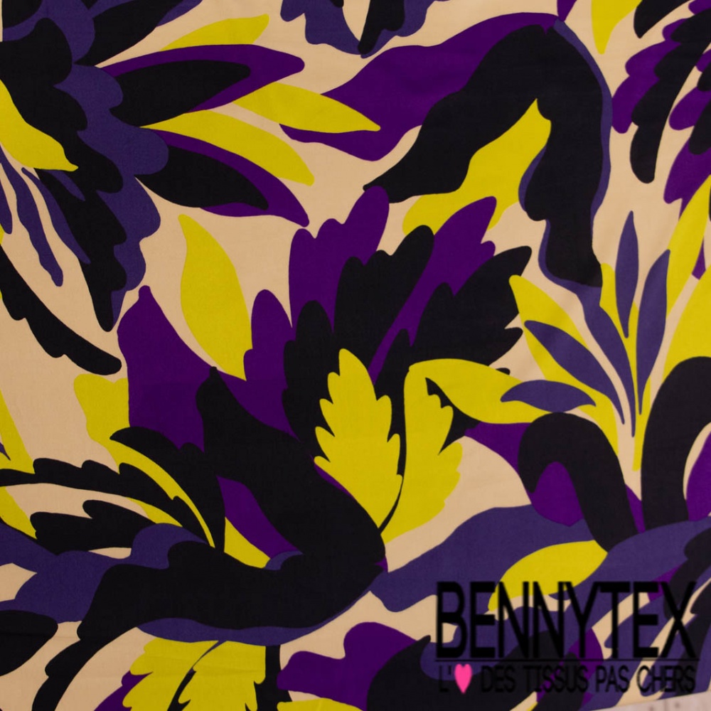 Fibranne viscose digitale grand imprimé floral naïf noir anis violet noir fond sable
