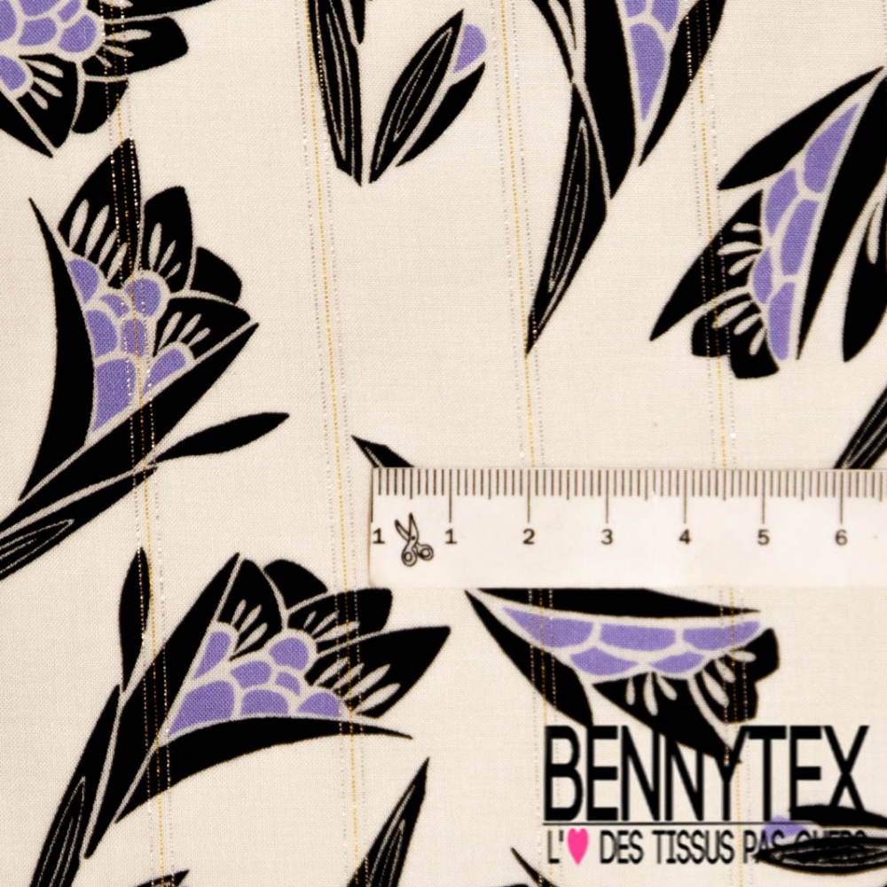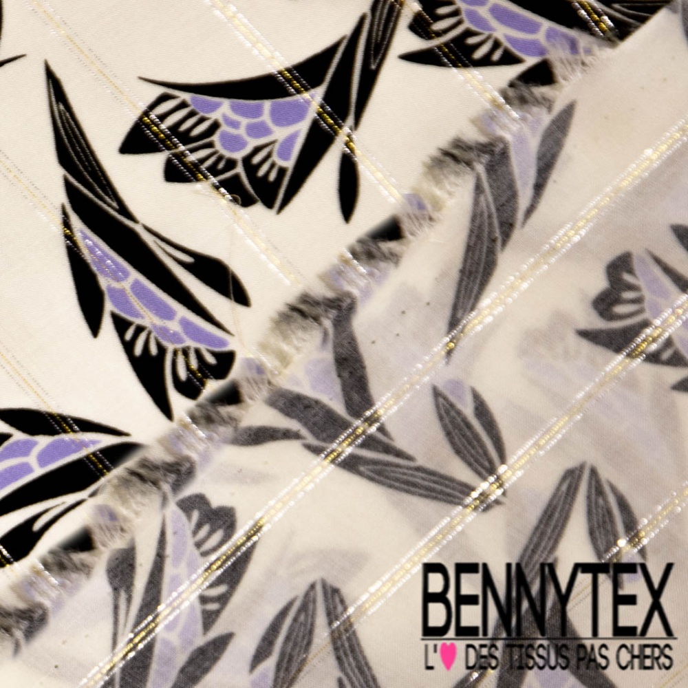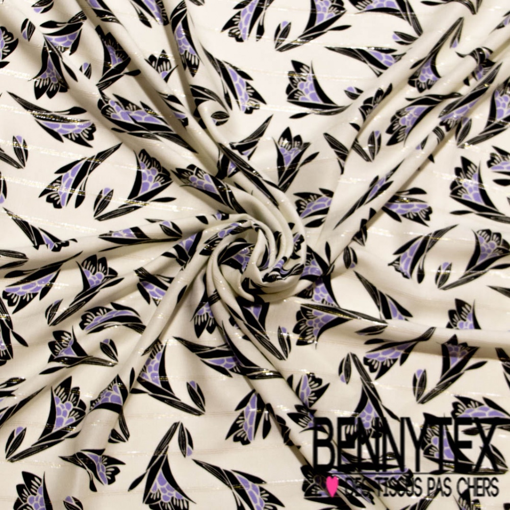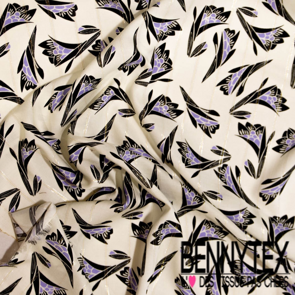 Fibranne viscose imprimé digital fleur stylisée noir lavande fine rayure lurex argent or verticale fond blanc cassé