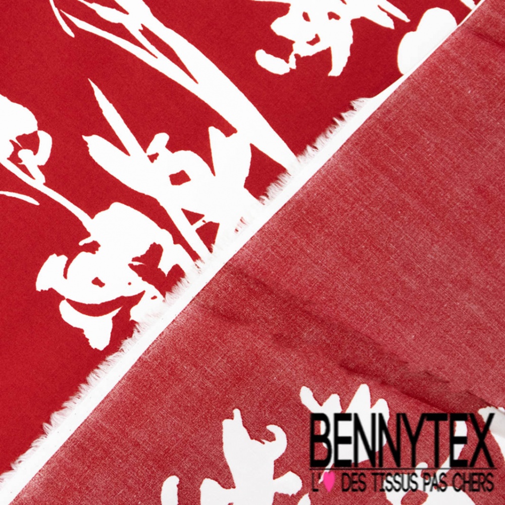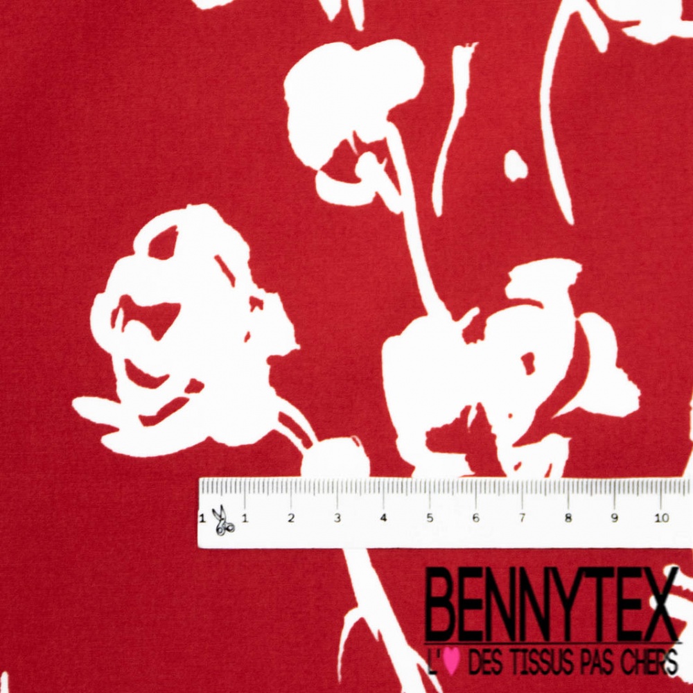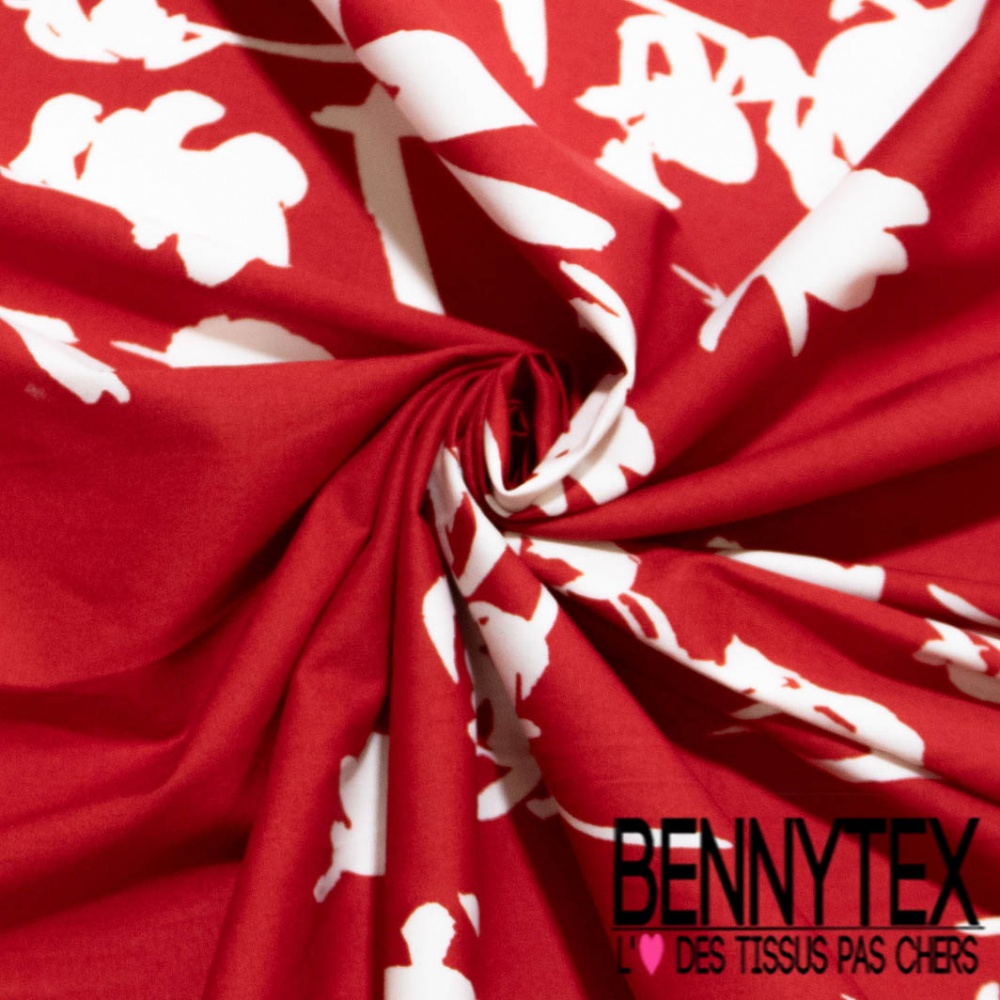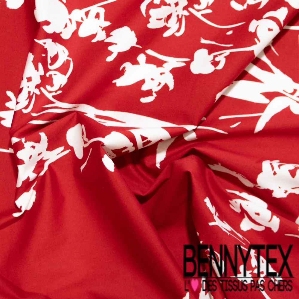 Popeline coton élasthanne digital imprimé floral japonisant blanc fond rouge cerise
