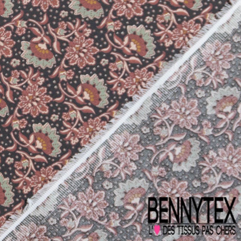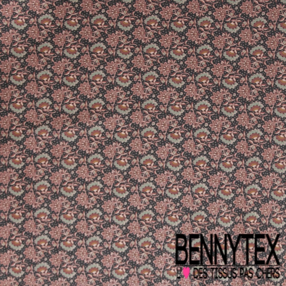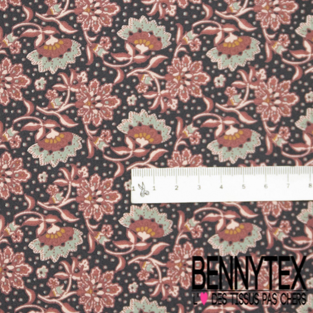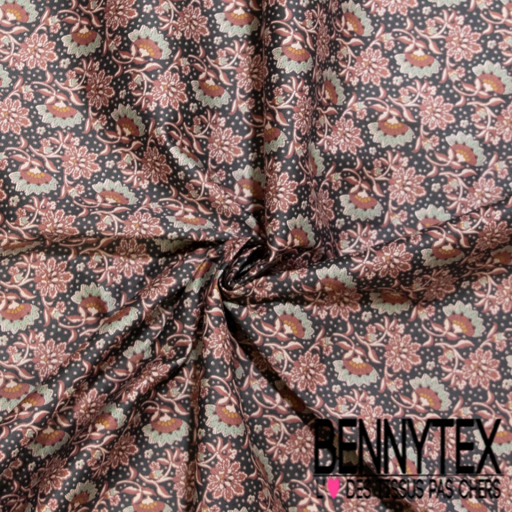 Popeline coton élasthanne digital imprimé floral cachemire amande rouille fond charbon