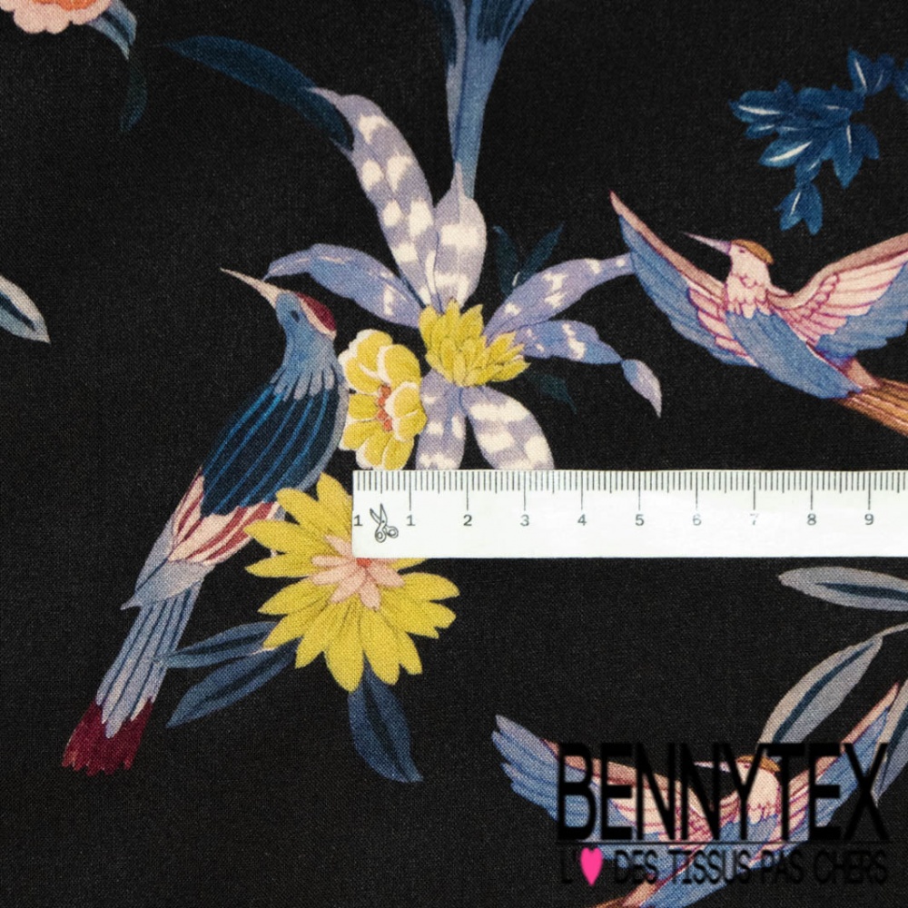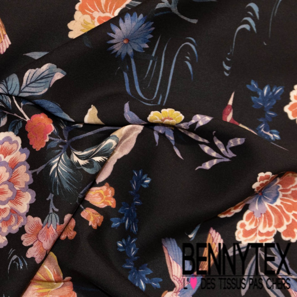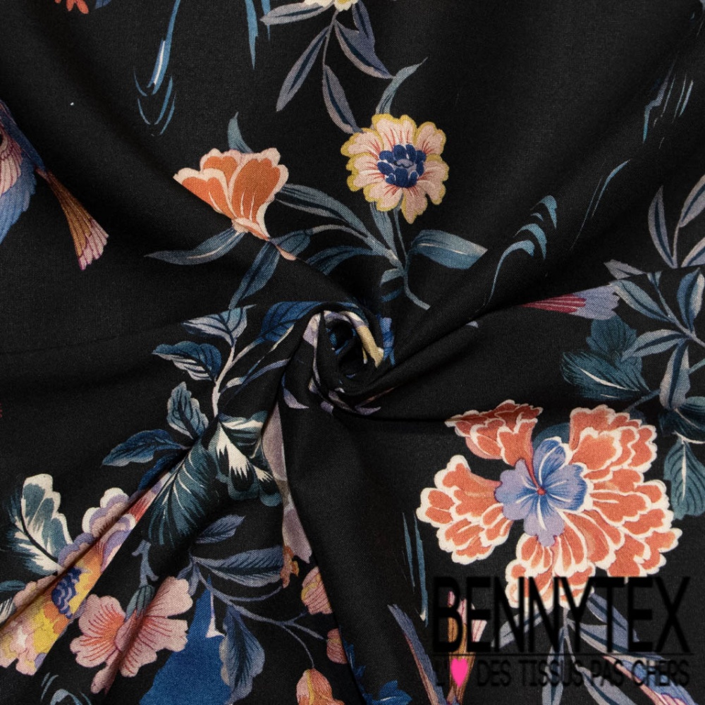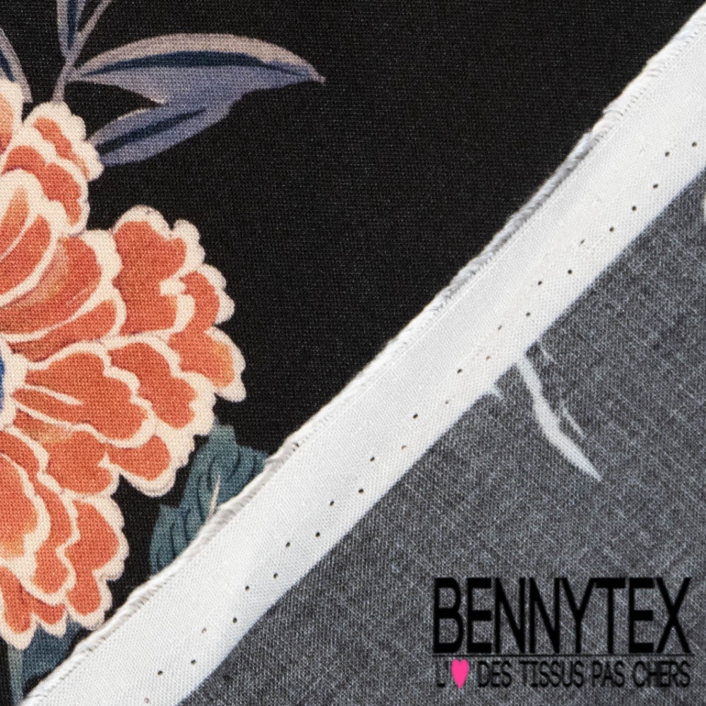 Fibranne viscose imprimé digital floral japonisant multicolore fond noir