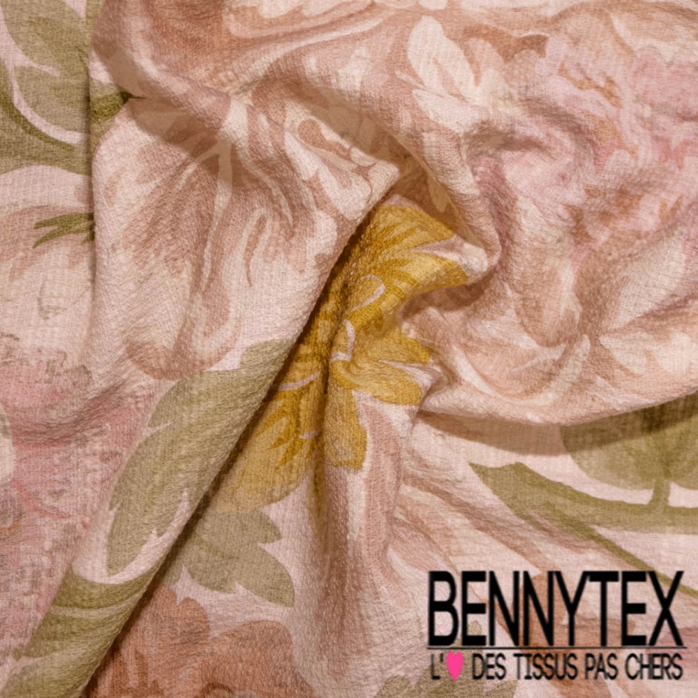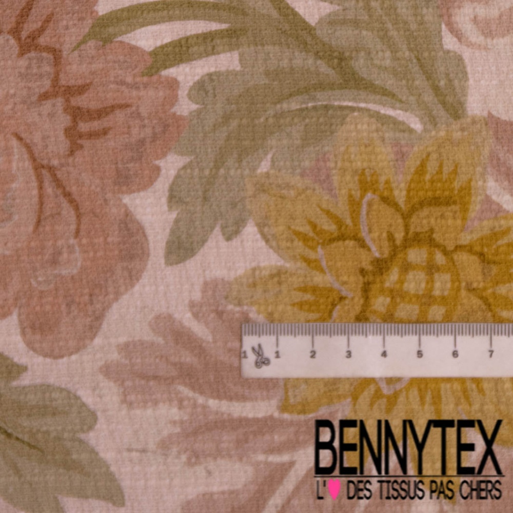 Laissez-vous tenter par notre Crêpe coton texturé élasthanne digital motif papier peint rétro floral multicolore pastel poudré ton vieux rose