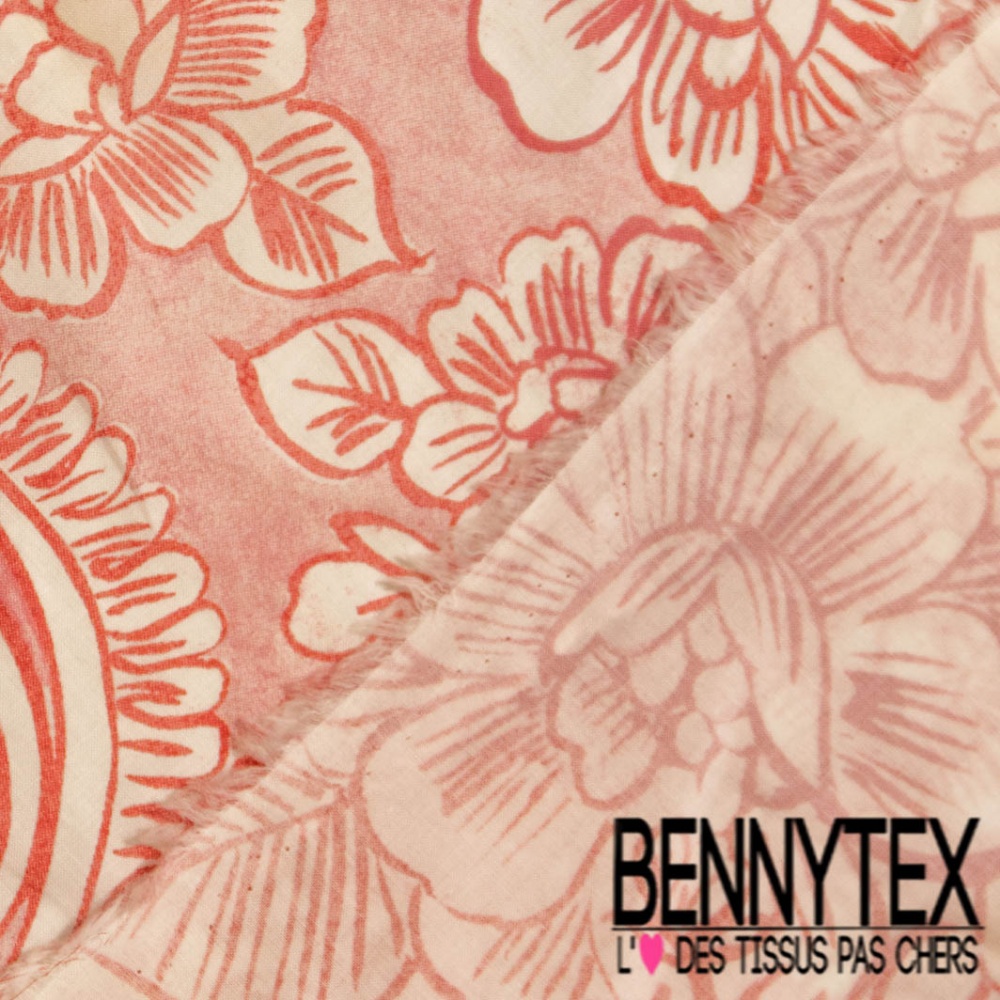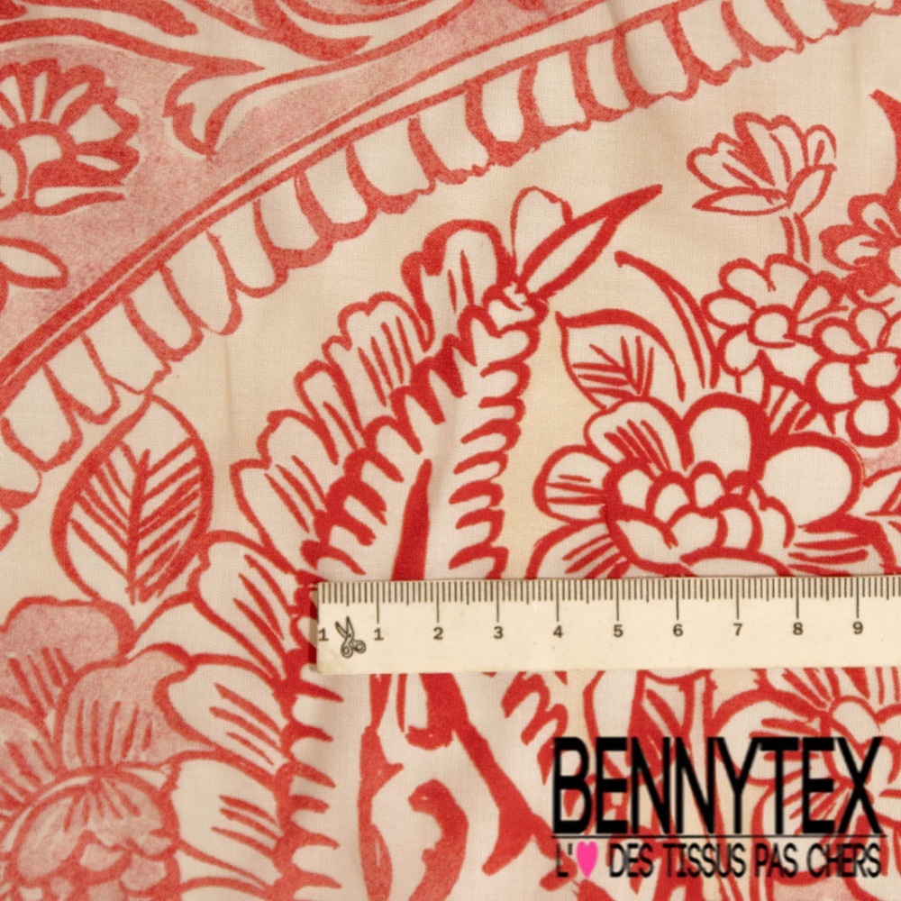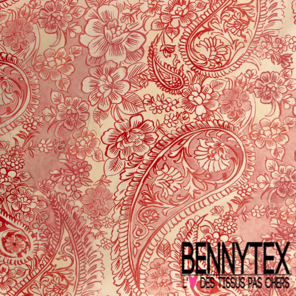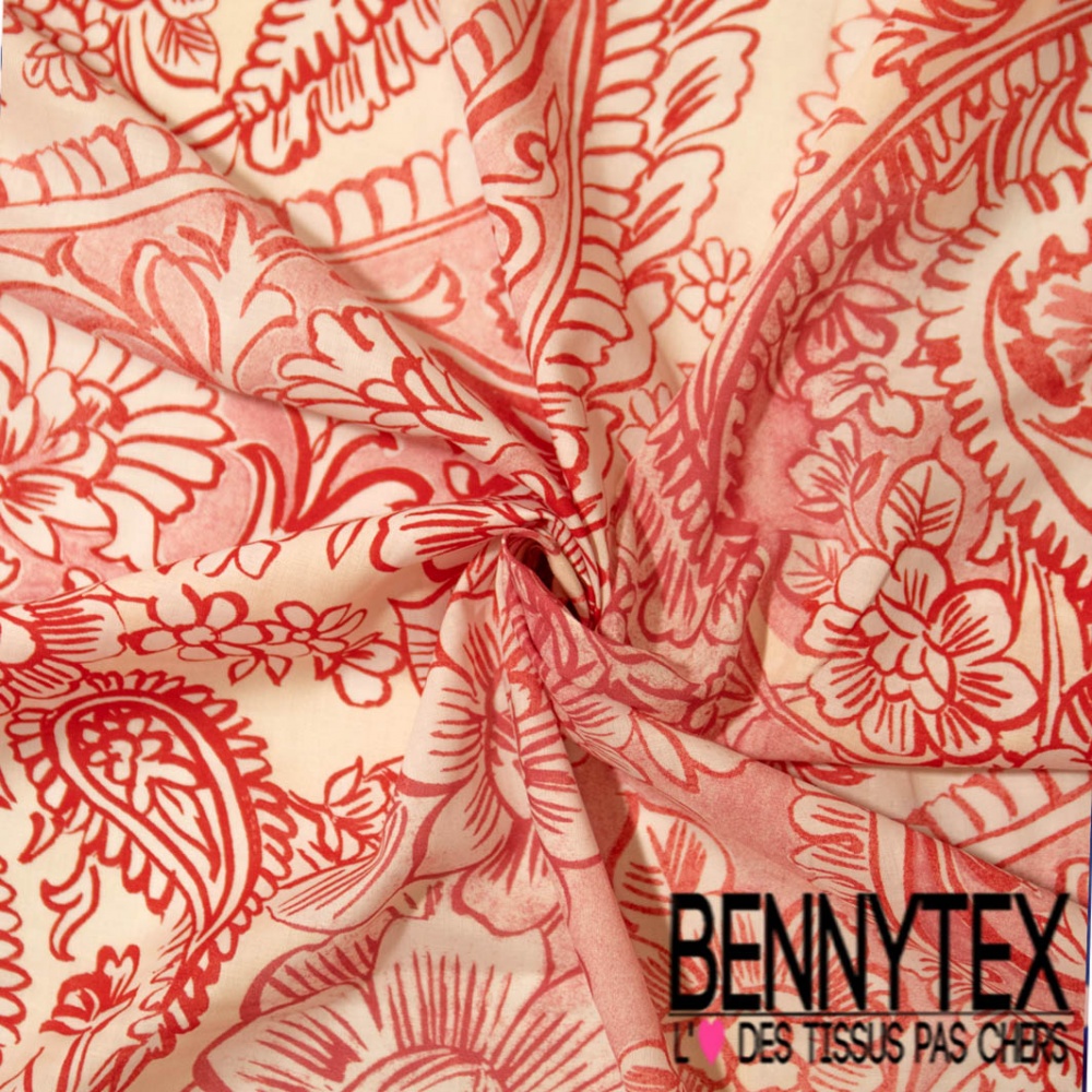 Voile de coton digital élasthanne imprimé cachemire rouge fond vanille blanc discret