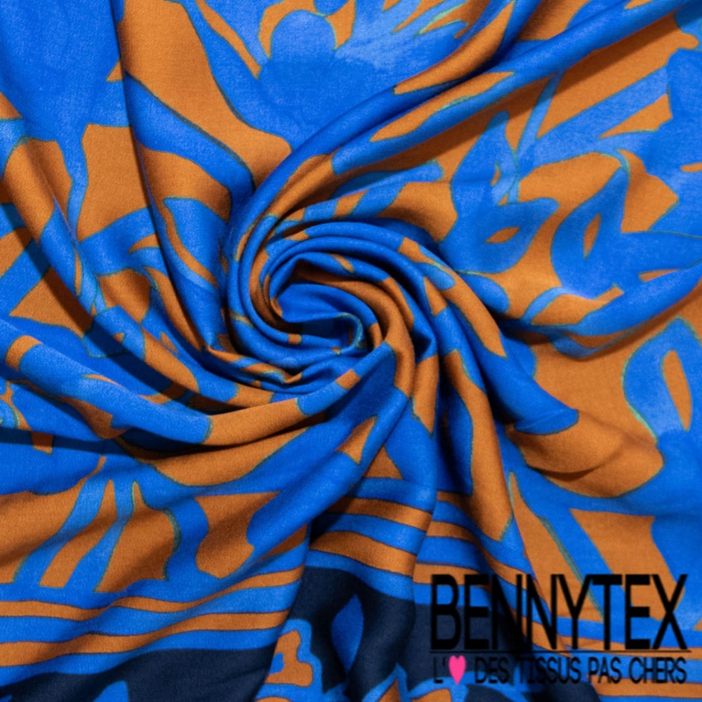 Fibranne viscose satinée imprimé digital simple base grande fleur au trait bleu vif fond cannelle