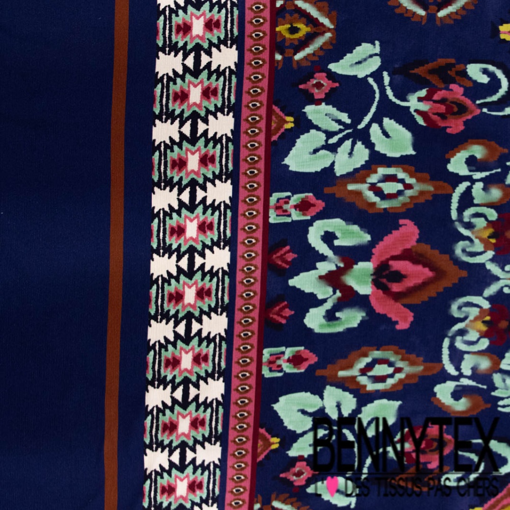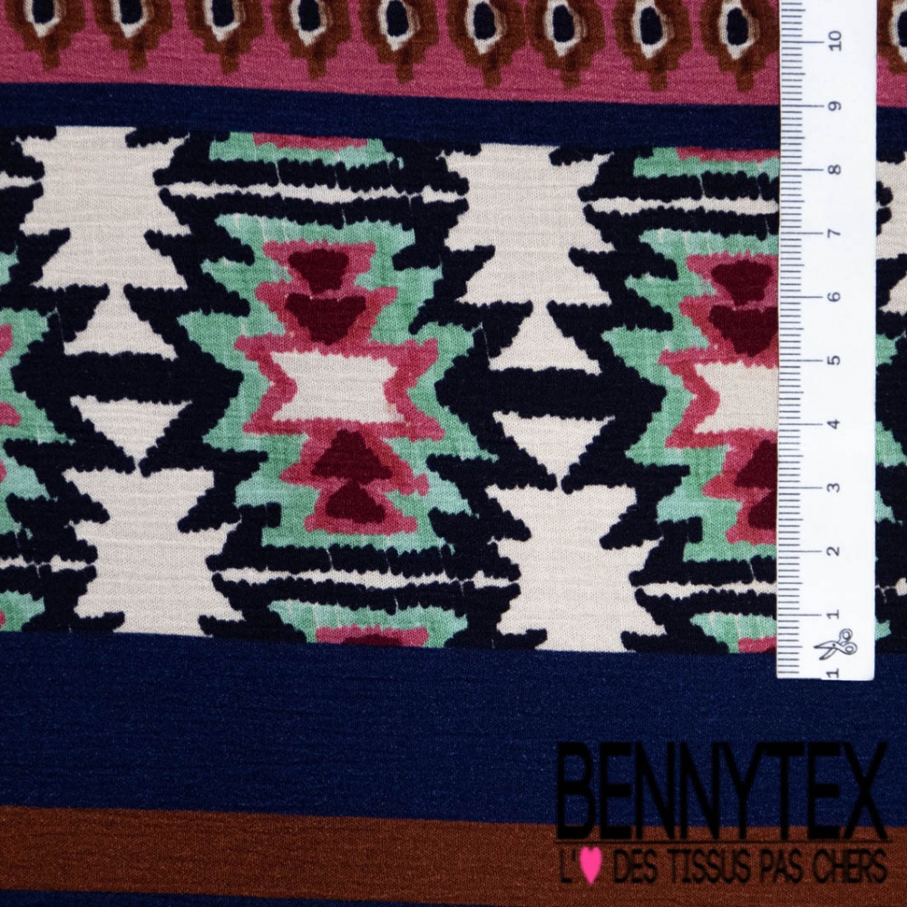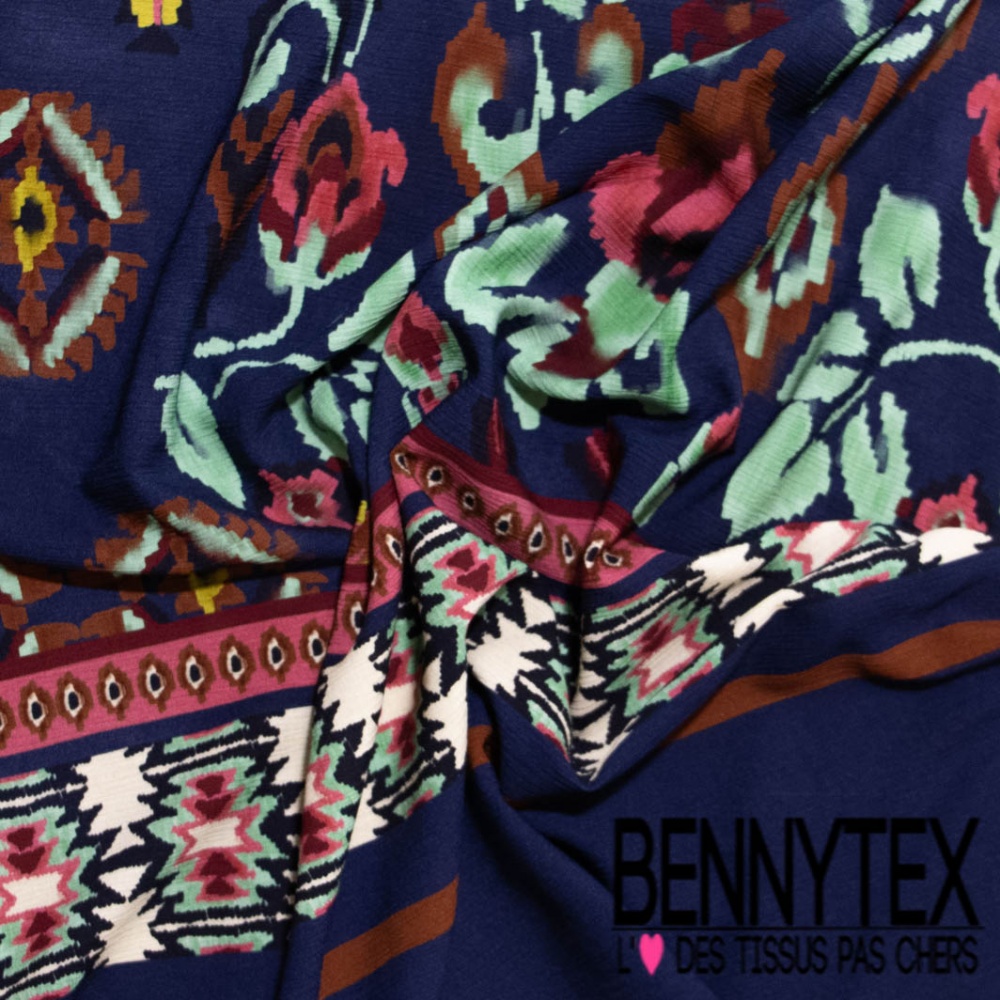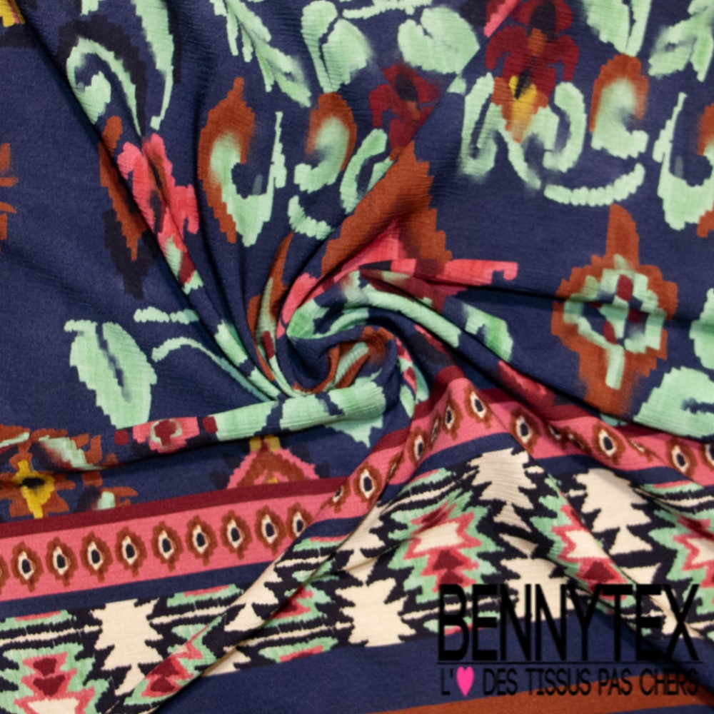 Le Crêpe viscose froissé digital double base motif amérindien fond marine est un tissu donnant un superbe tombé, idéale pour pantalon fluide, chemisiers, robe, jupe...