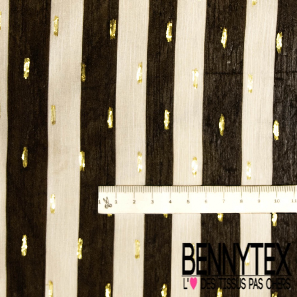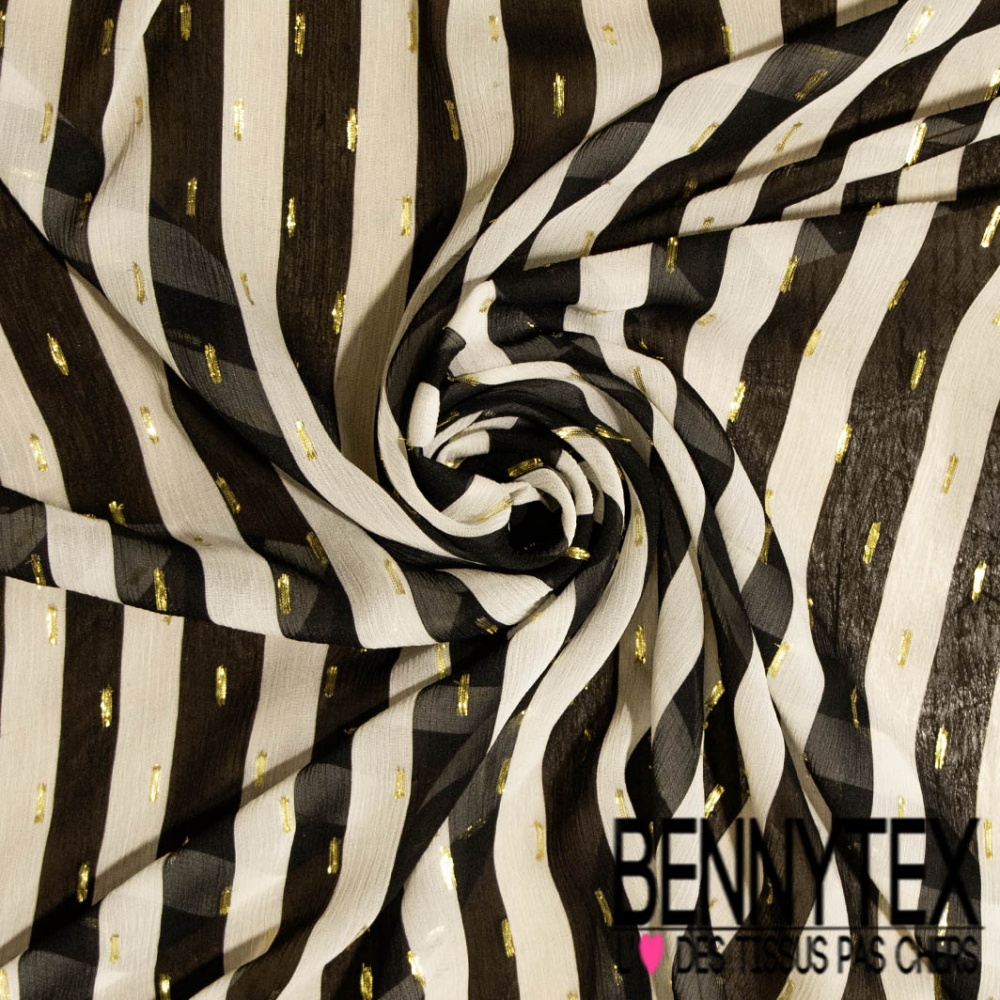 Mousseline crêpon viscose imprimé digital rayure noir blanc cassé verticale rectangle lurex or