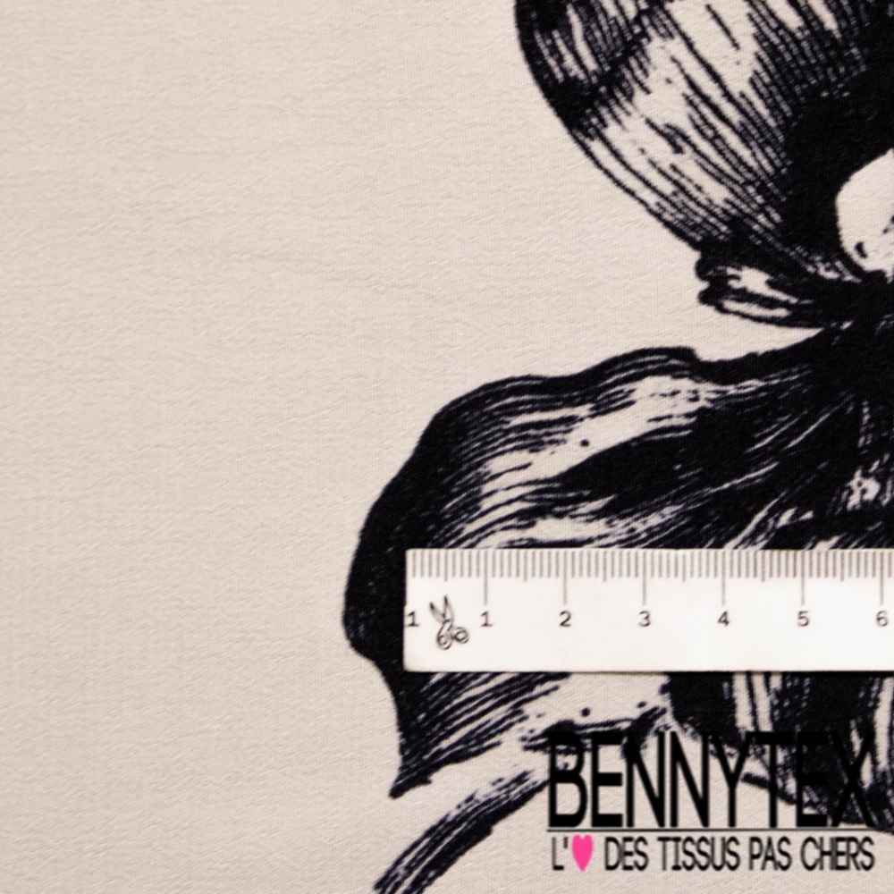 Le Crêpe viscose motif grande fleur bleu nuit fond mastique est un tissu donnant un superbe tombé, idéale pour pantalon fluide, chemisiers, robe, jupe...