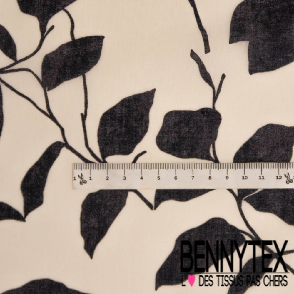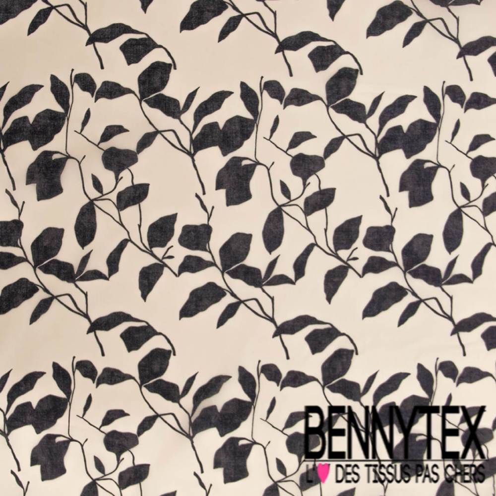 Voile de coton digital élasthanne imprimé feuille noir fond écru