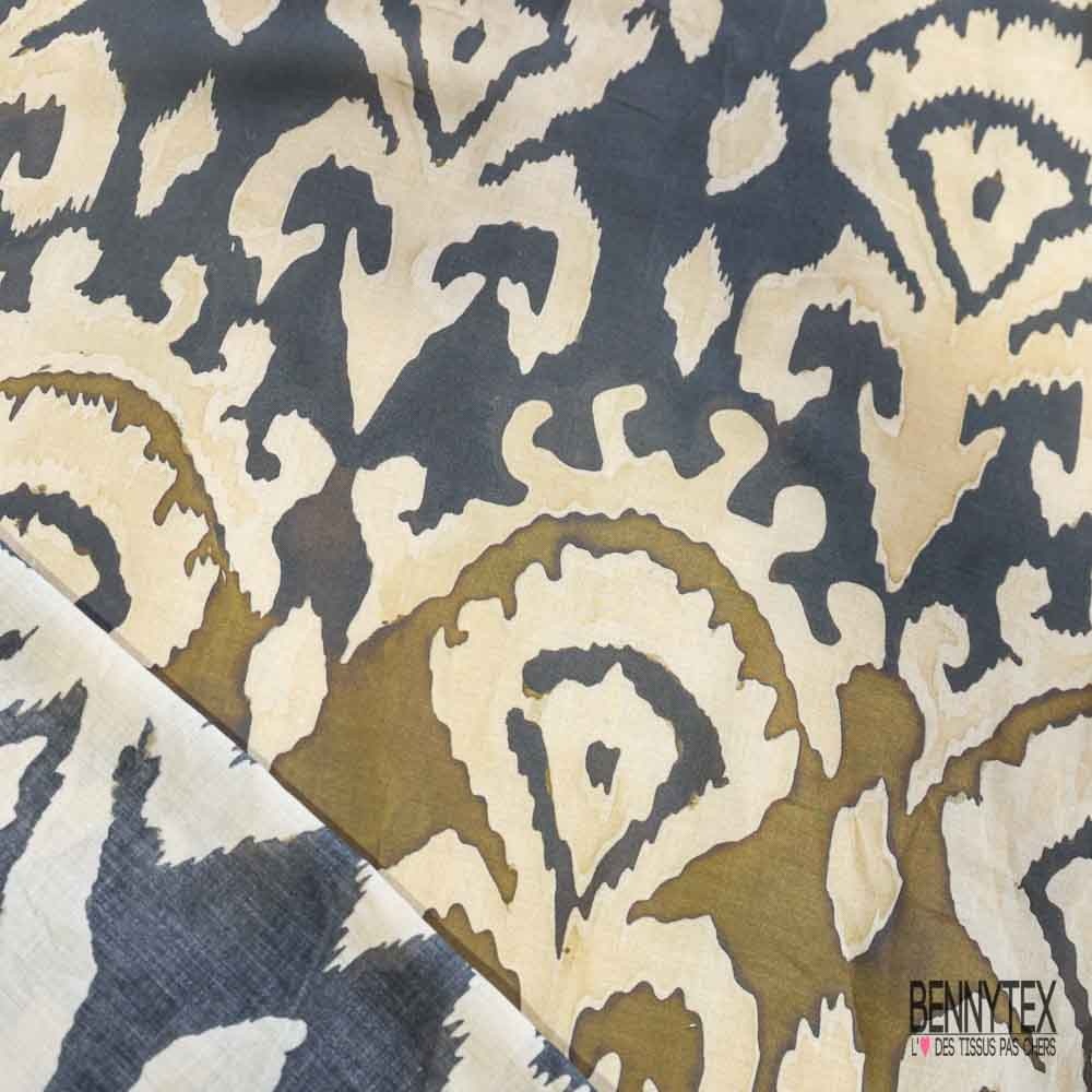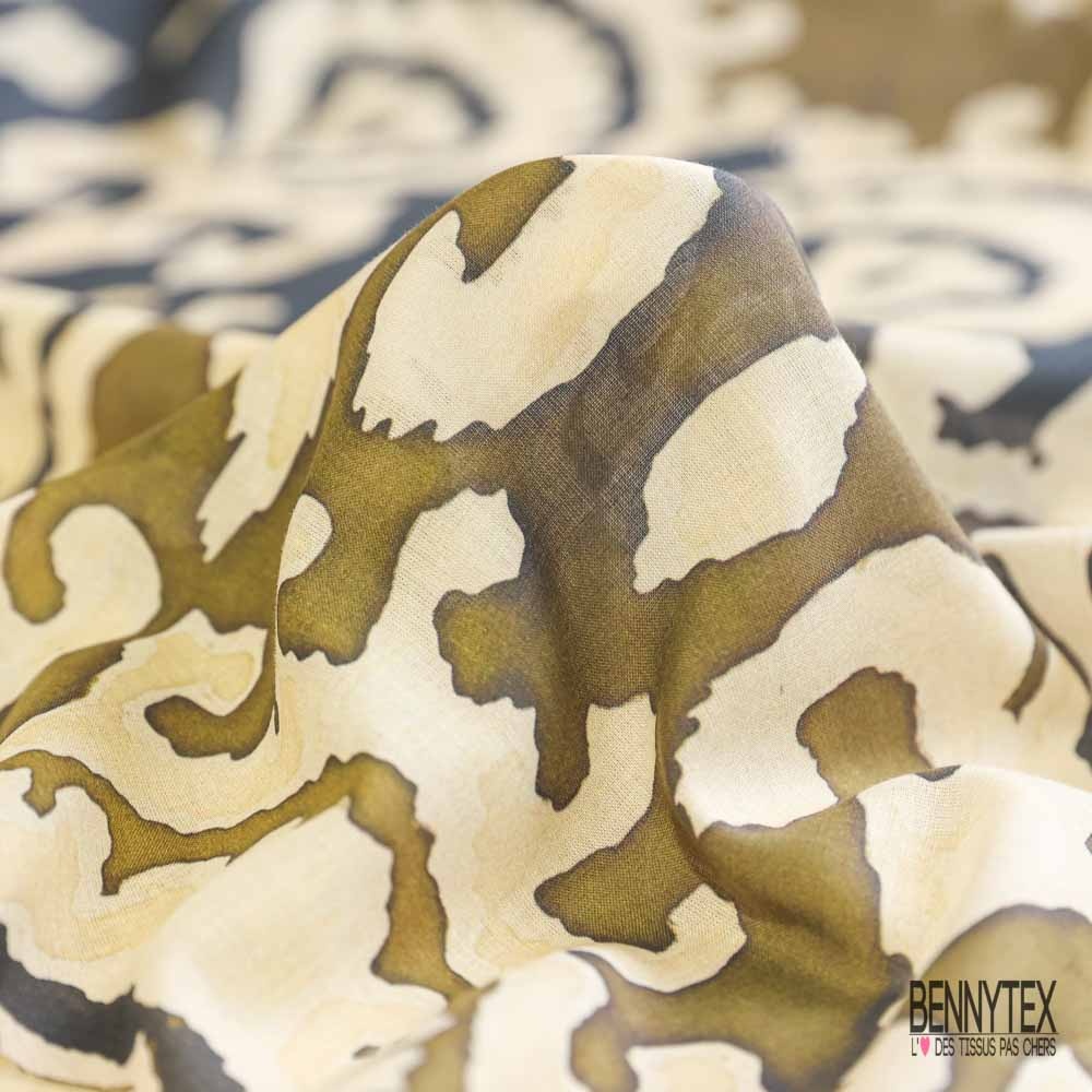 Voile de coton digital élasthanne imprimé baroque stylisé kaki noir vanille