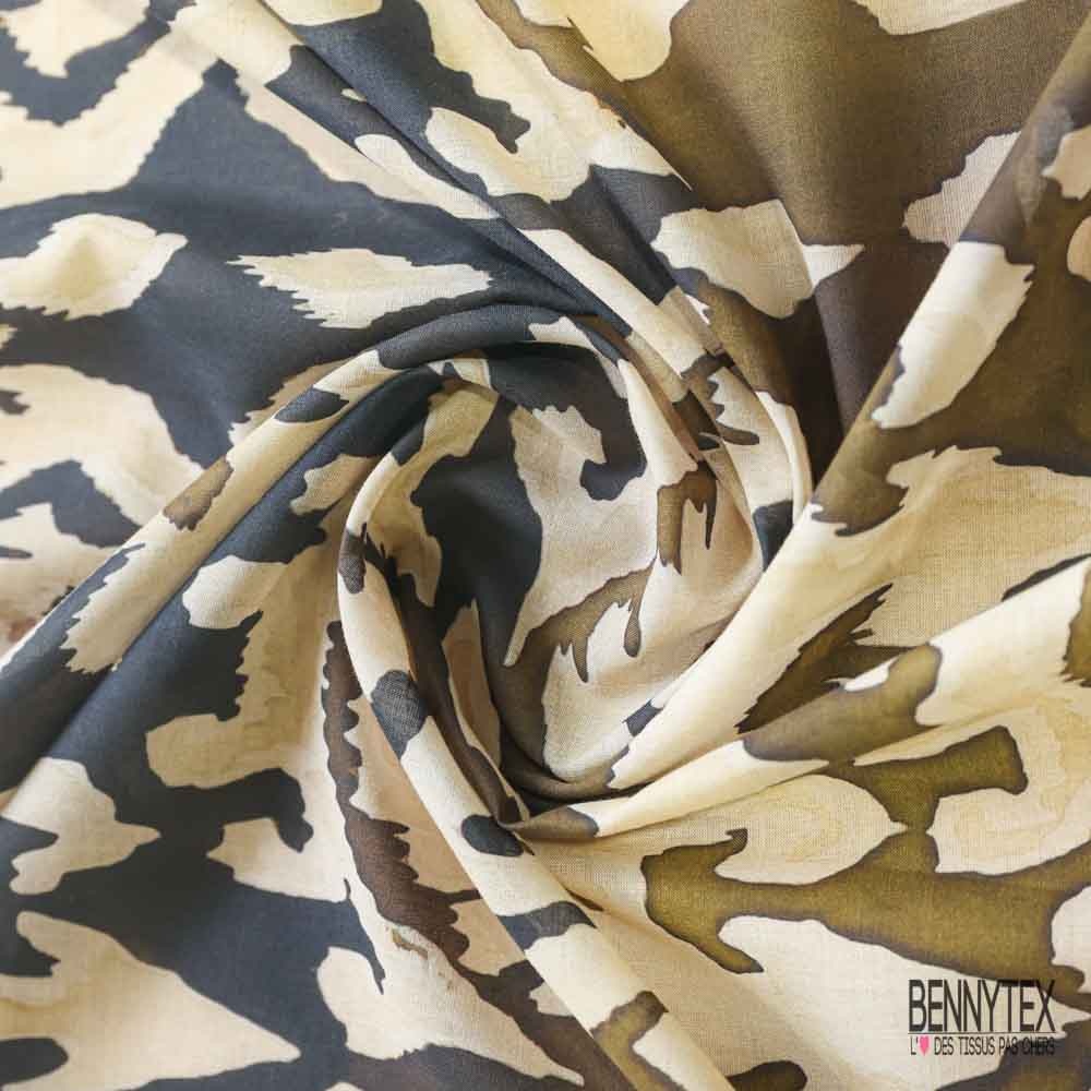 Voile de coton digital élasthanne imprimé baroque stylisé kaki noir vanille