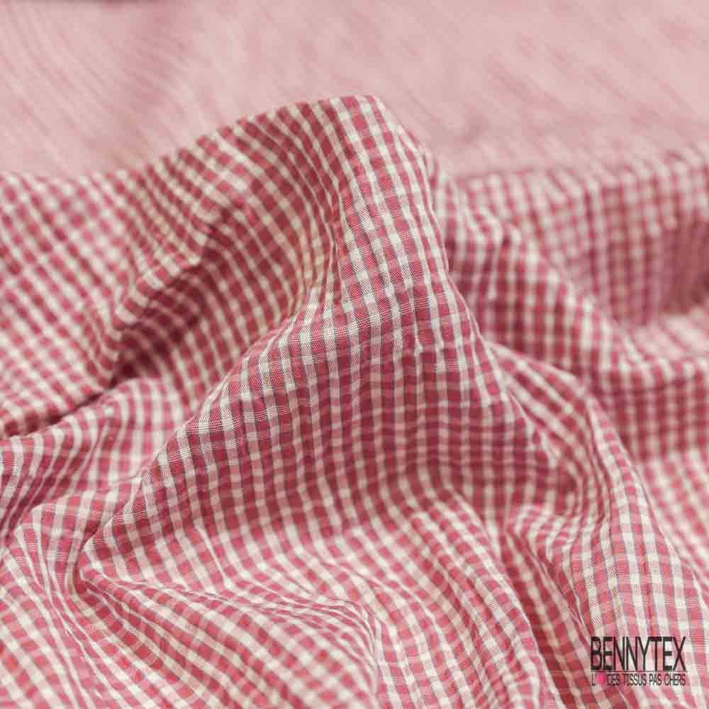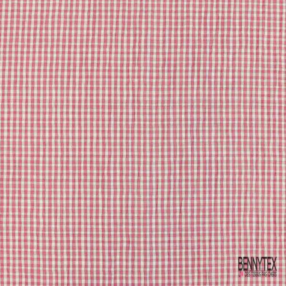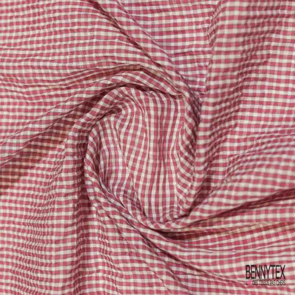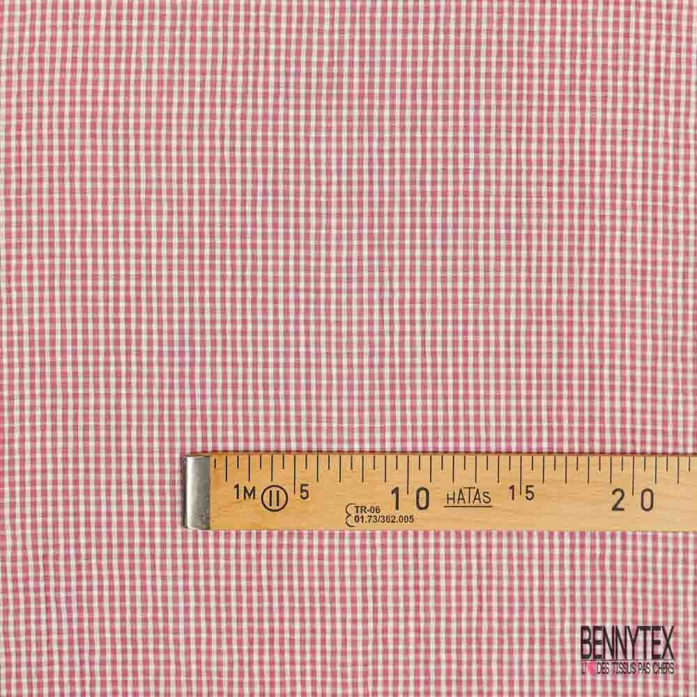 Coton seersucker motif petit vichy blanc discret framboise écrasée contour bleu lavande