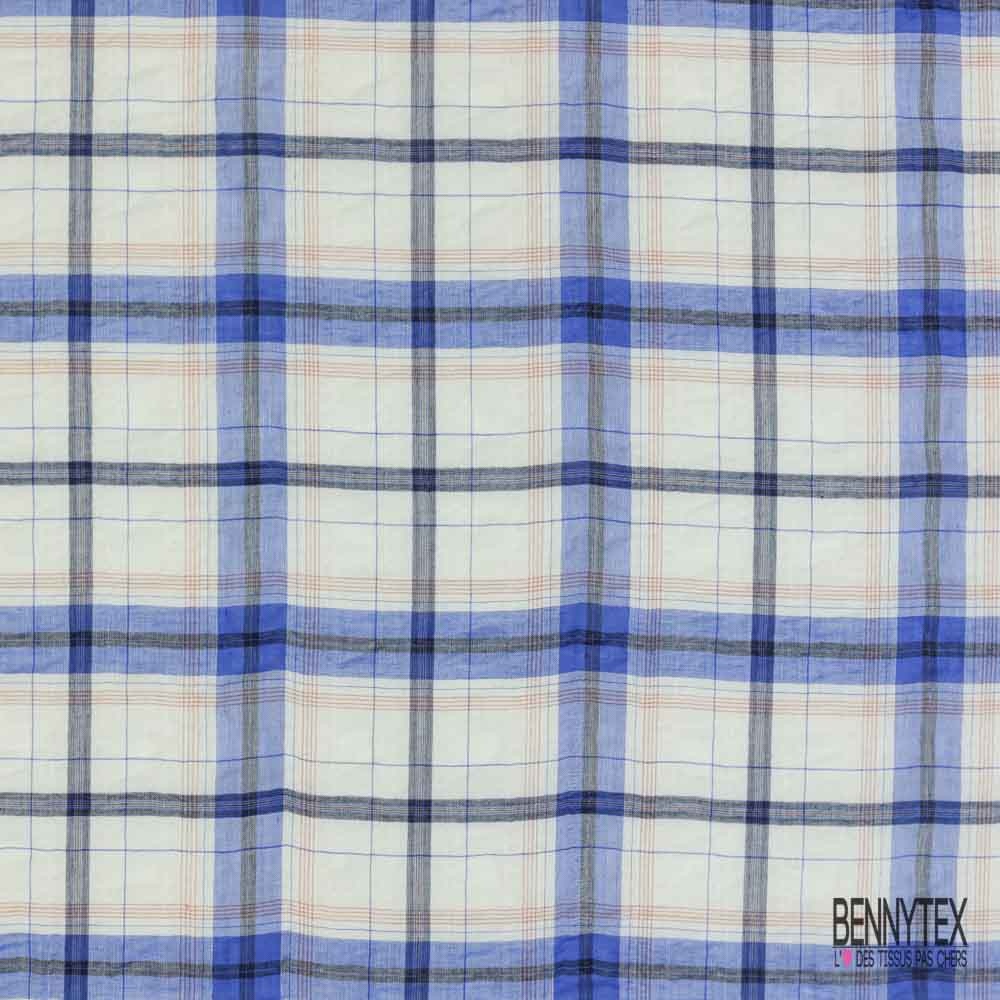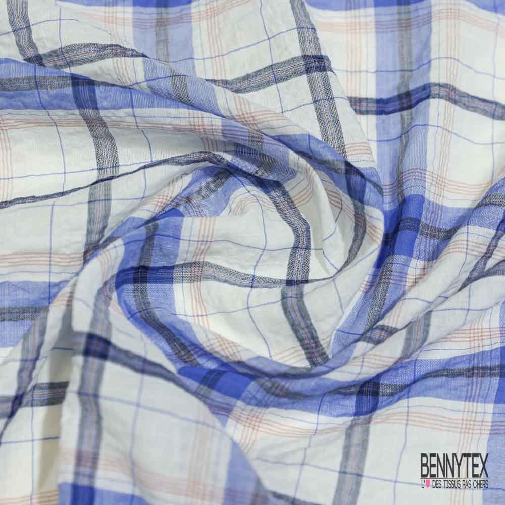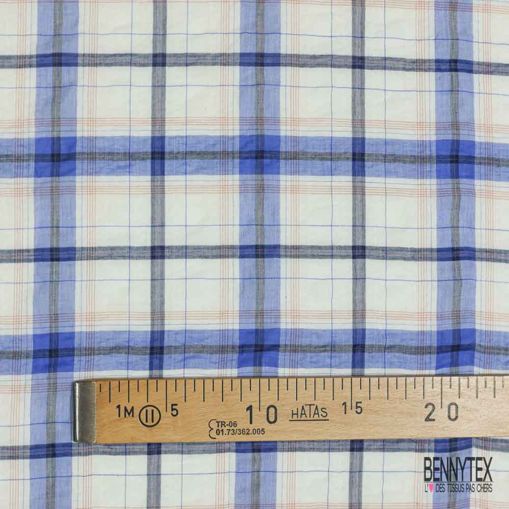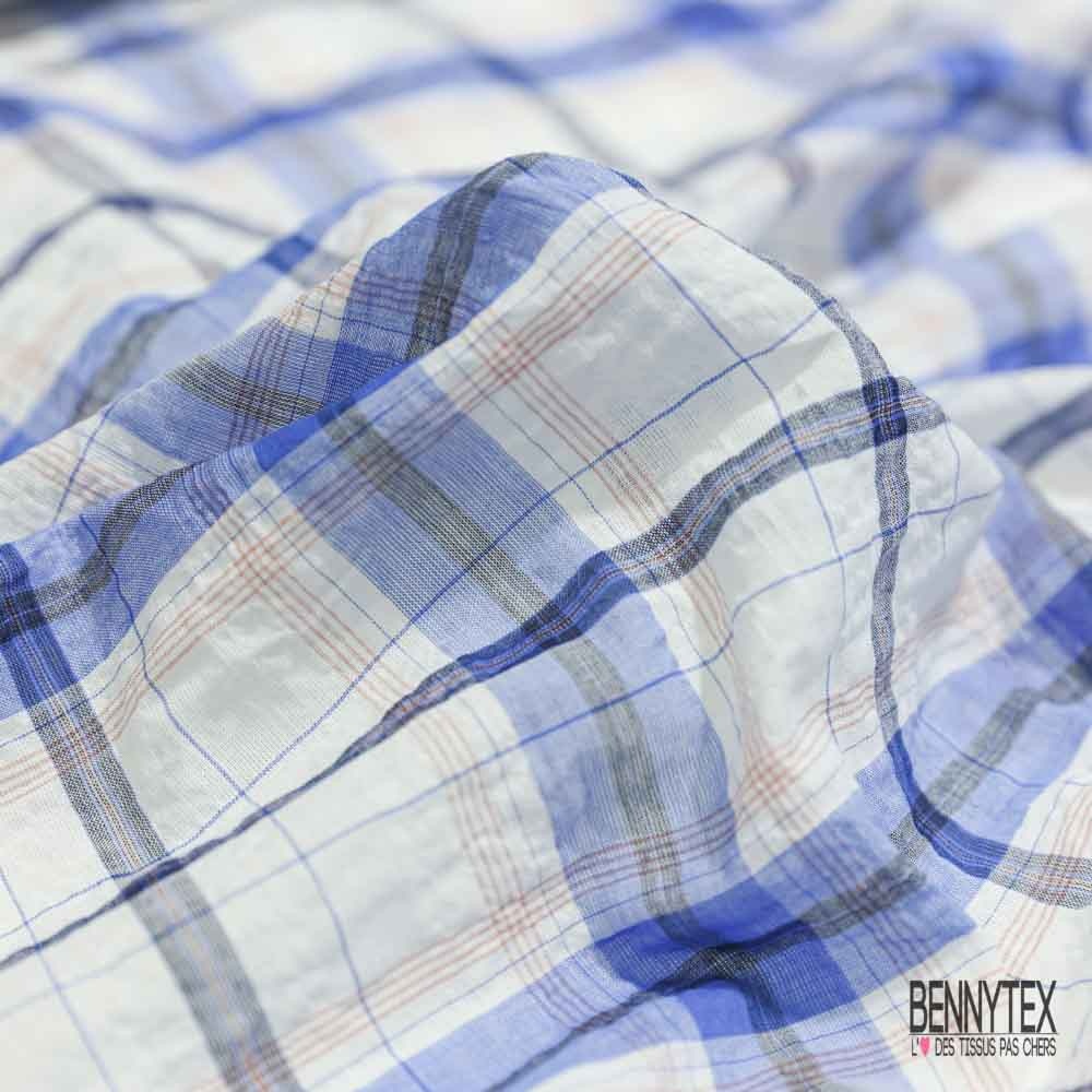 Coton seersucker motif grand quadrillage bleu ocre noir fond blanc optique