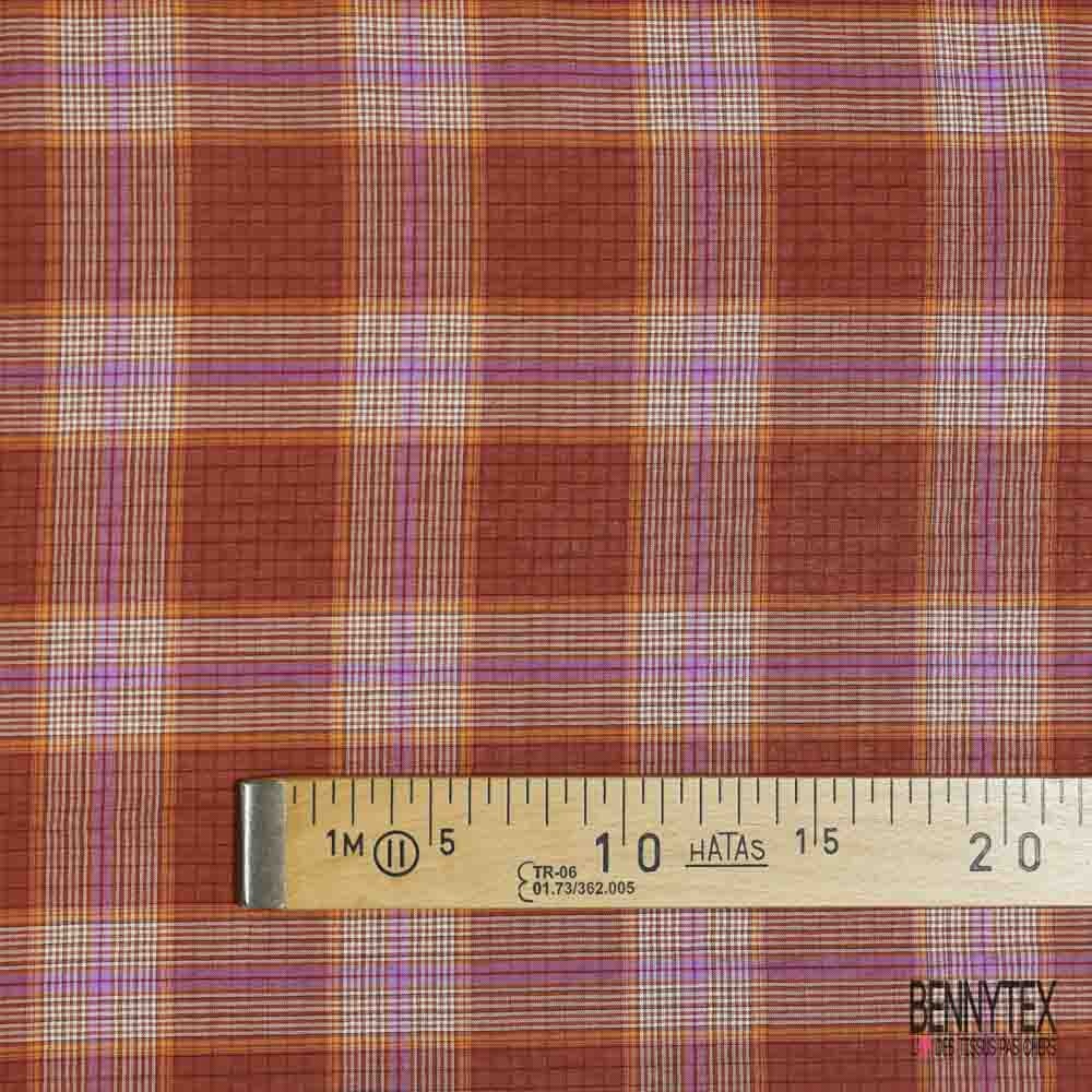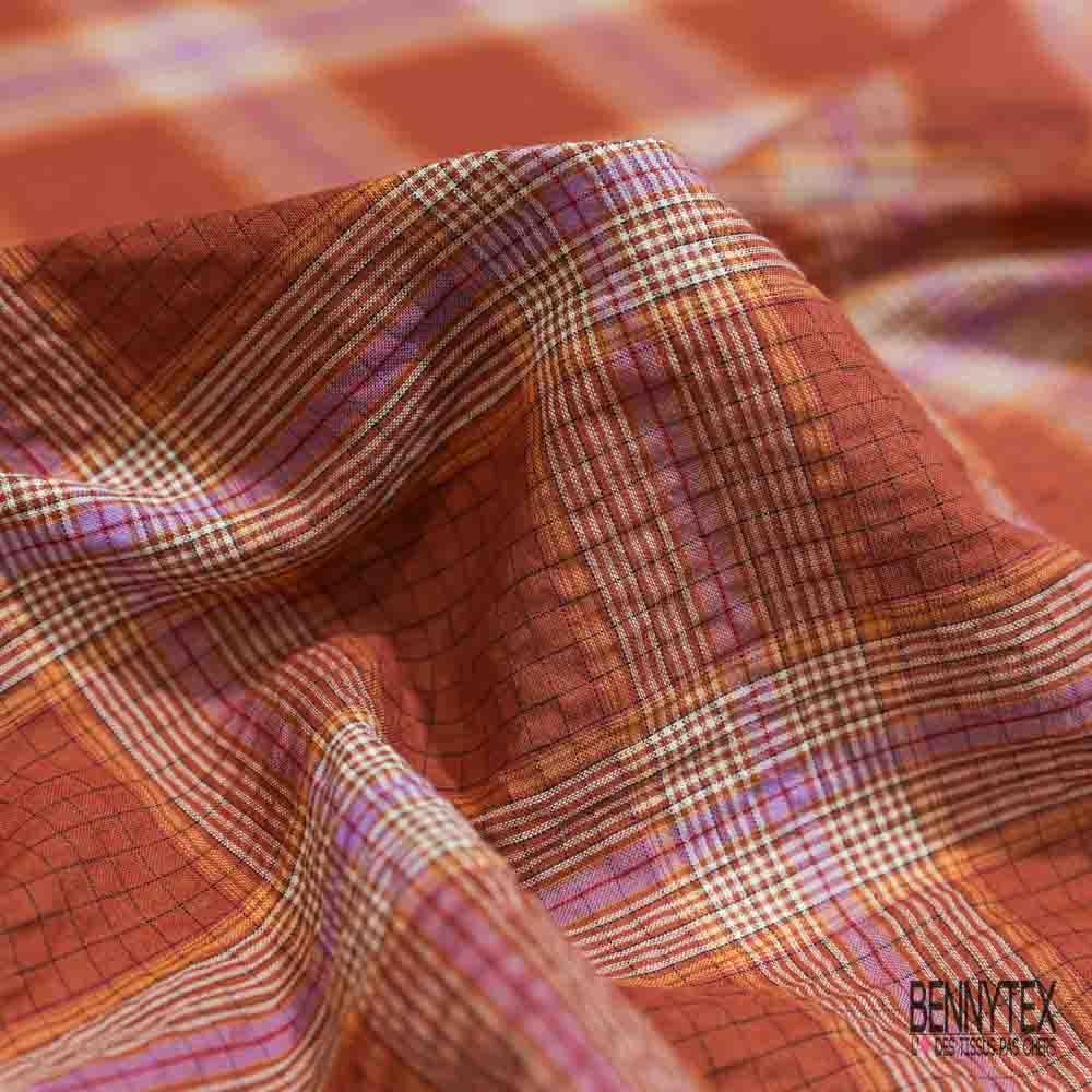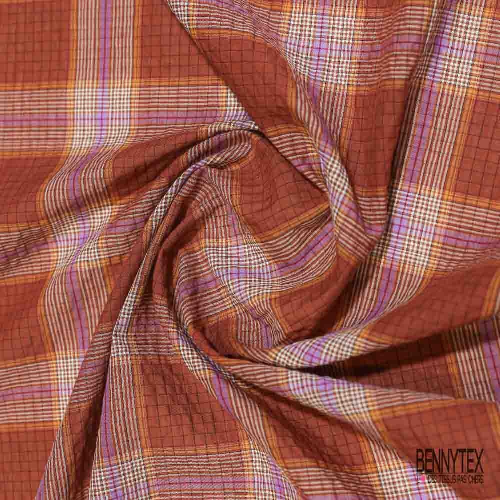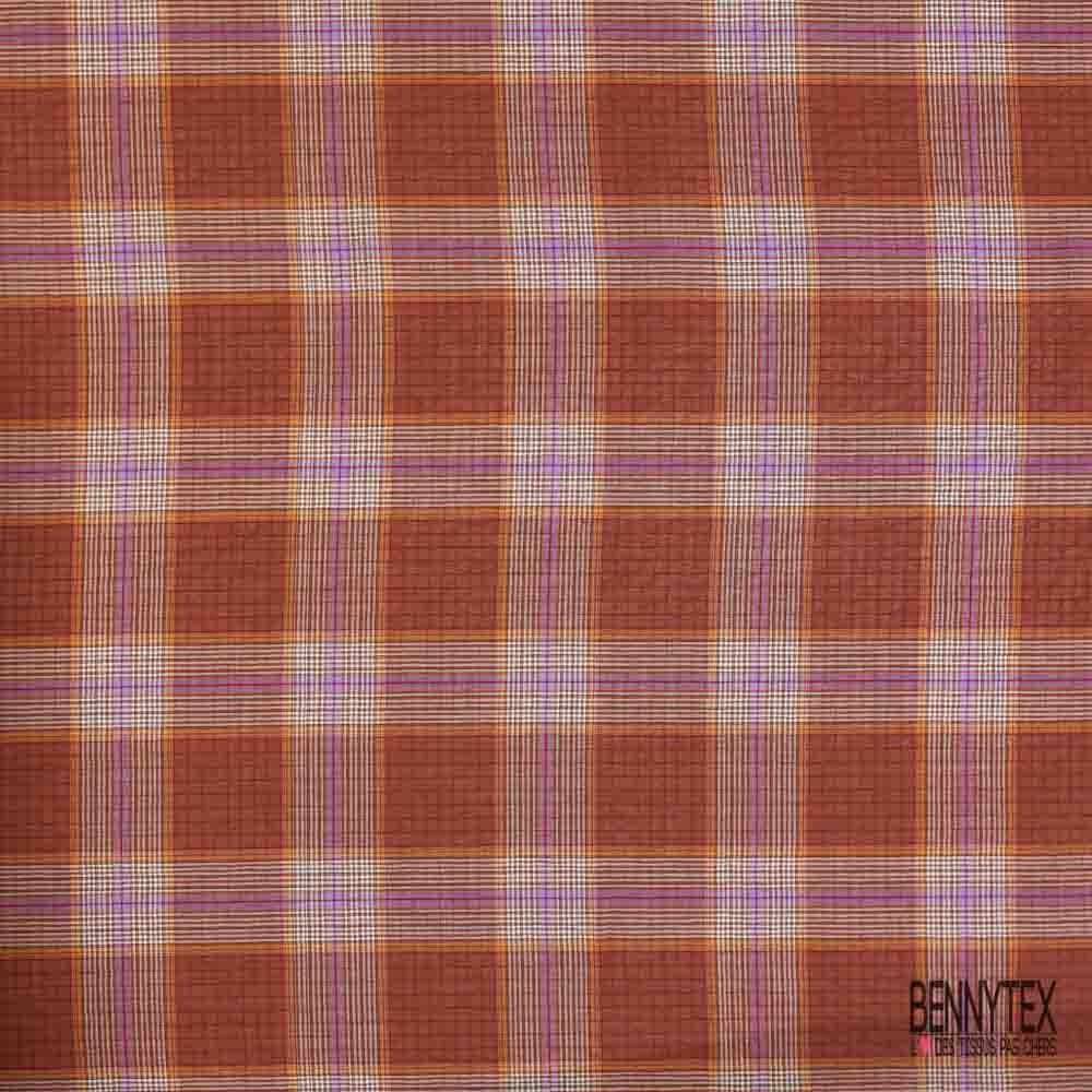 Coton seersucker motif quadrillage brique violine blanc optique orange