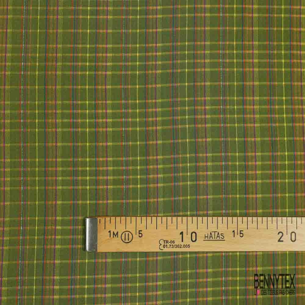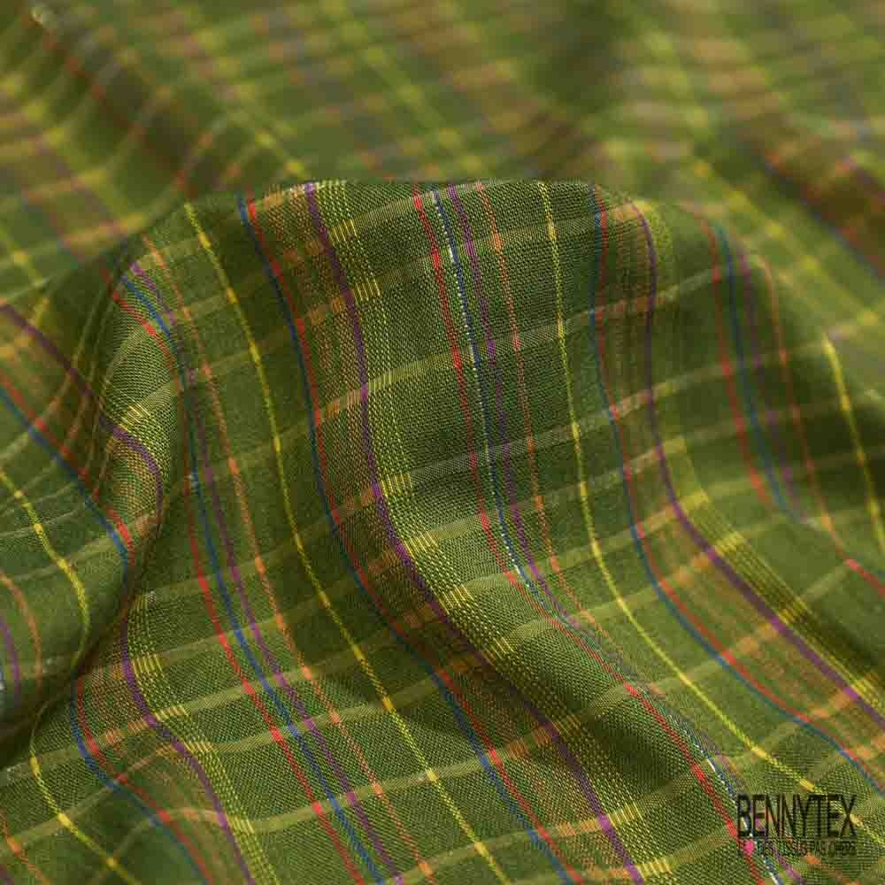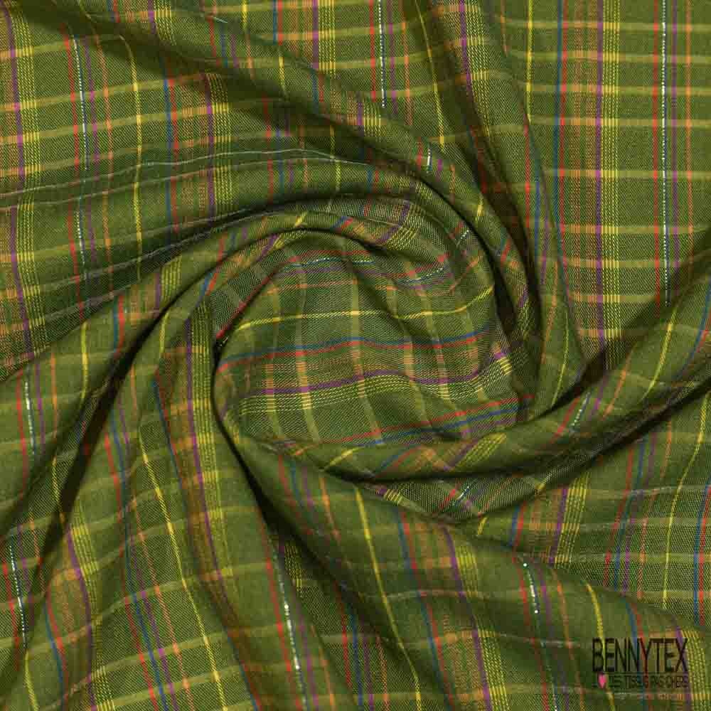 Coton gaufré motif carreau fantaisie multicolore fond olive lurex argent